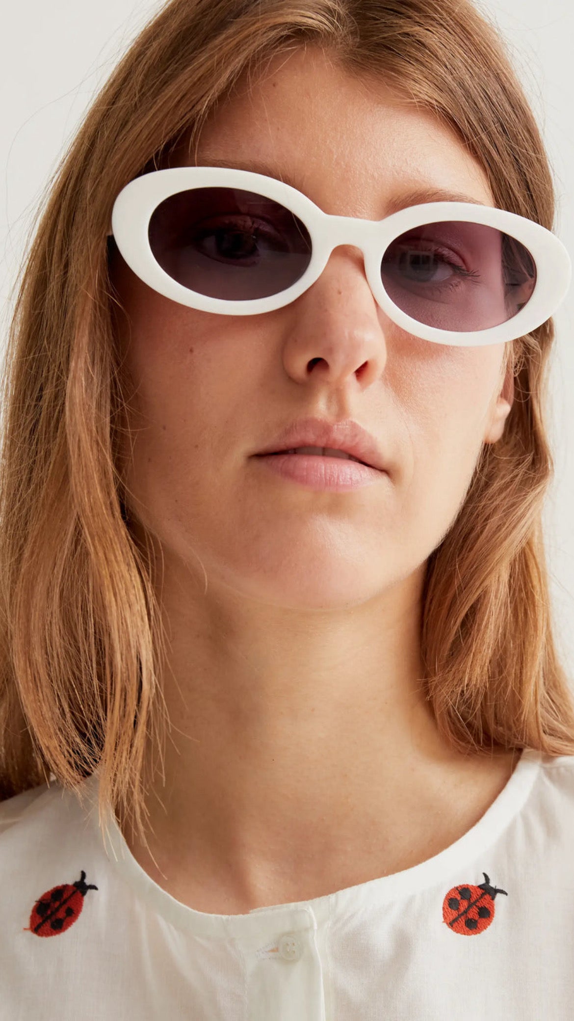 Camisa blanca de mujer confeccionada en tejido 100% algodón con estampado ladybugs bordado. Diseño de cuello redondo y manga larga ligeramente abullonada que aporta volumen sutil y femenino. Cierre frontal con botones blancos integrados para un acabado limpio y minimalista. Tejido ligero, transpirable y agradable al tacto. La modelo mide 177 cm y lleva la talla S.