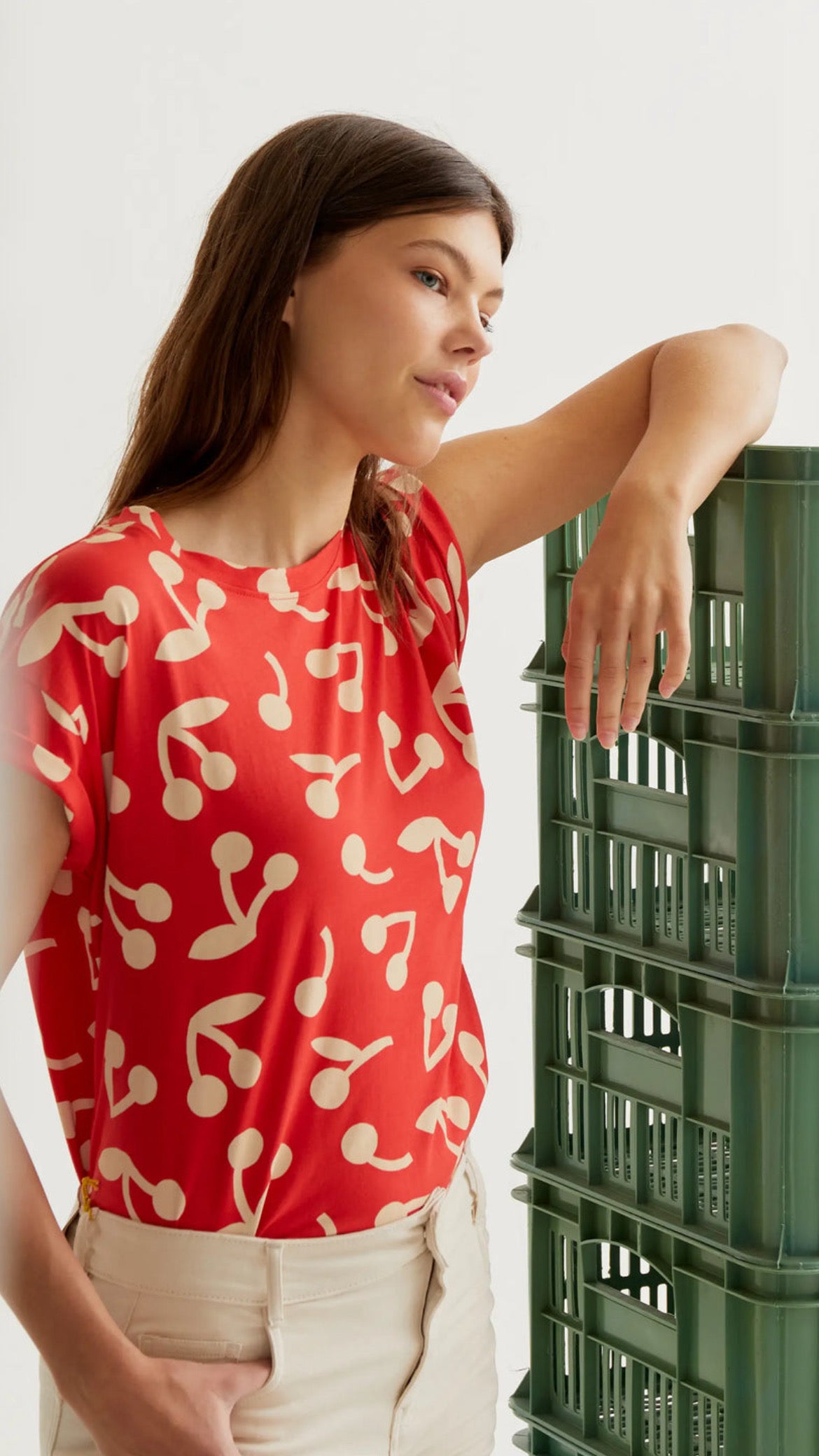 🍒 Camiseta de tejido 100% algodón con divertido estampado red guinda sobre fondo rojo, una propuesta alegre y llena de personalidad para tus looks diarios.