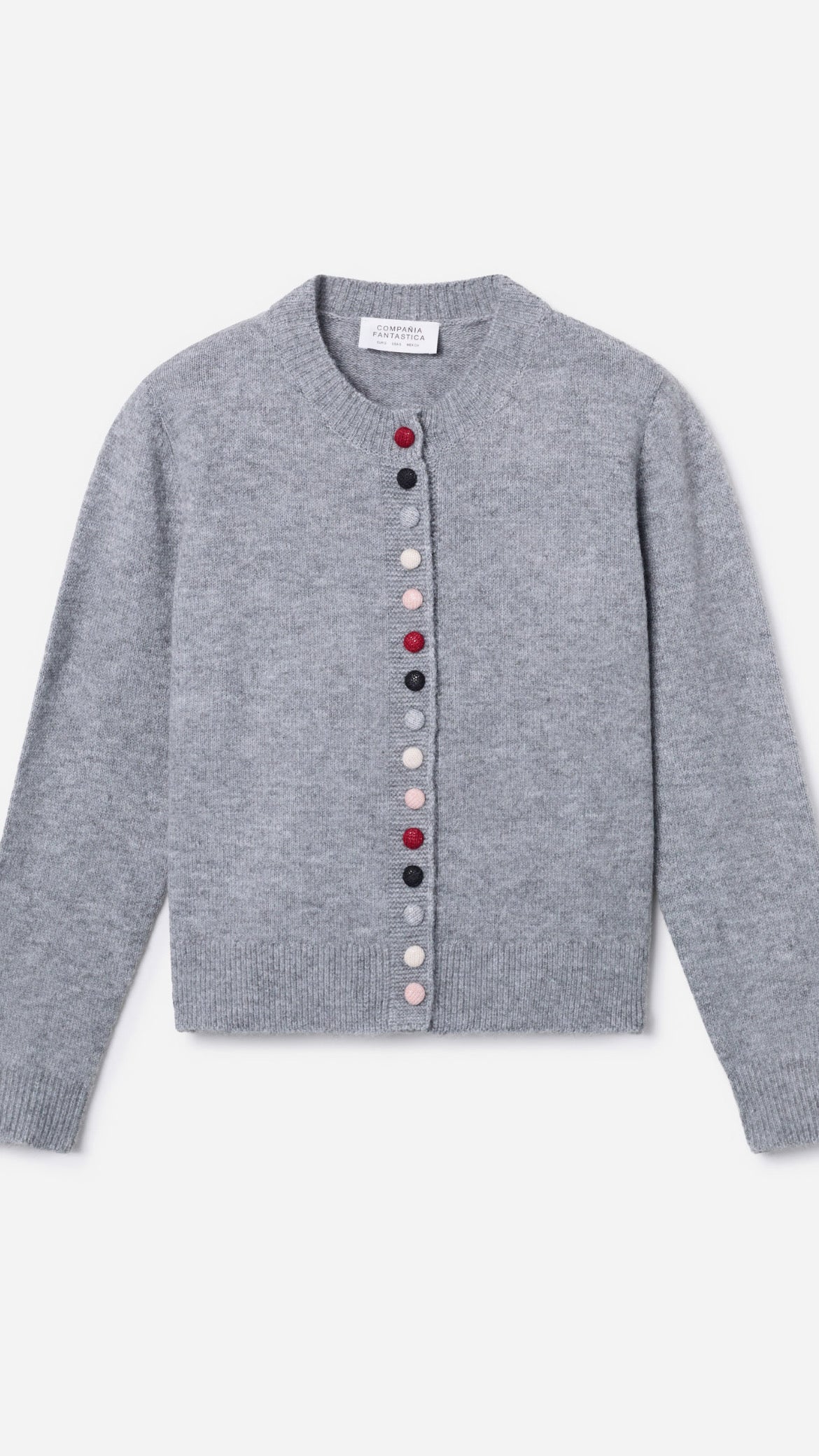 Cárdigan de punto en tono beige, con cierre de originales botones multicolores que aportan un toque divertido y único. Un básico diferente, cómodo y versátil, perfecto para combinar con pantalones, faldas o vestidos.
