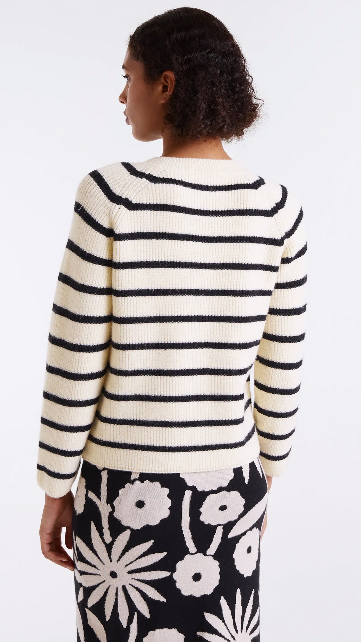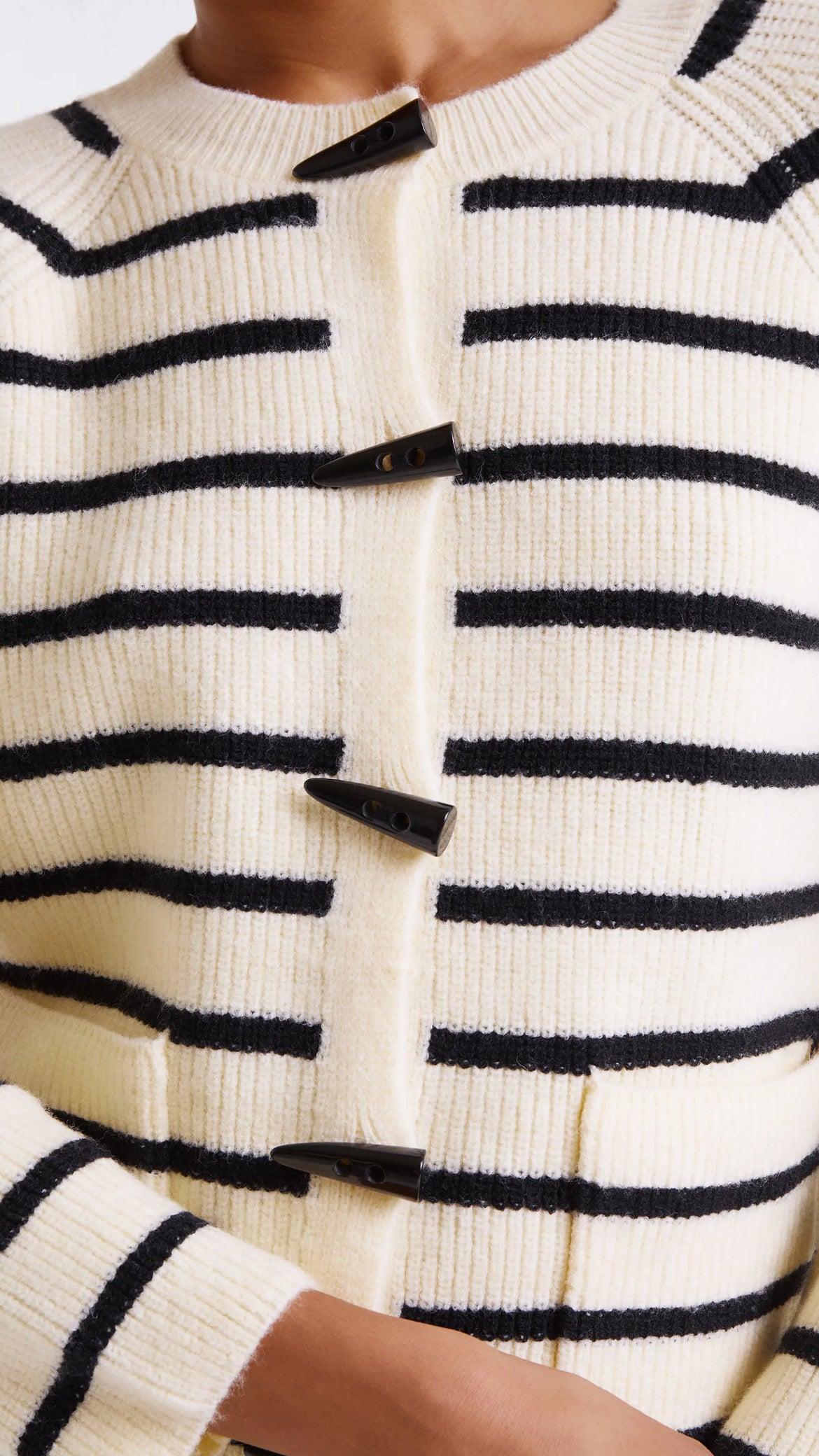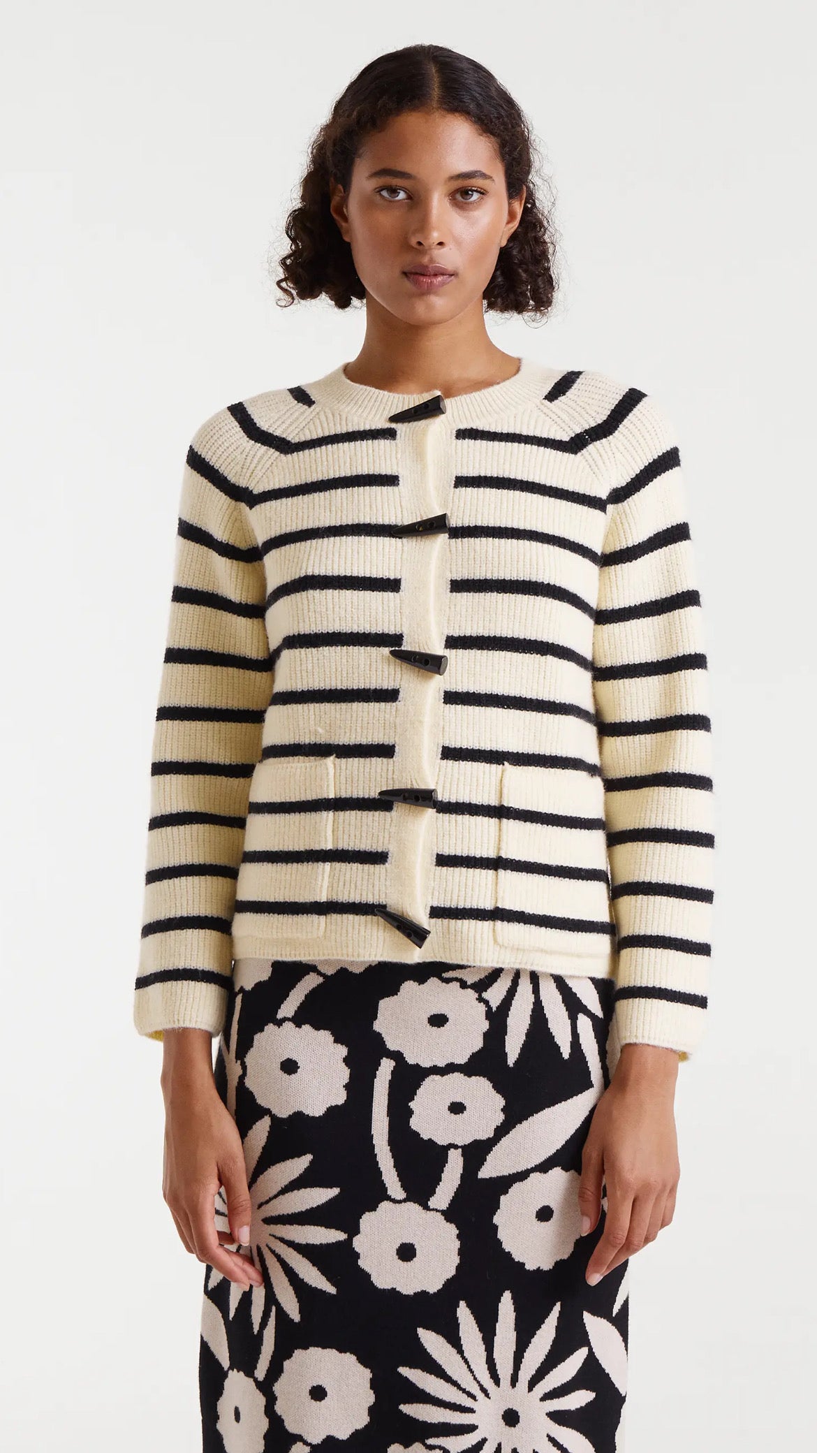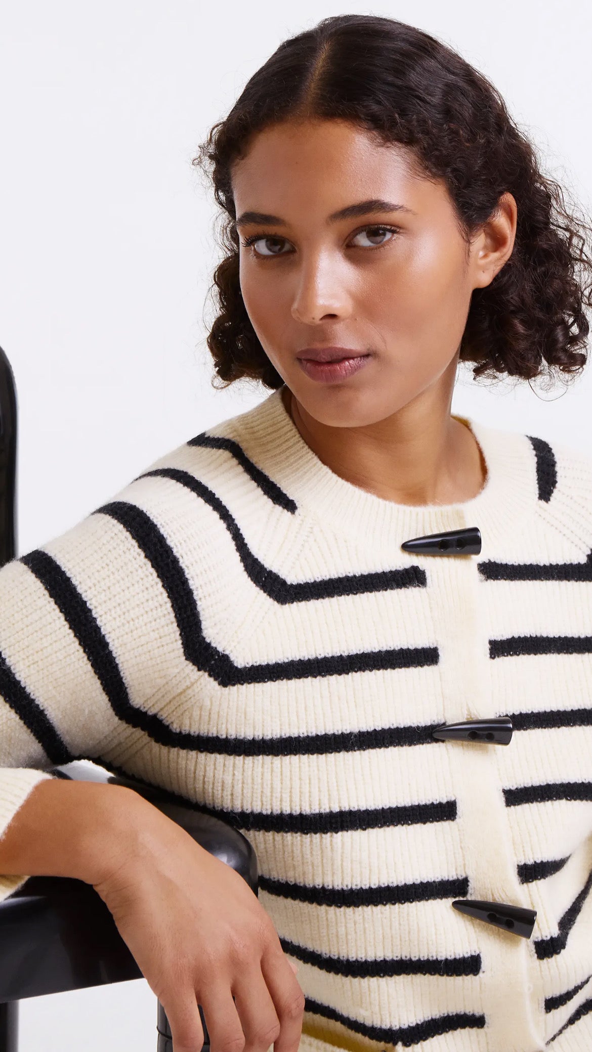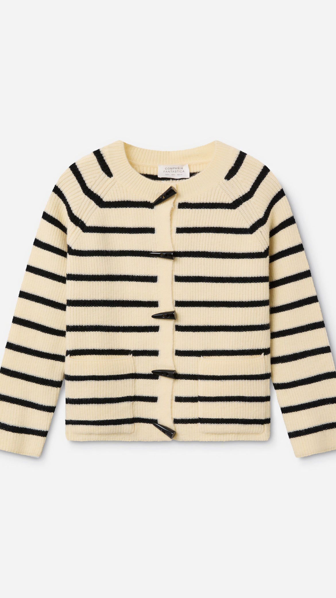 Este cárdigan de punto a rayas blanco y negro es la prenda atemporal que no puede faltar en tu armario. Su diseño marinero con cierre de botones tipo trenca aporta un toque original y sofisticado, mientras que su tejido suave y abrigado te asegura comodidad en cualquier ocasión.