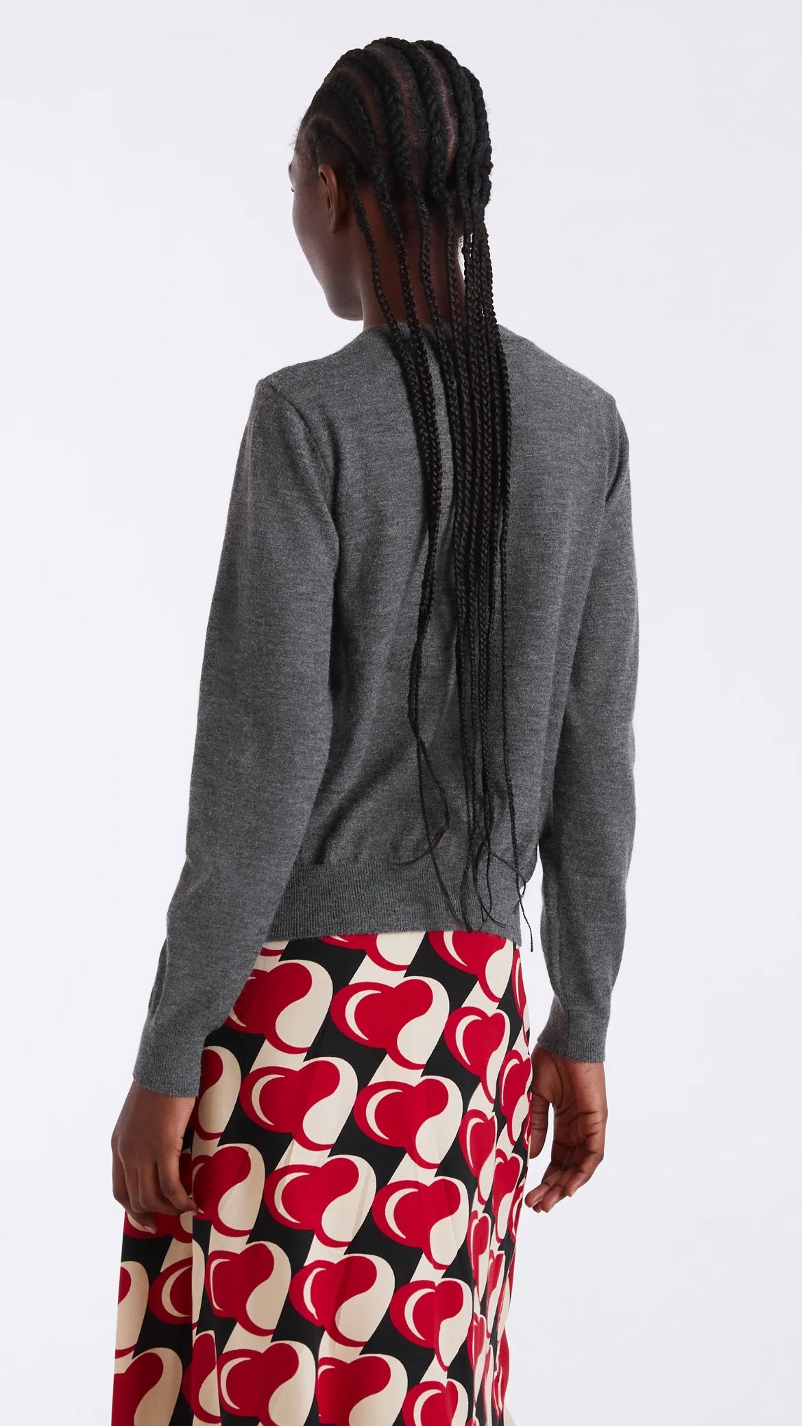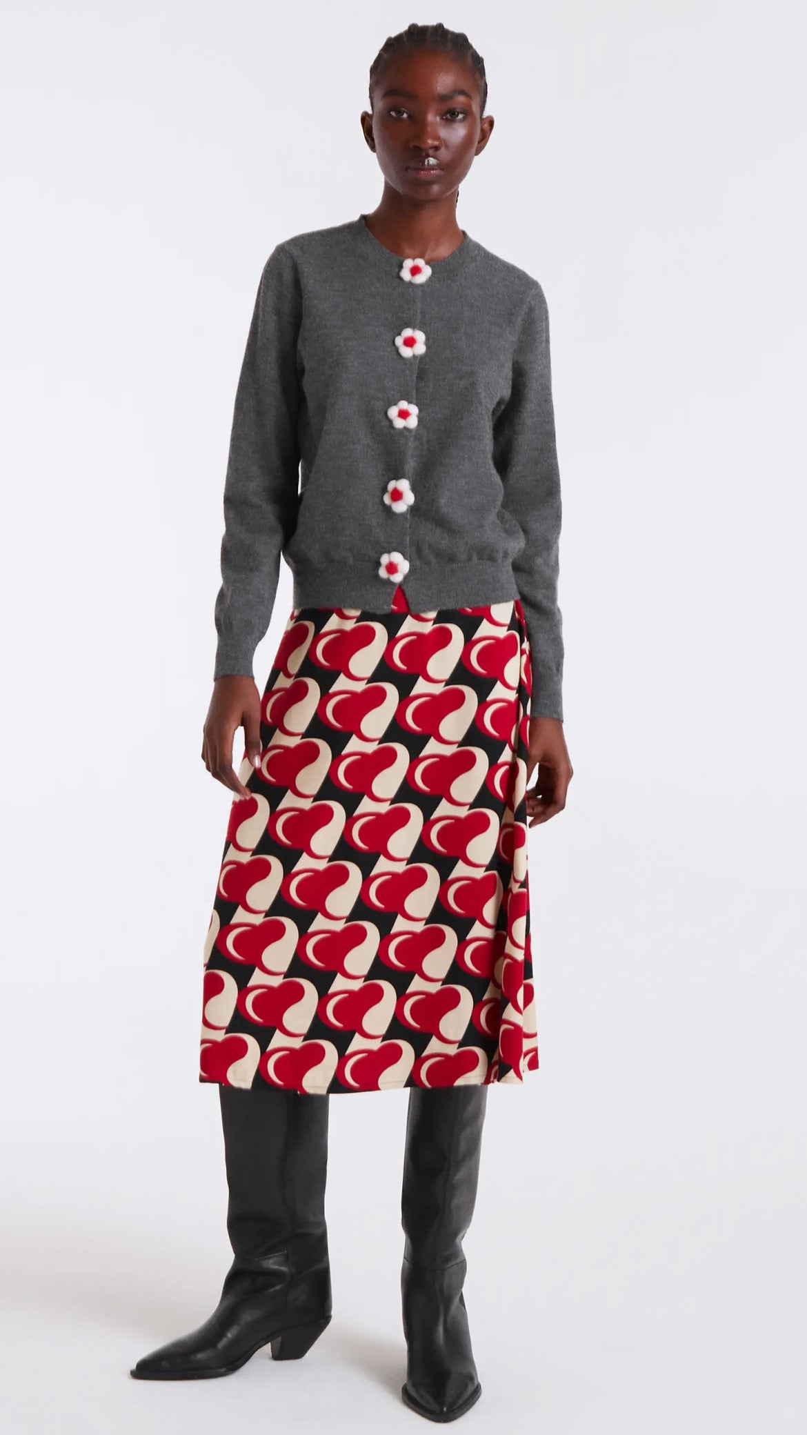 Cárdigan de punto fino en color gris con un diseño clásico y femenino. Destaca por sus botones en forma de flores blancas con centro rojo 🌺, que añaden un toque original y alegre a una prenda básica imprescindible. Su tejido ligero y suave lo convierte en una opción perfecta para entretiempo o para combinar en looks de capas durante los días más fríos.