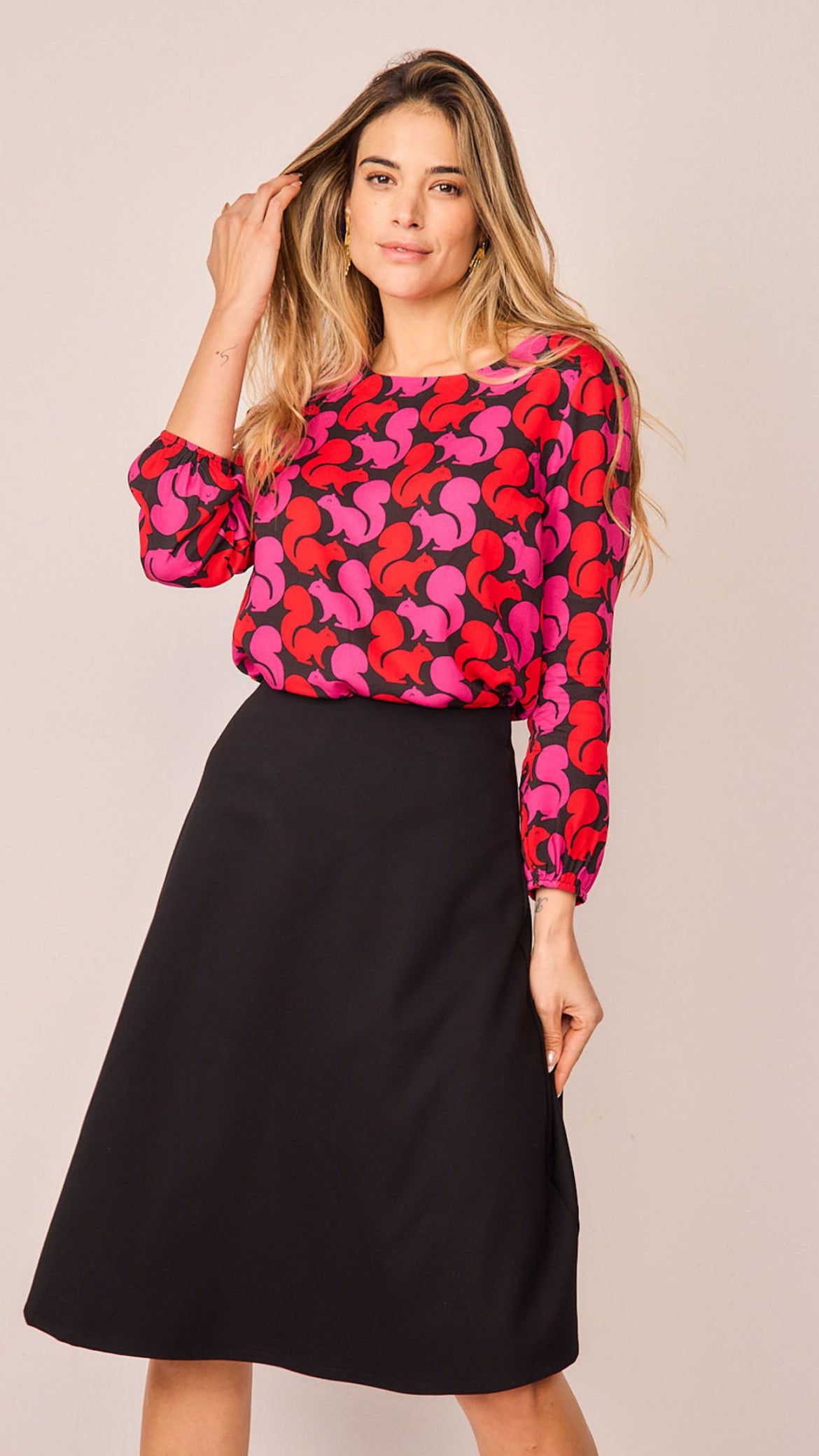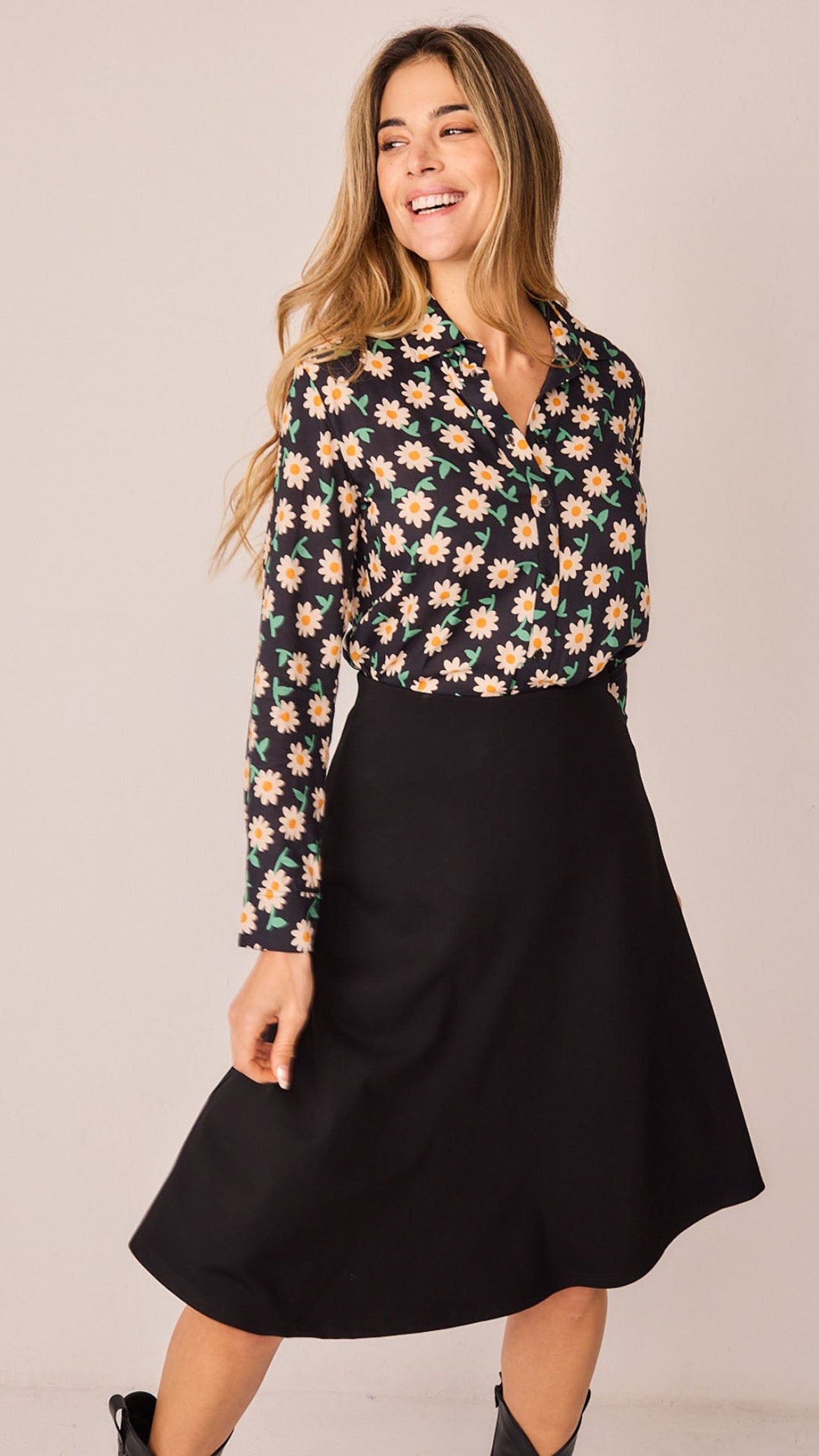 Falda negra de tiro alto con corte evasé y cintura elástica. Un básico versátil y atemporal que combina con todo: desde camisas estampadas hasta jerséis de punto. Su diseño favorecedor y cómodo la convierte en la prenda imprescindible para cualquier armario.
