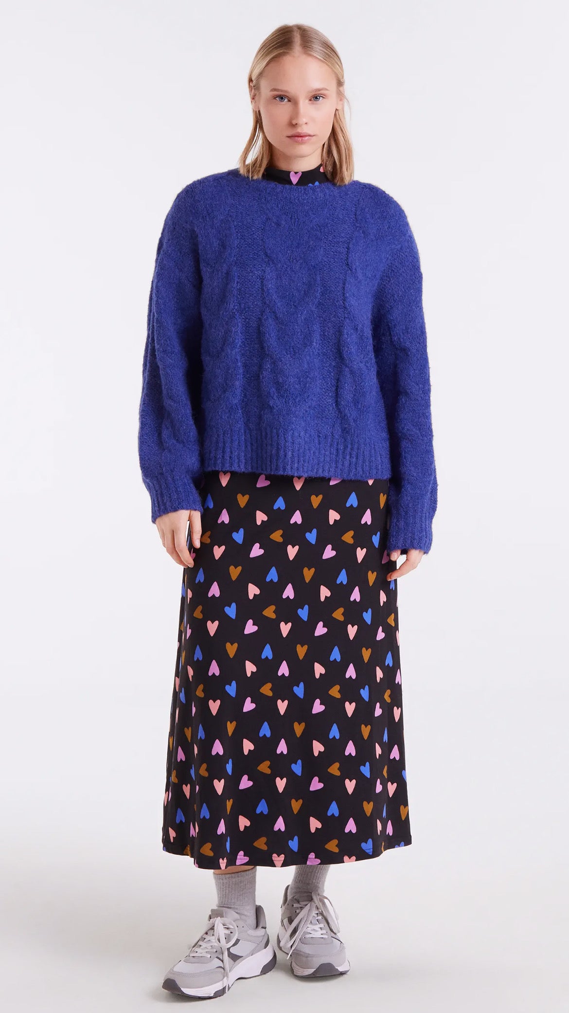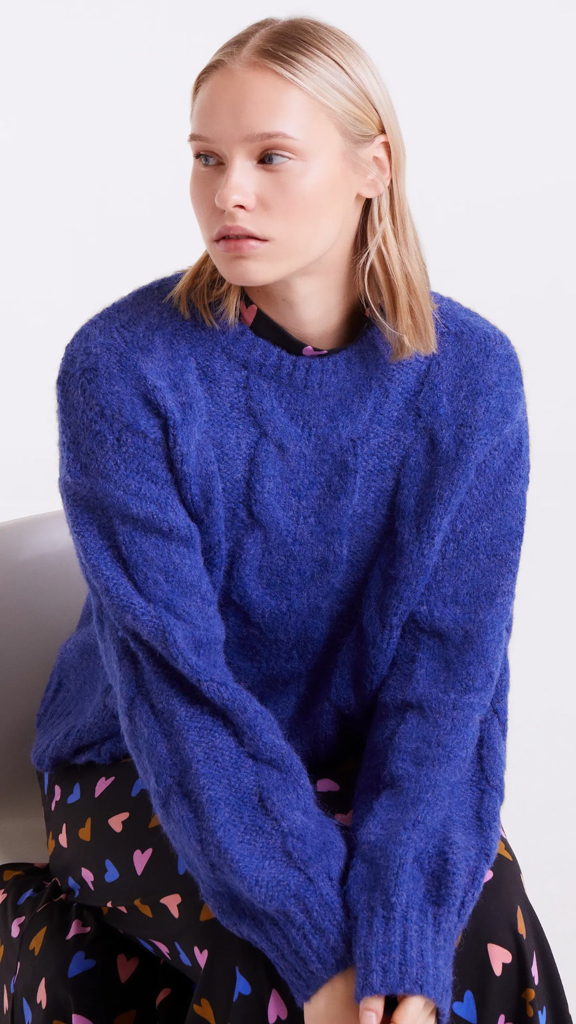 Este jersey encadenado azul destaca por su diseño clásico con trenzas en relieve y un corte relajado que aporta comodidad y estilo. Su color vibrante aporta frescura y elegancia, perfecto para darle vida a tus looks de invierno.