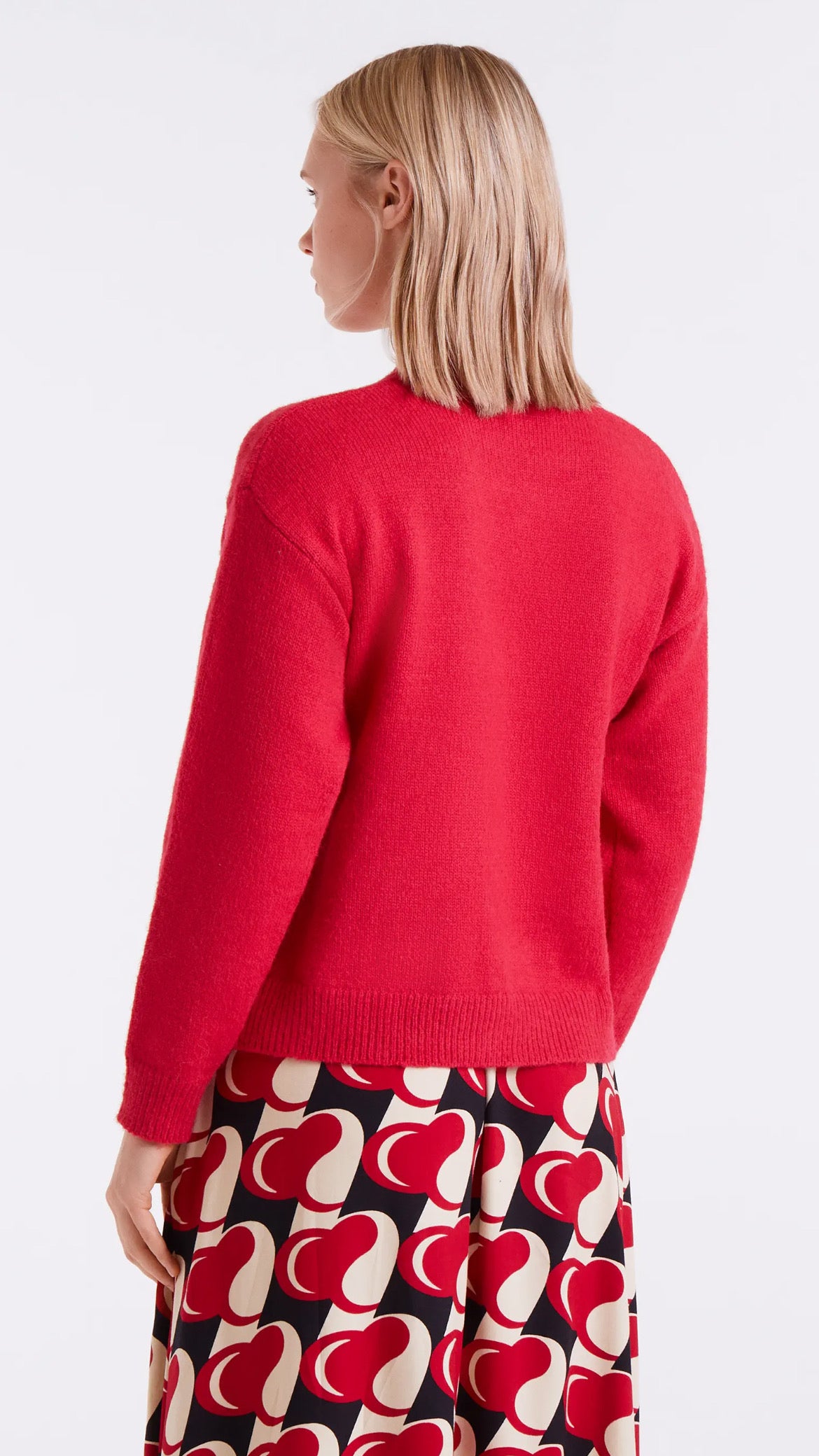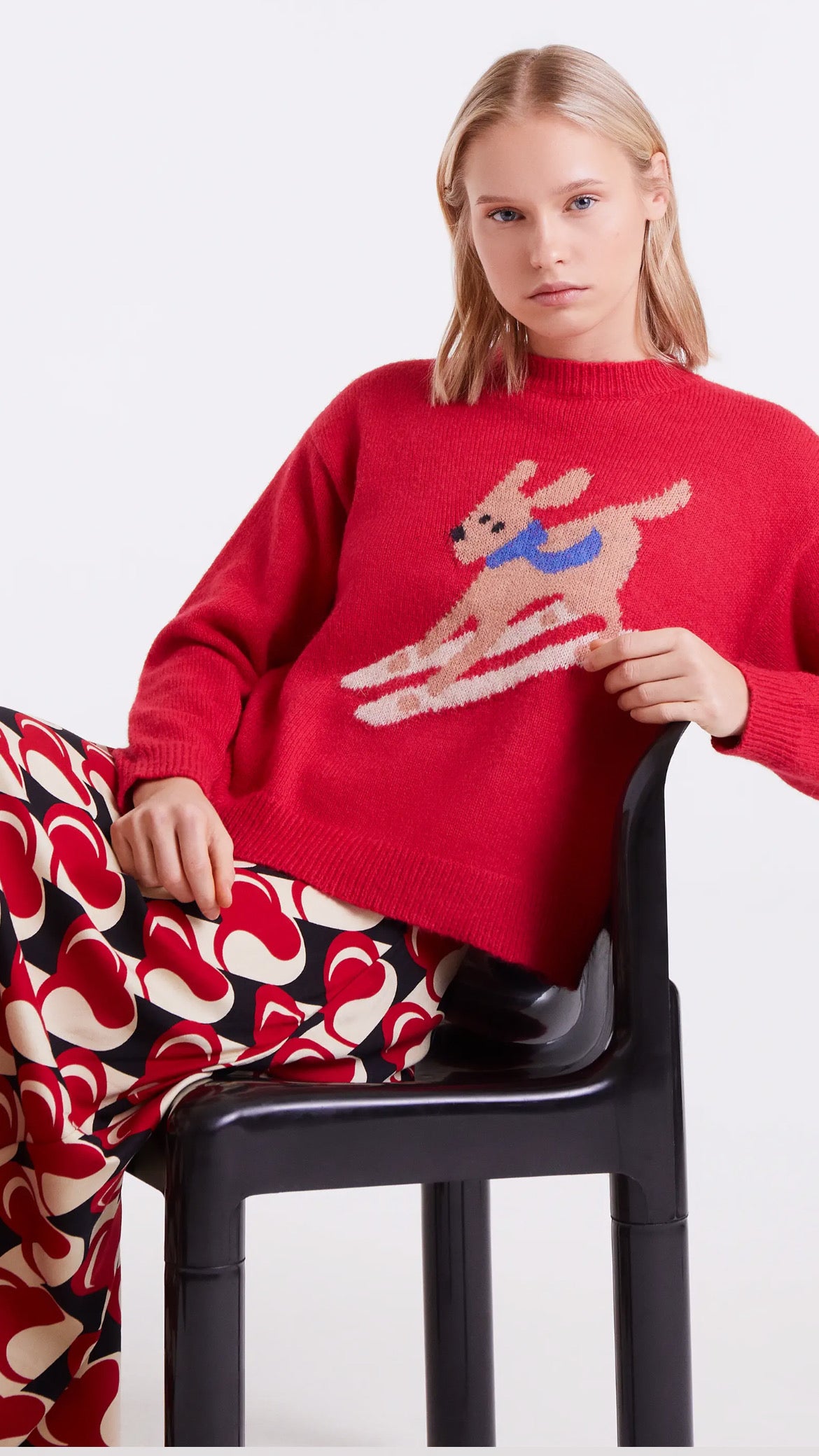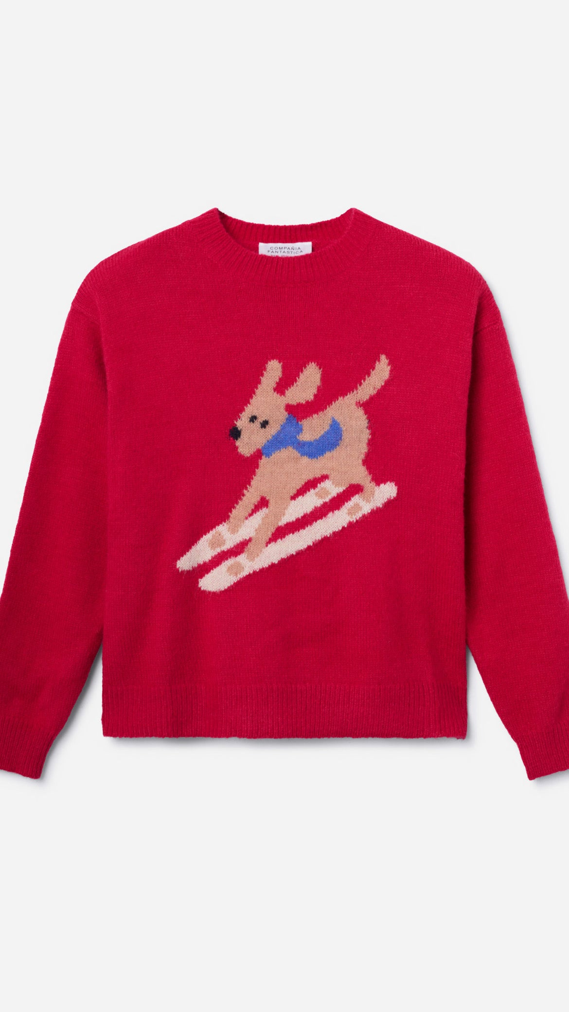 Este jersey rojo de punto jacquard destaca por su divertido dibujo de perro esquiador, ideal para darle un toque alegre y original a tus looks de invierno ❄️🐶⛷️. Confeccionado en un tejido suave y abrigado, combina comodidad con estilo, siendo perfecto para los días fríos.