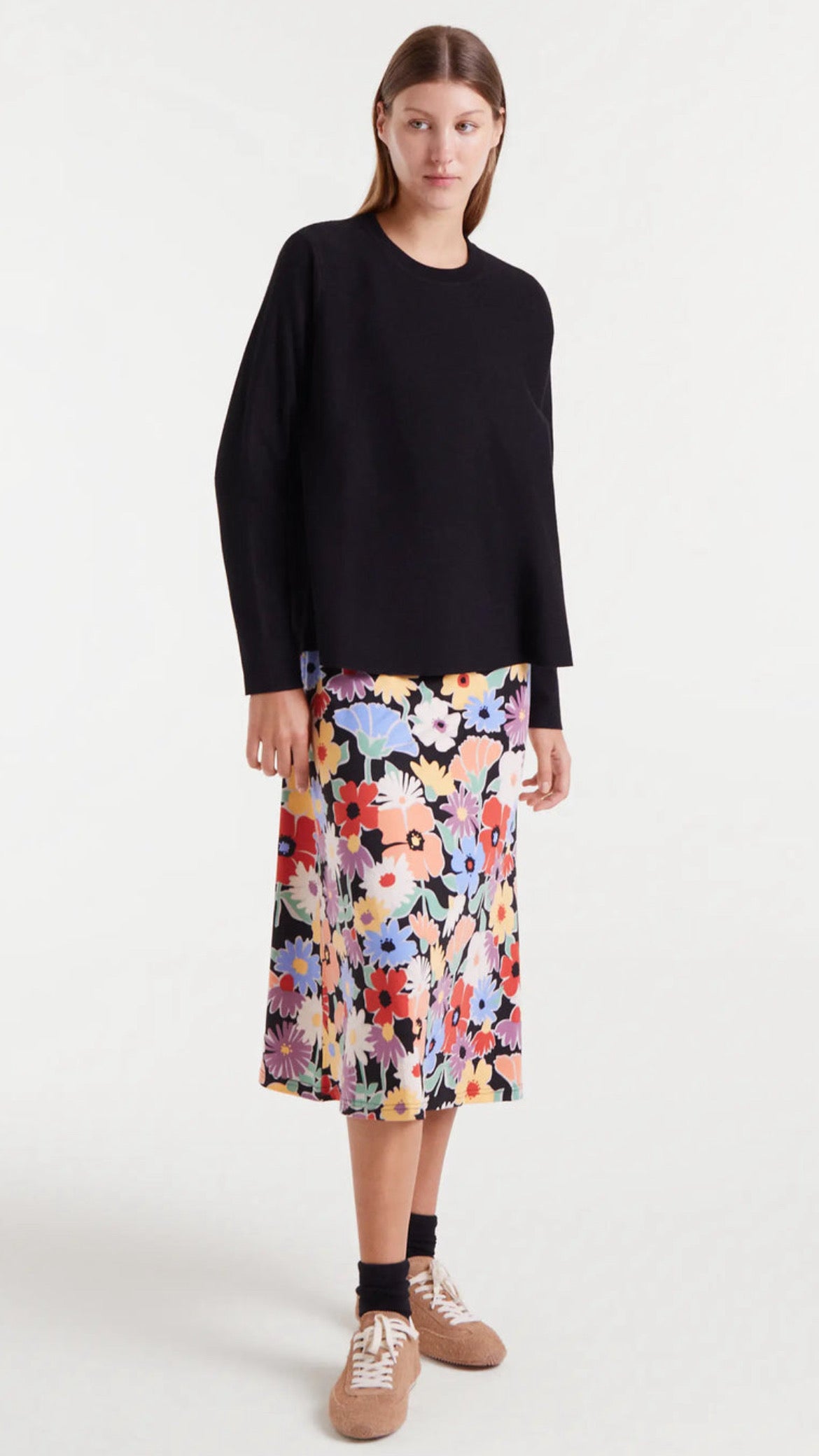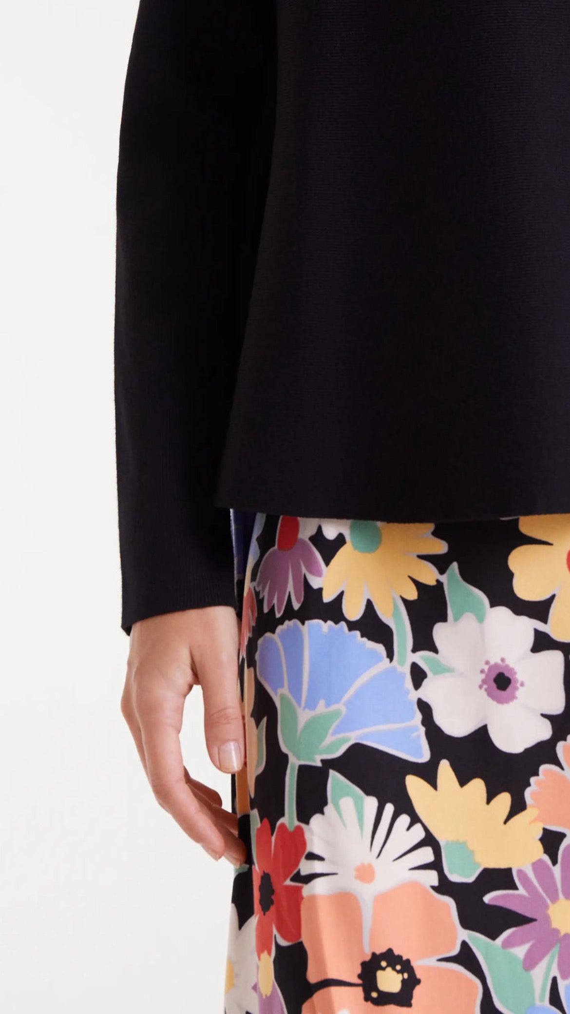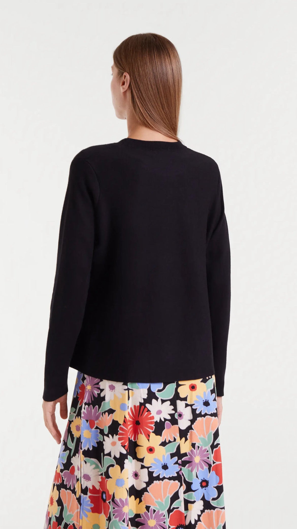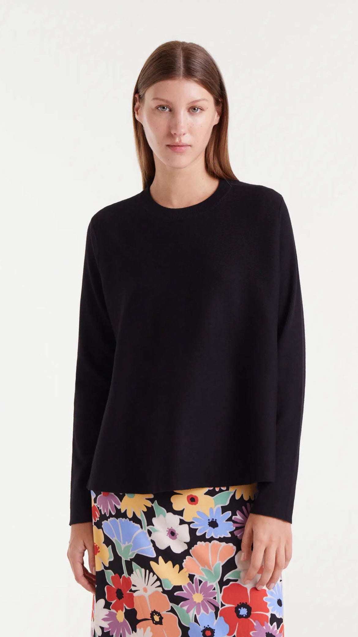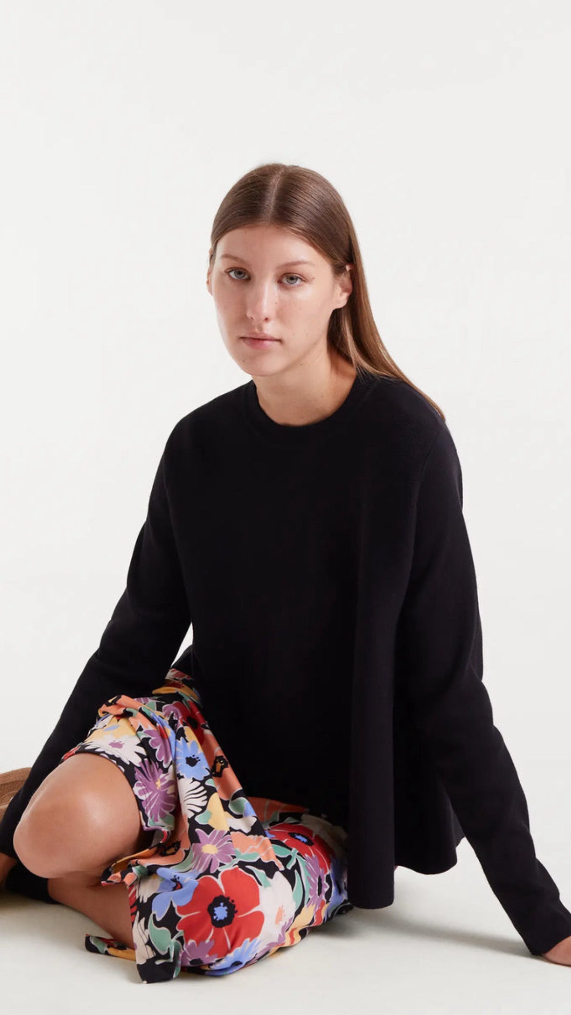 Jersey de punto en color negro con corte evasé, un diseño cómodo y favorecedor que aporta caída y movimiento. Con cuello redondo y manga larga, es una prenda versátil para combinar en looks diarios o más arreglados.