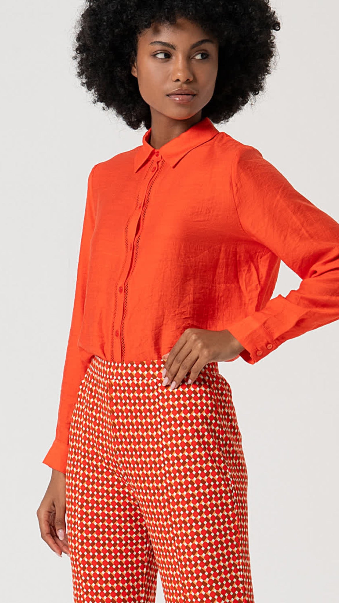 Pantalón de tiro alto con pernera de corte flare en estampado geométrico rojo con detalles en blanco y beige. Diseñado en un tejido cómodo y ligero, aporta un aire sofisticado y muy setentero a tus looks. Ideal para combinar con blazers a juego o blusas lisas que dejen todo el protagonismo al print.