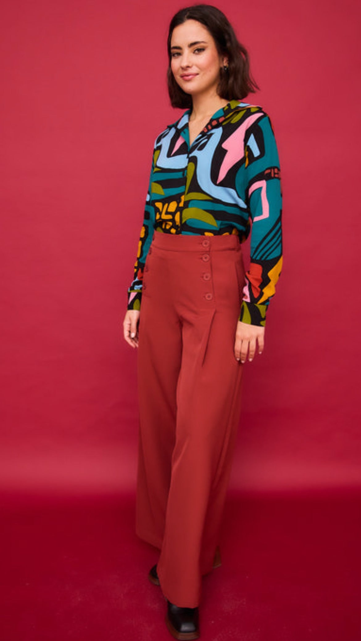 Pantalón ancho en color teja con doble botonadura decorativa en la parte frontal y goma elástica en la cintura trasera para mayor comodidad. Con un diseño elegante de corte amplio y movimiento fluido, este pantalón es perfecto para darle un aire sofisticado y chic a tus looks de diario o de oficina.