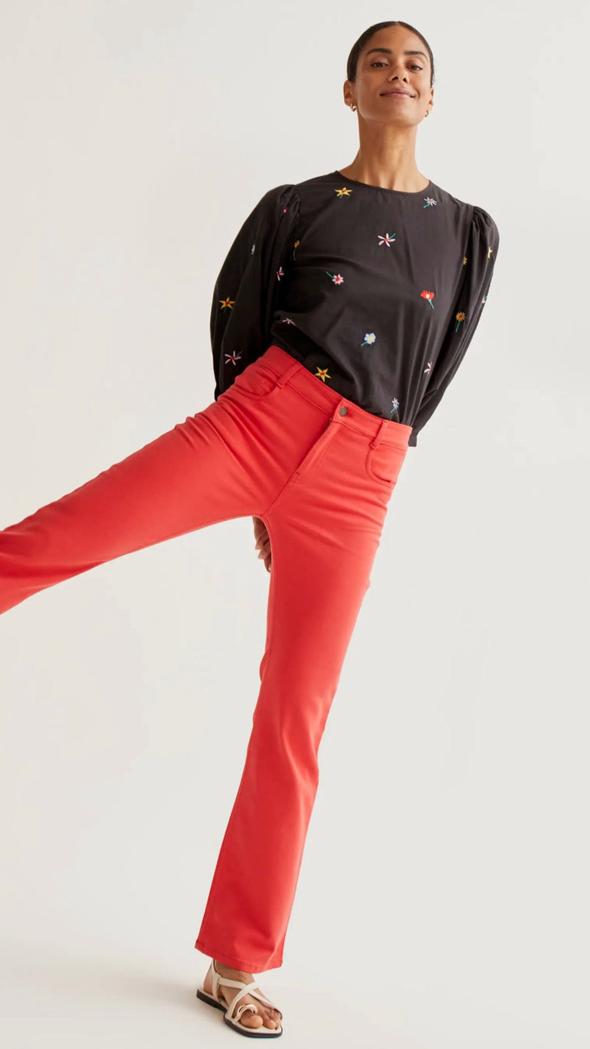Top negro con estampado black gardener flowers, confeccionado en tejido ligero y fluido que aporta comodidad y movimiento. Presenta cuello redondo y manga ligeramente abullonada que añade volumen sutil y un aire romántico. Cierre posterior con botón oculto para un acabado limpio y elegante. Su base negra realza el bordado floral multicolor, creando contraste y personalidad en la prenda.