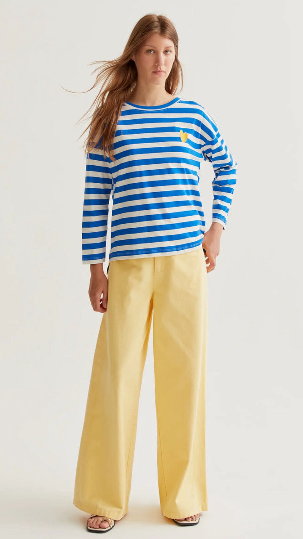 💛 Destaca su corazón bordado en color amarillo, creando un contraste alegre y original sobre el estampado marinero.