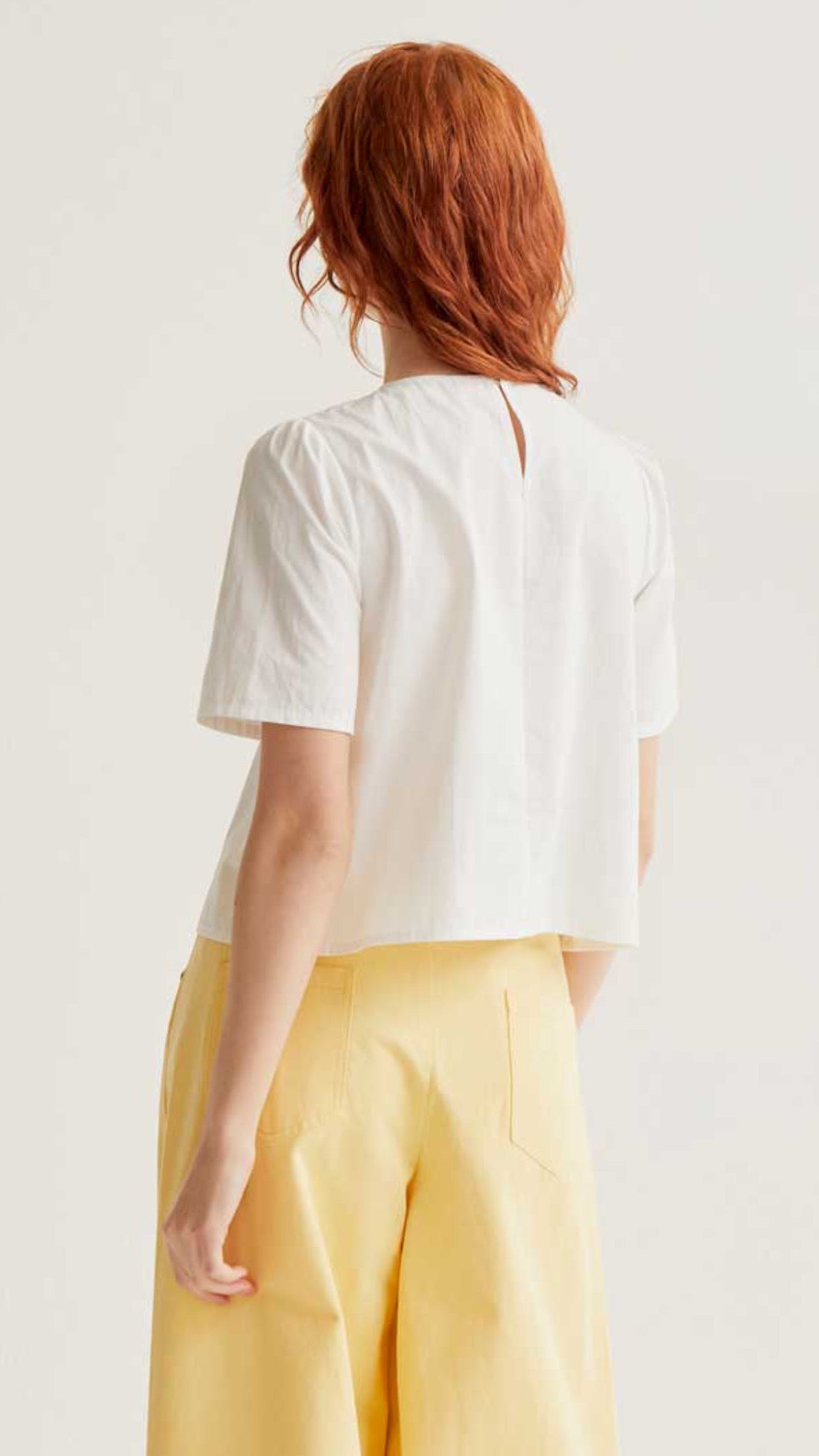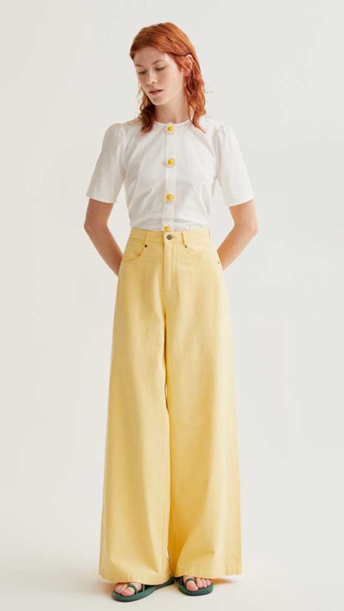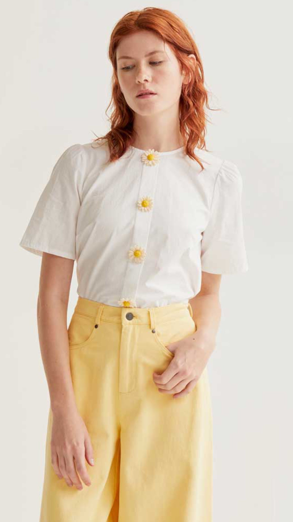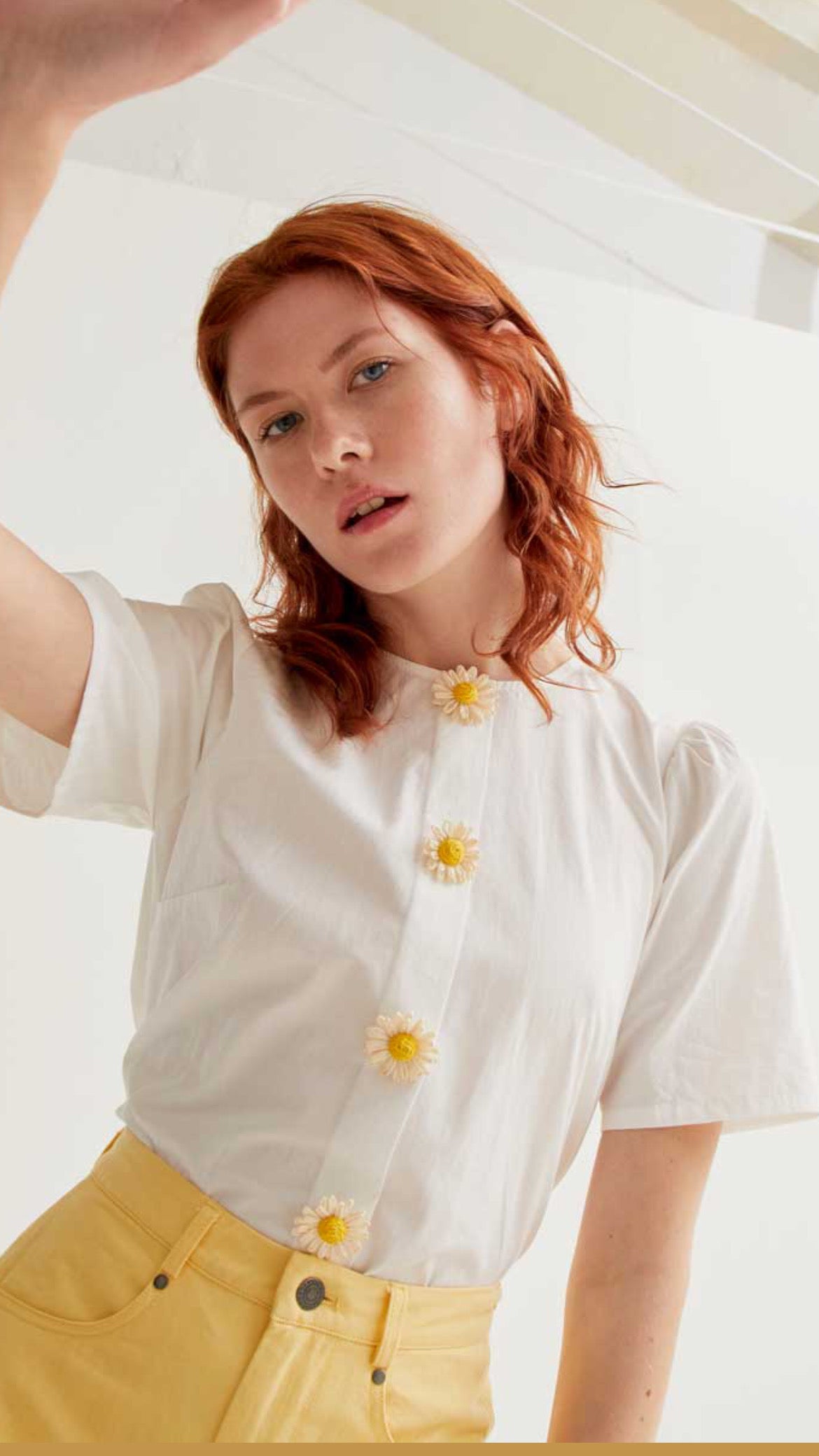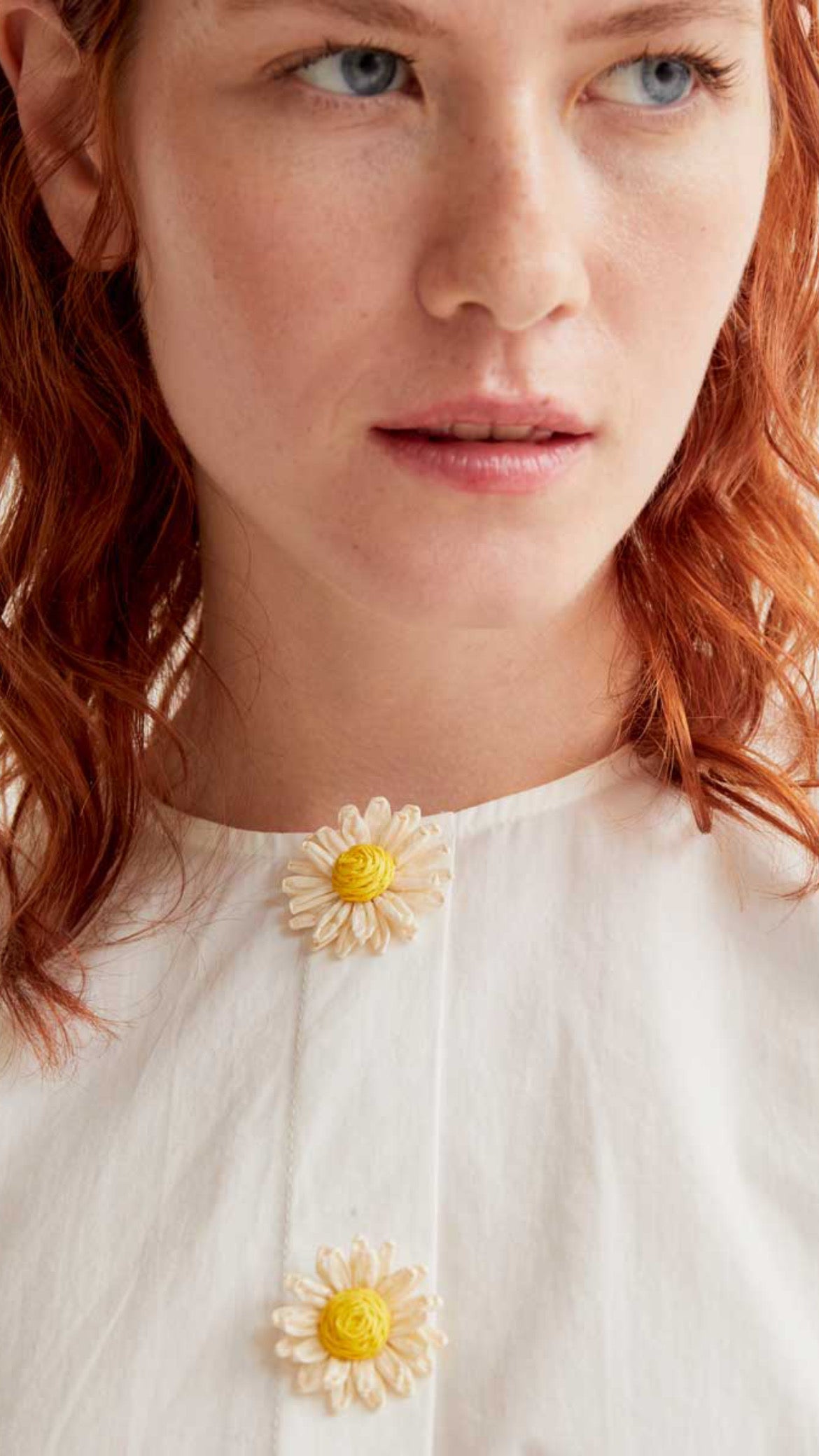 El detalle floral en relieve con centro amarillo aporta luz, textura y ese punto artesanal que marca la diferencia. Es limpia, femenina y con ese aire ligeramente retro que enamora.