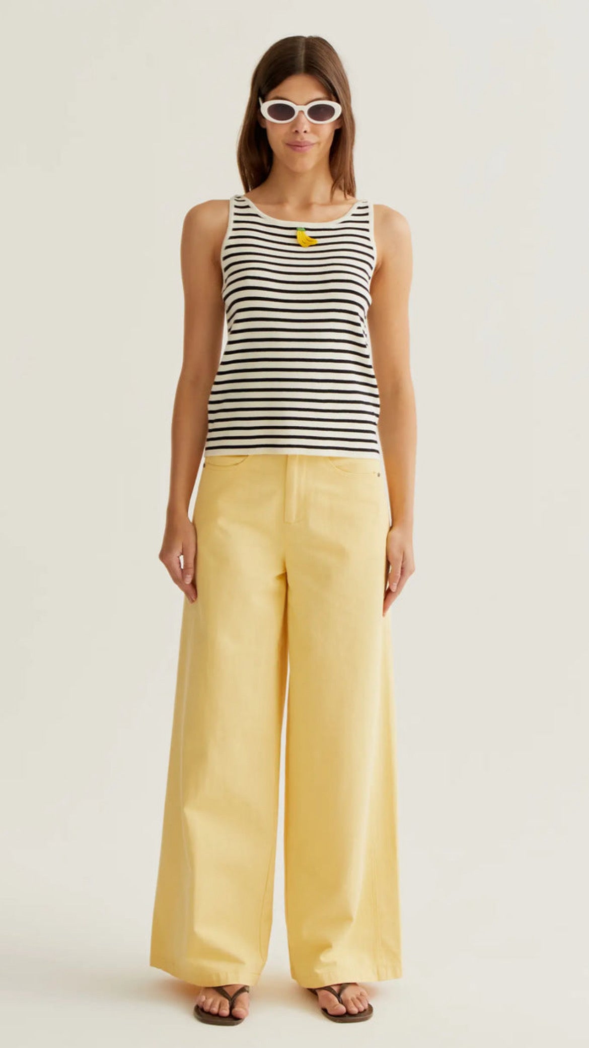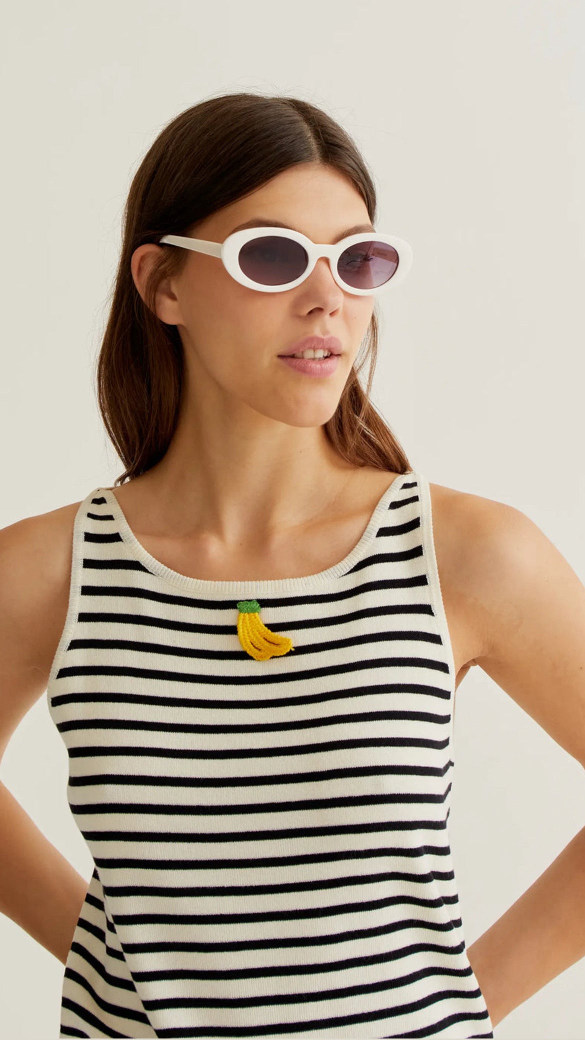 Top de tejido de punto con estampado de rayas blancas y negras estilo marinero. Diseño de cuello redondo y sin mangas, con acabados en rib que aportan estructura y mejor ajuste. Incorpora detalle frontal de banana bordada en relieve que añade un toque divertido y diferencial. Tejido suave, cómodo y ligeramente elástico que se adapta al cuerpo sin marcar. La modelo mide 177 cm y lleva la talla S.