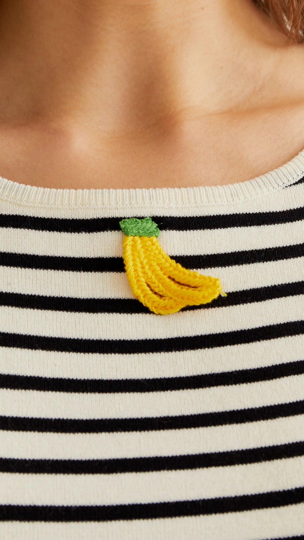 Top de rayas blanco y negro con bordados de banana