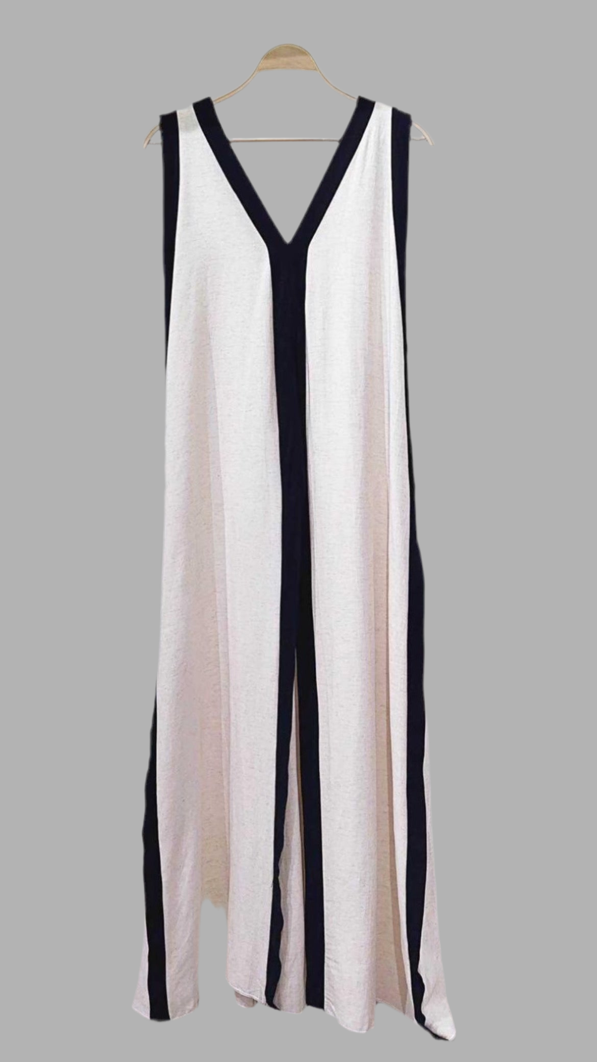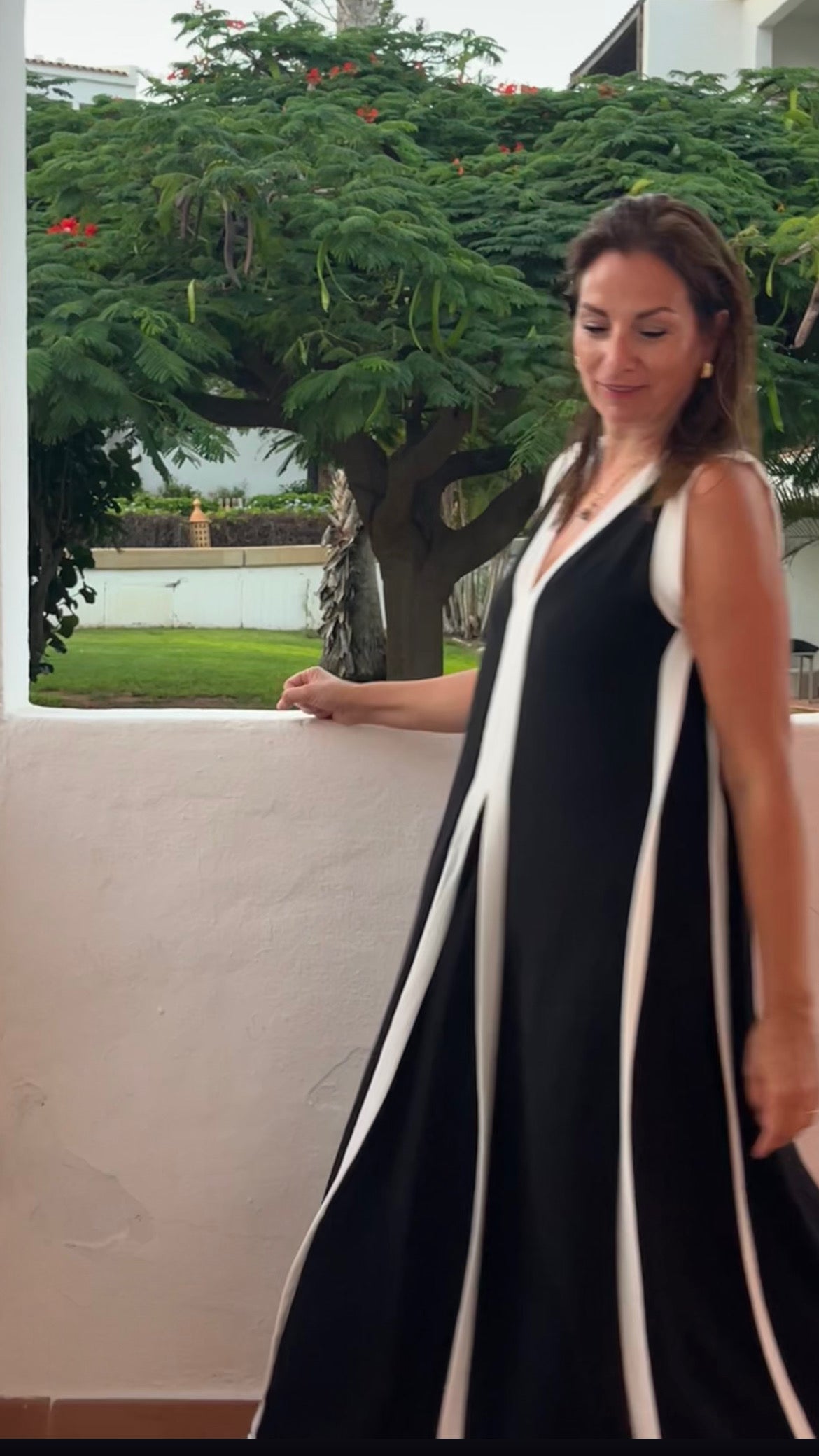 Este vestido largo sin mangas en negro y blanco es una pieza elegante y versátil que estiliza la figura gracias a su corte fluido y al contraste vertical de los colores. El escote en V añade un toque femenino y favorecedor, mientras que su caída amplia garantiza comodidad en cada movimiento.