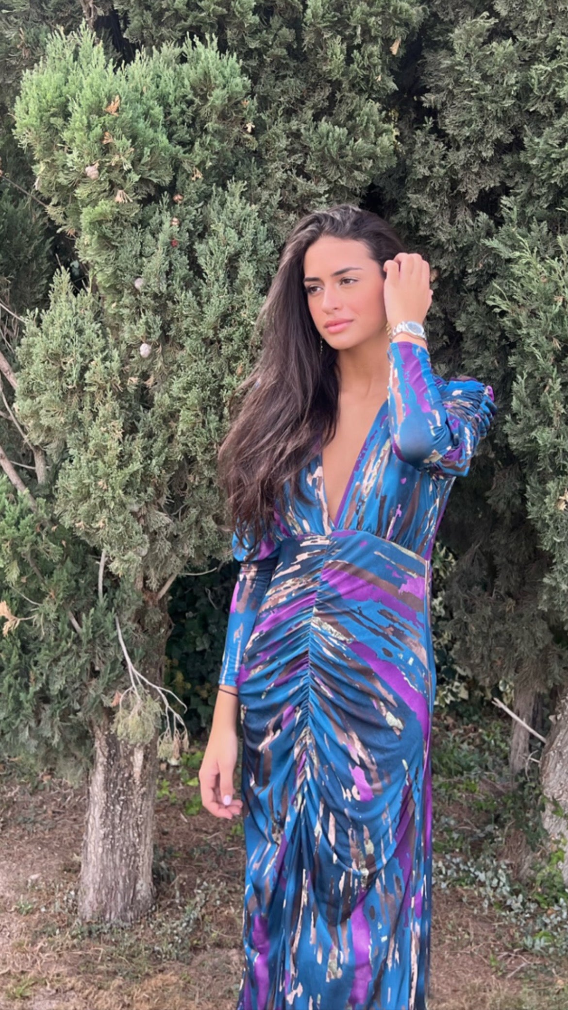 Midi-length dress printed on a blue background with strokes in bougainvillea, brown, beige, purple, and black tones.