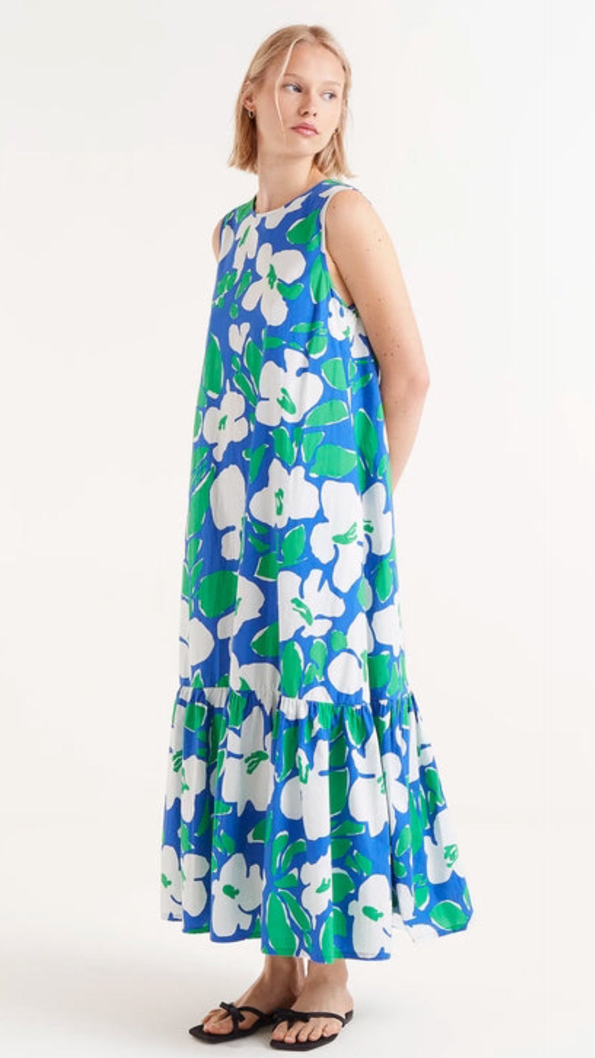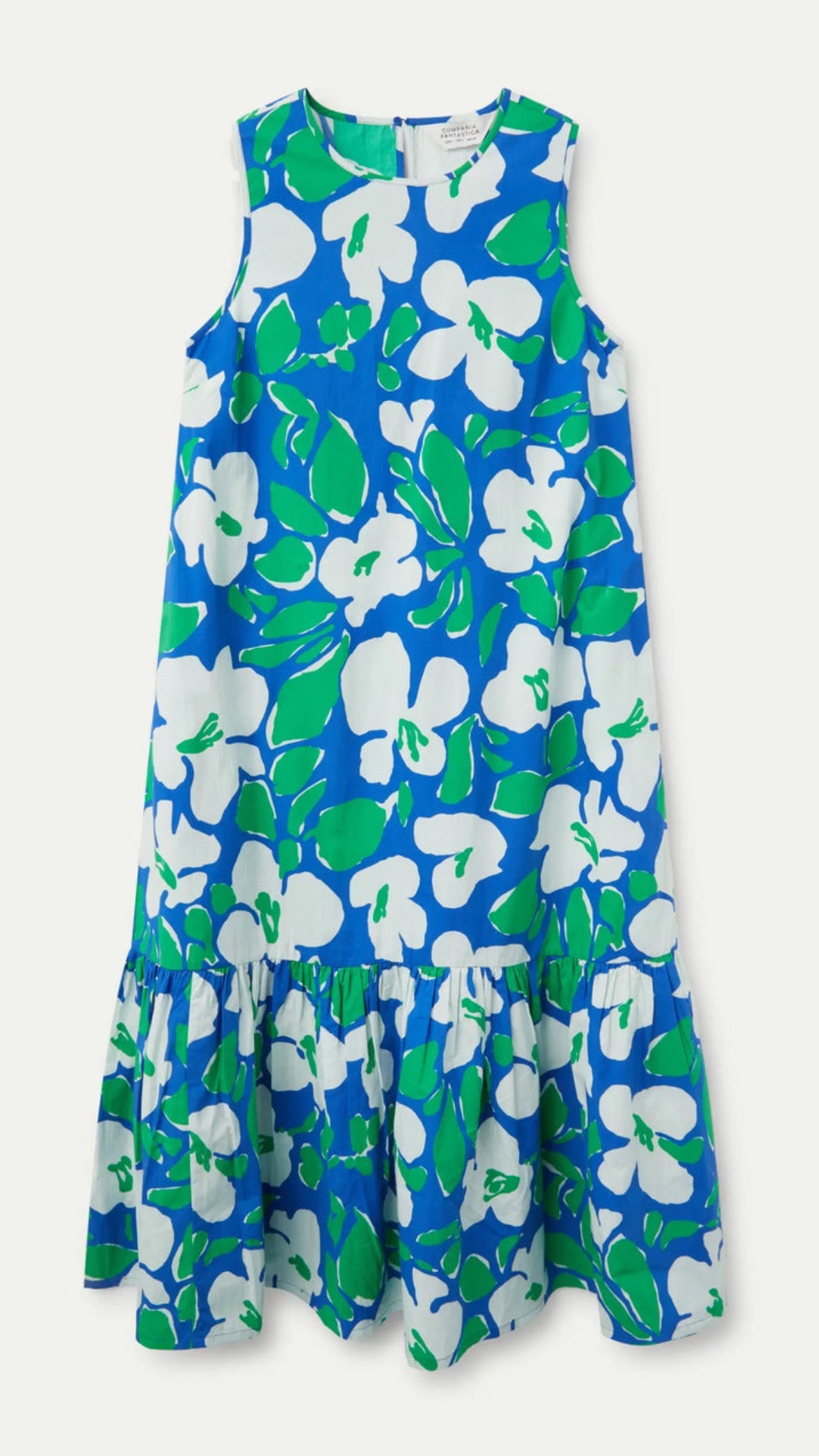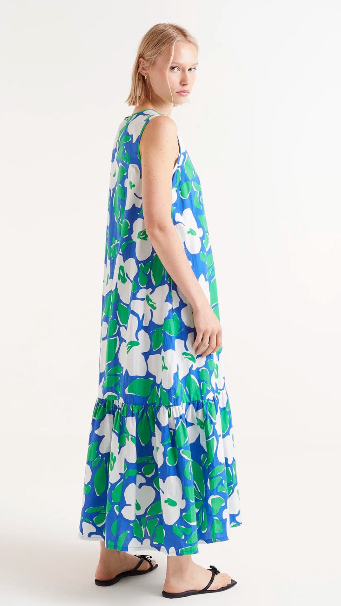 This long dress stands out for its Bosco floral print, bringing a fresh and elegant touch to any occasion. With a round neck and sleeveless design, it's a lightweight and comfortable piece, perfect for warmer days. Its flowing design features a slit at the hem, adding movement and a sophisticated finish. The back slit and button closure complete the design with a subtle and delicate touch.
