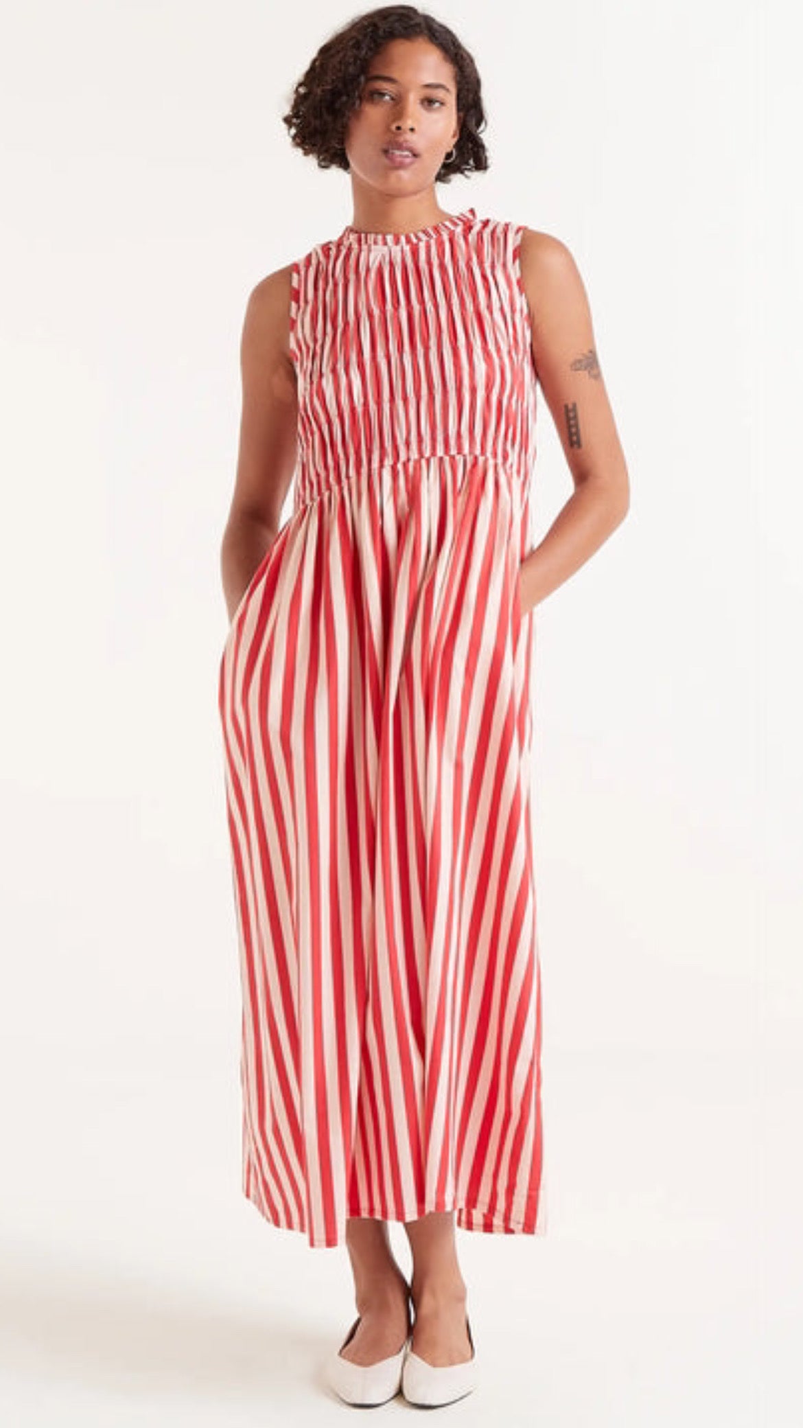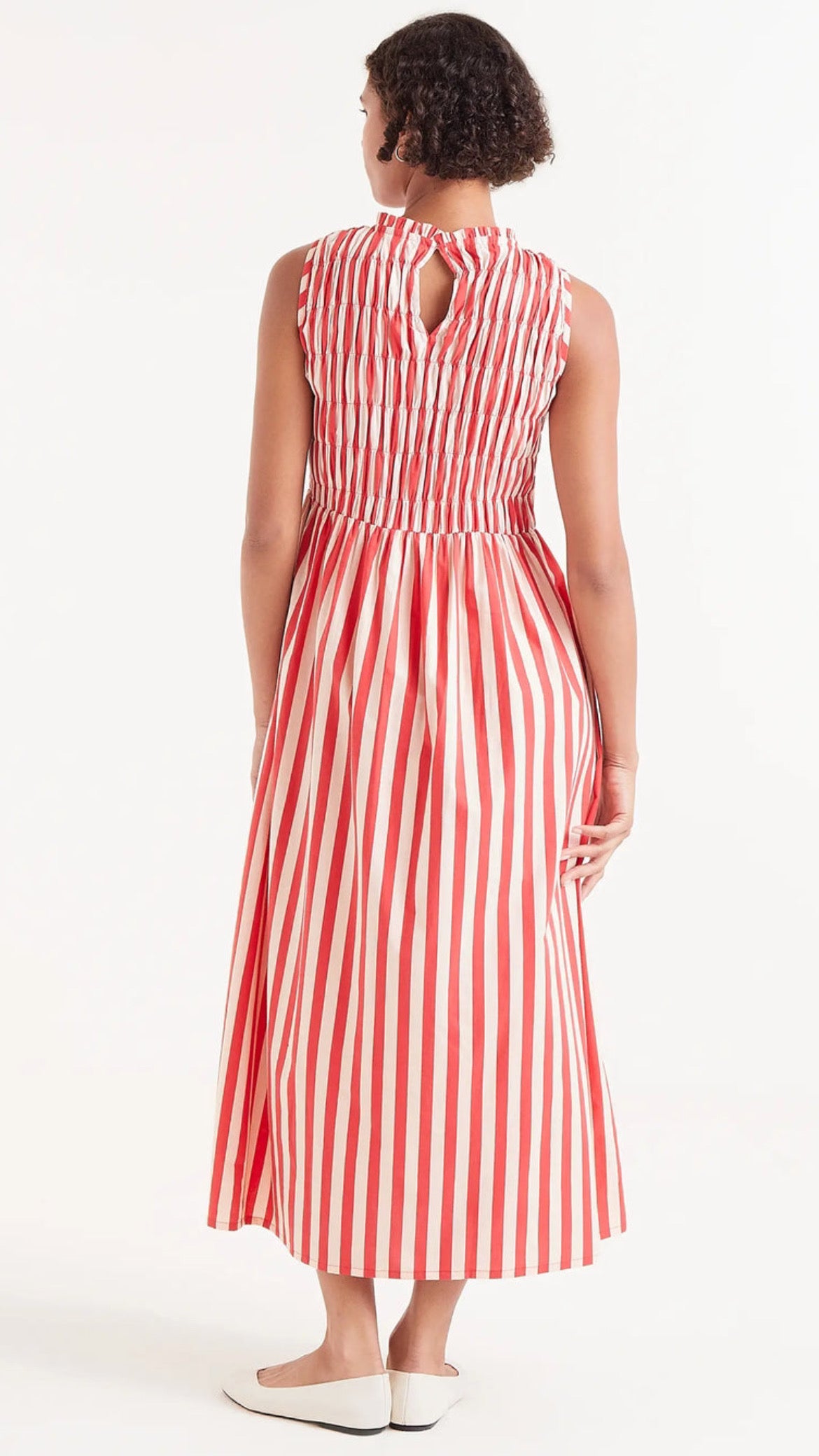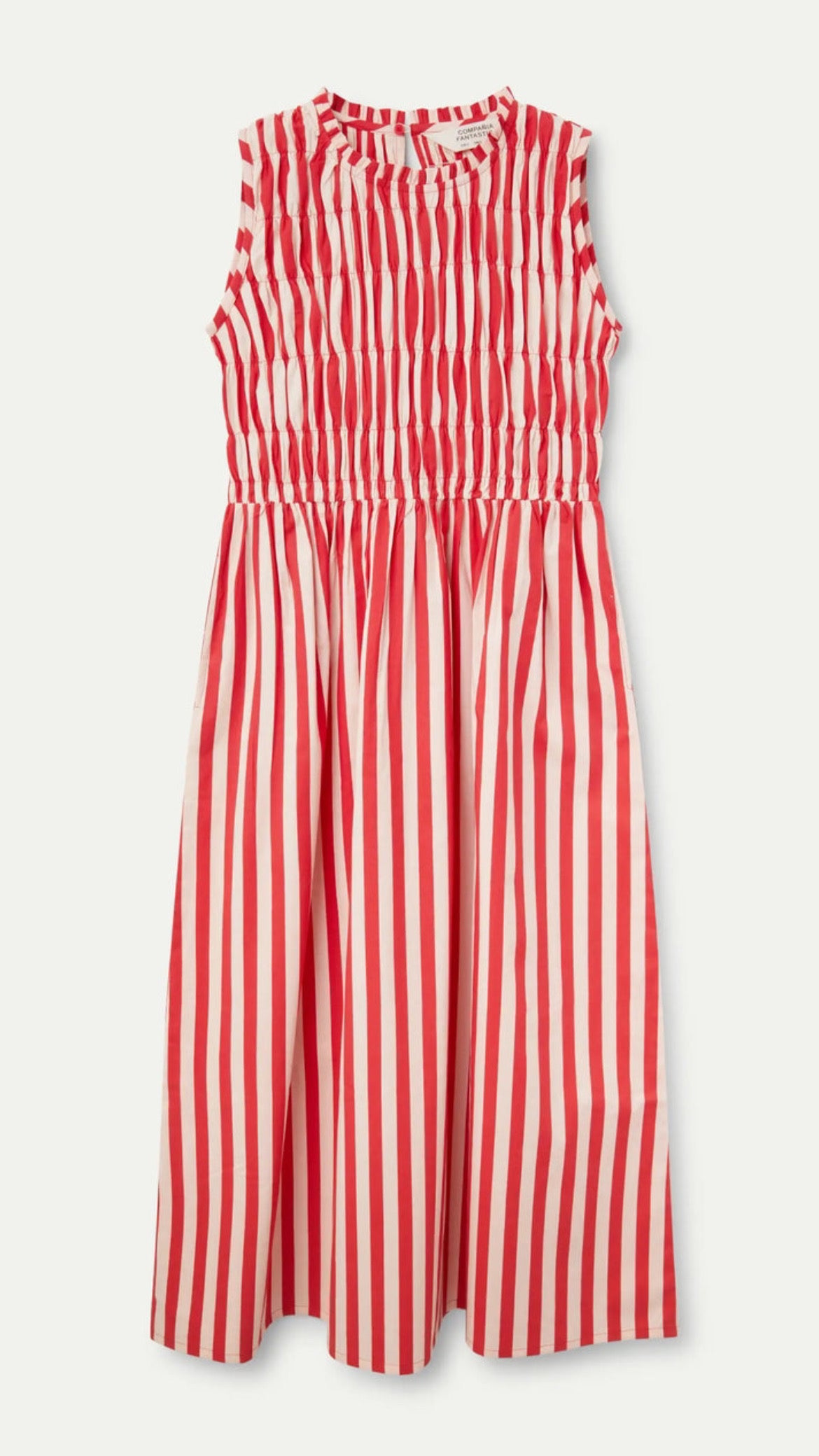 This long cotton poplin dress with a red stripe print is the perfect combination of freshness and style. Its round neck and sleeveless design give it a light and sophisticated look, while the smocked detail at the top enhances the silhouette with a feminine touch. The back slit and button closure add a delicate and elegant finish.