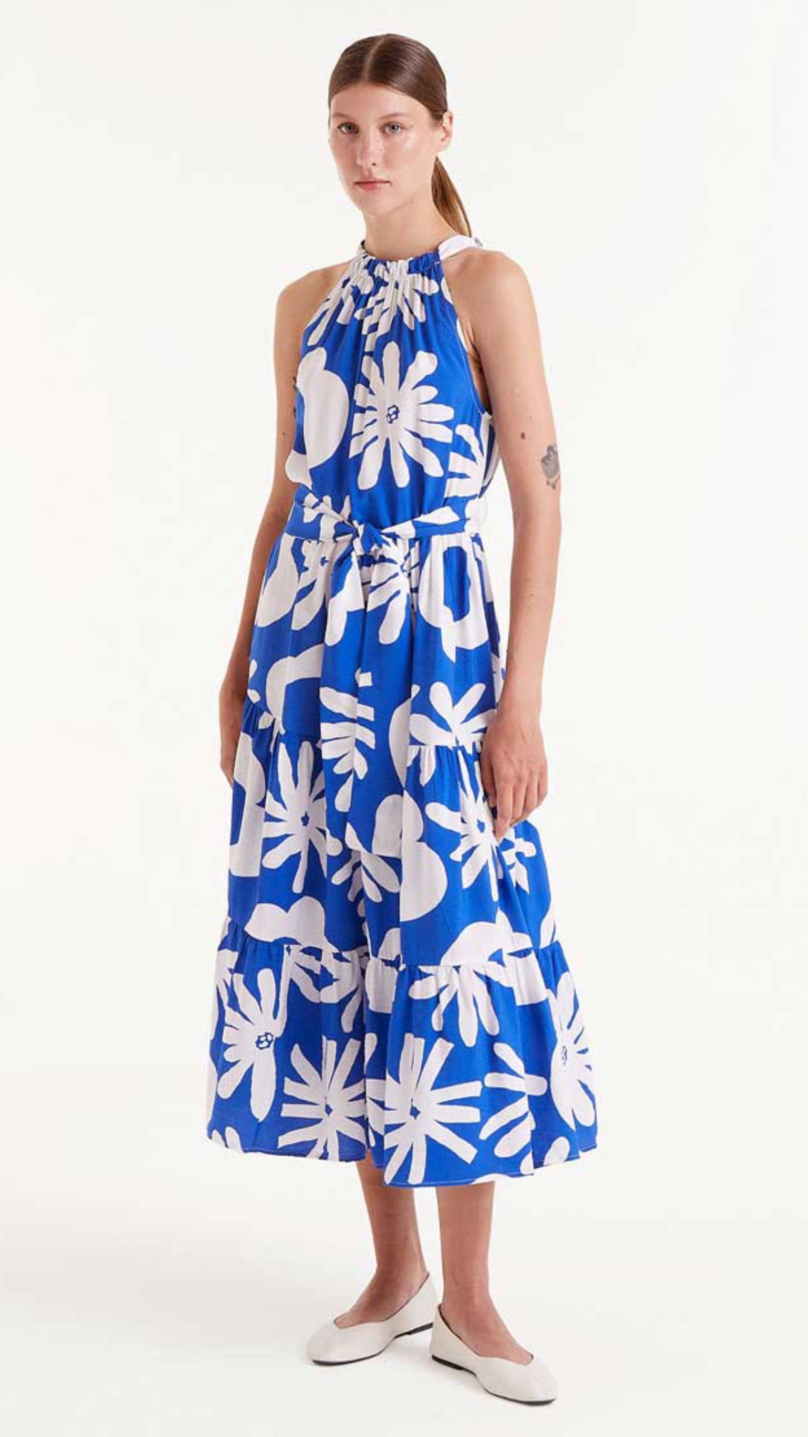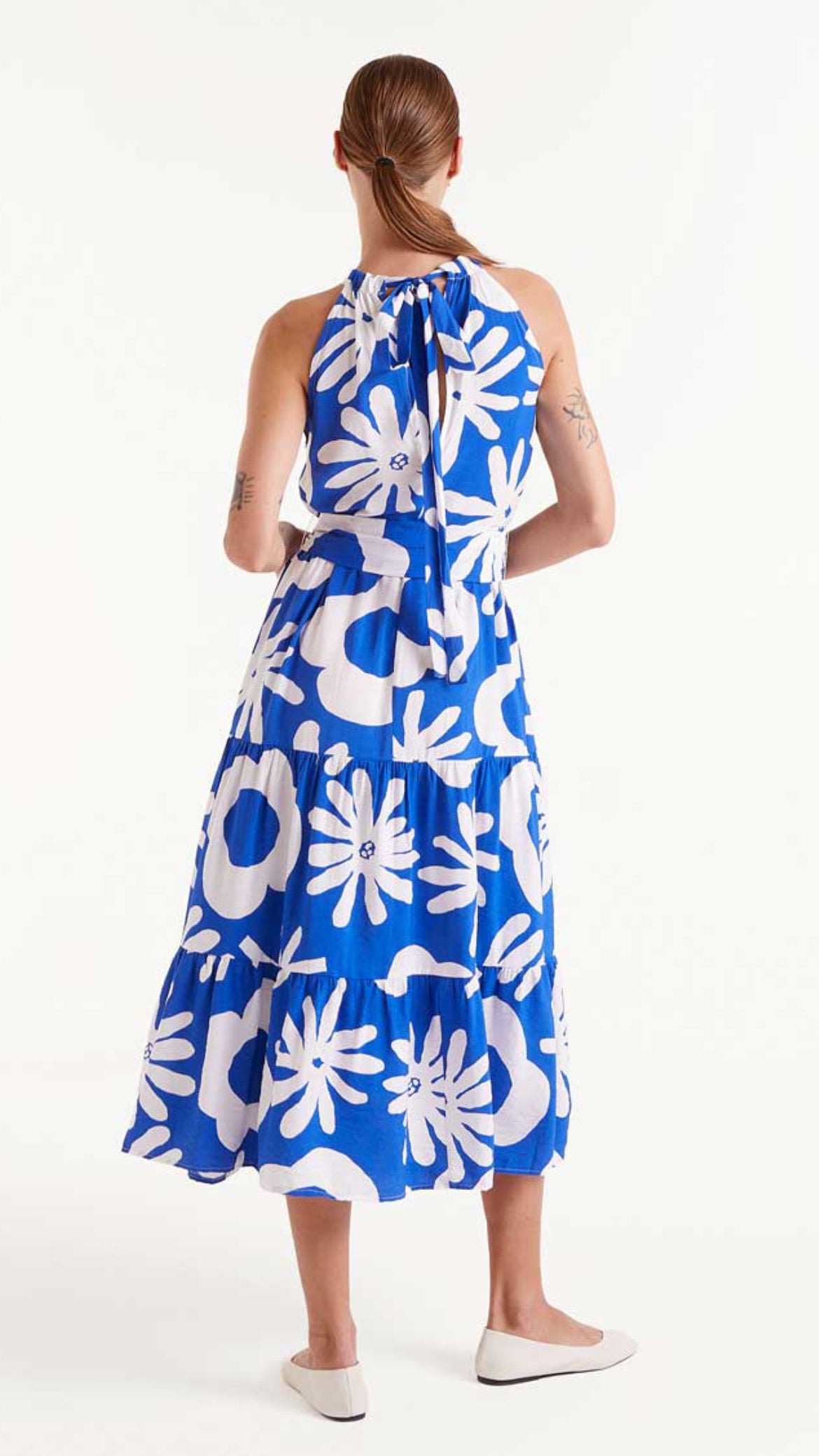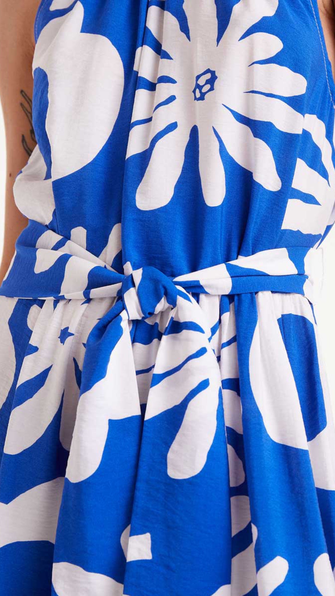 This midi dress stands out for its vibrant floral print and flowing design. With a halterneck and sleeveless design, it highlights the shoulders and gives a sophisticated and feminine look. Its horizontal cuts add movement, while the back bow and belt allow it to fit the silhouette, creating a flattering and versatile look.