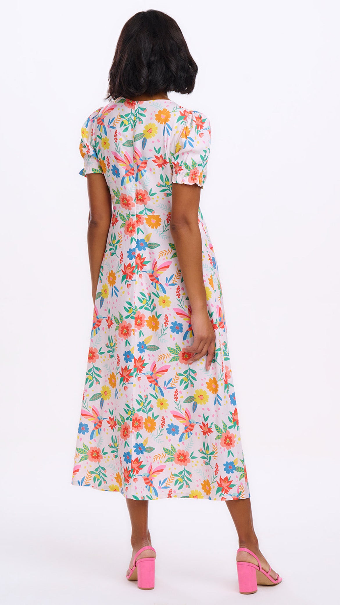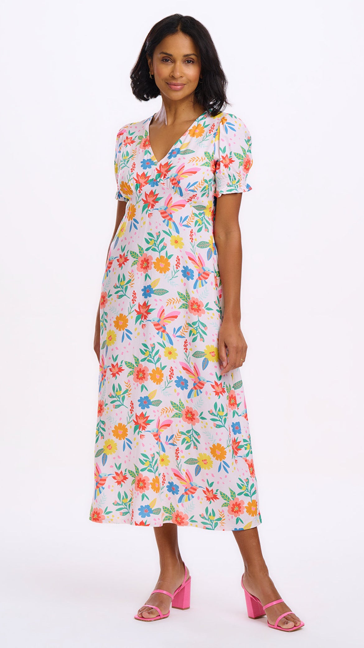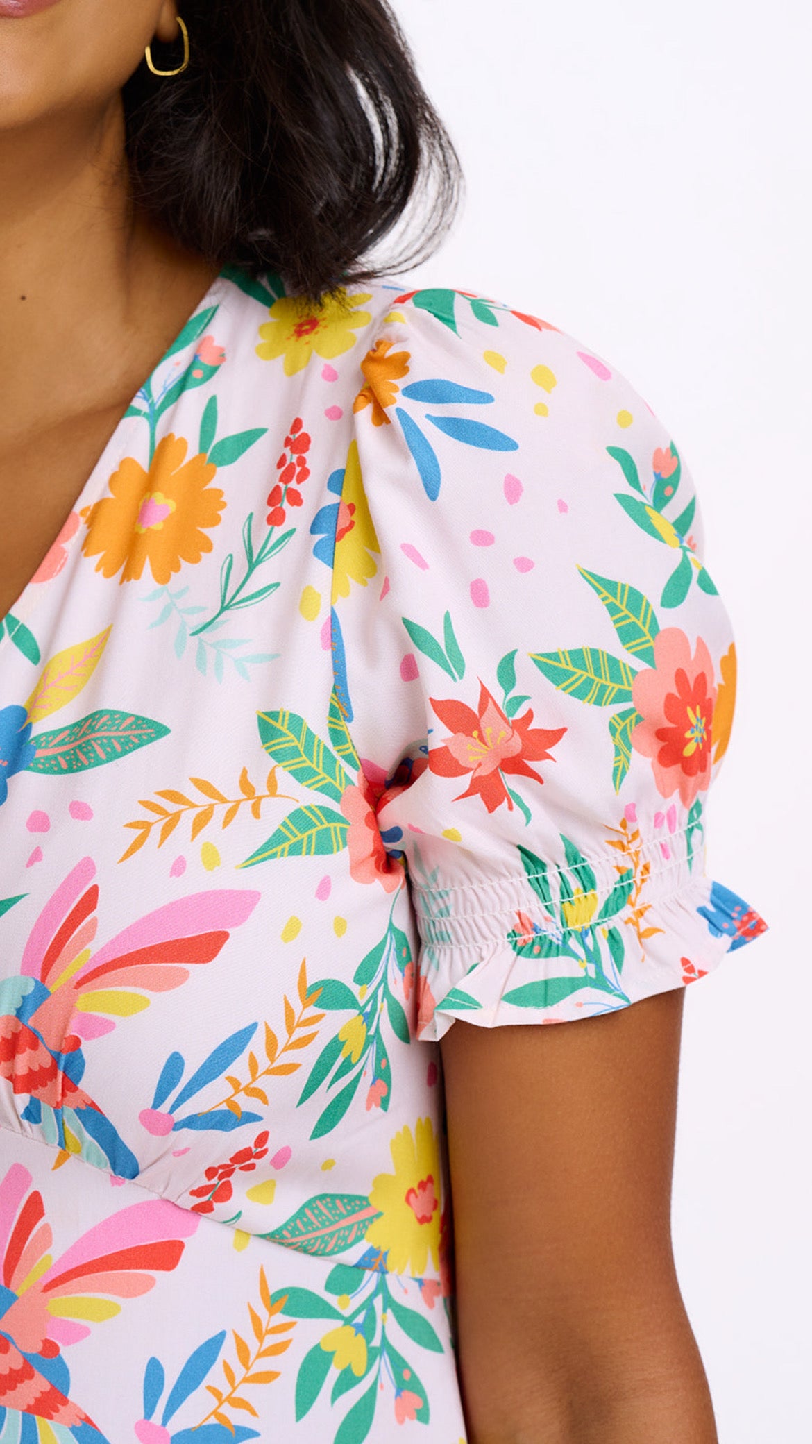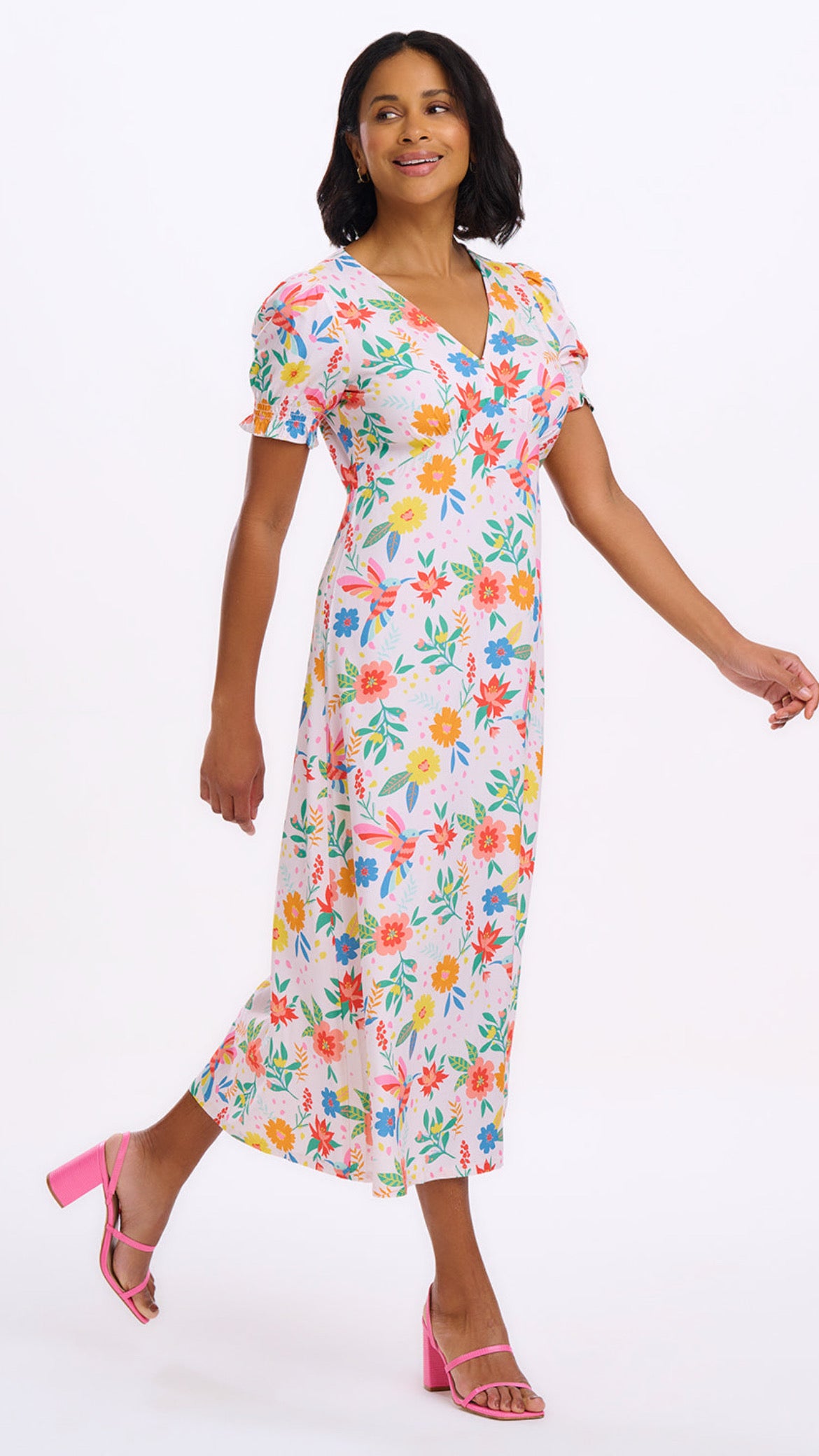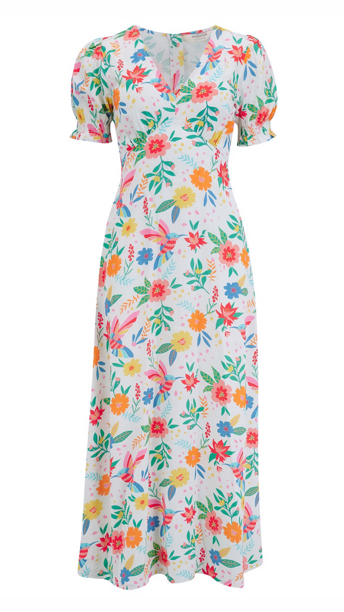 Un vestido con silueta tipo “tea dress” que combina elegancia clásica con un estampado que es puro verano. El Maryjane tiene escote en pico, línea imperio que realza el busto y mangas cortas con puño fruncido que aportan un toque romántico. El estampado “Tropical Hummingbird” está lleno de colibríes y flores en tonos vibrantes sobre fondo blanco roto, como un jardín tropical en movimiento.