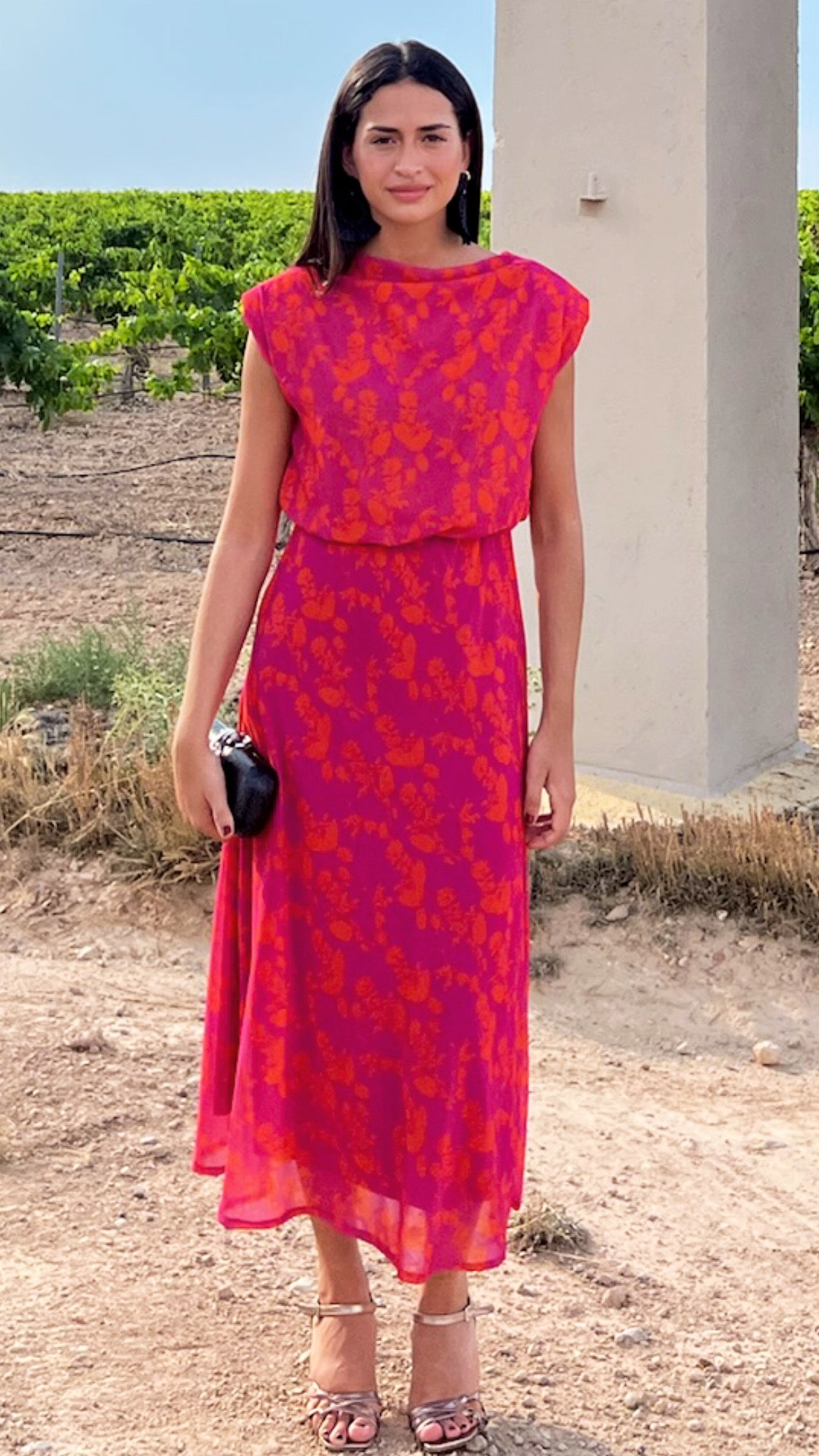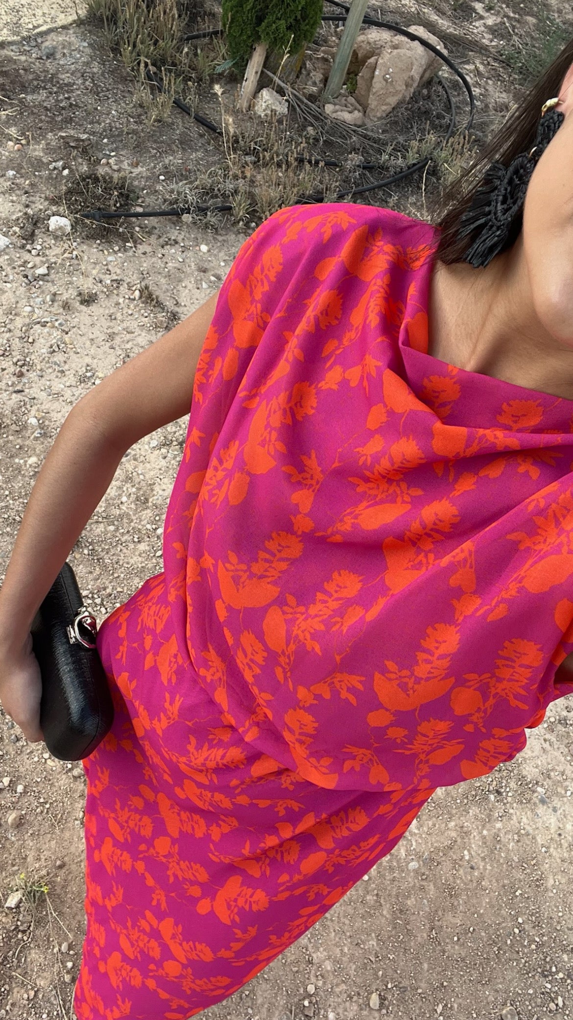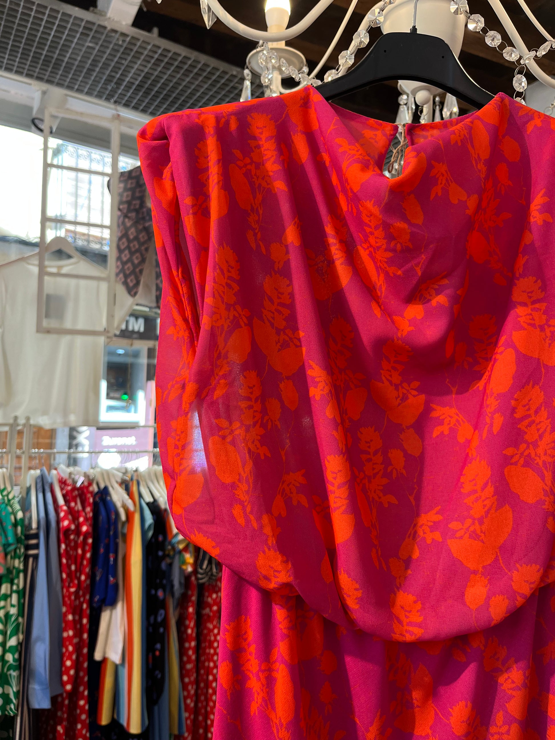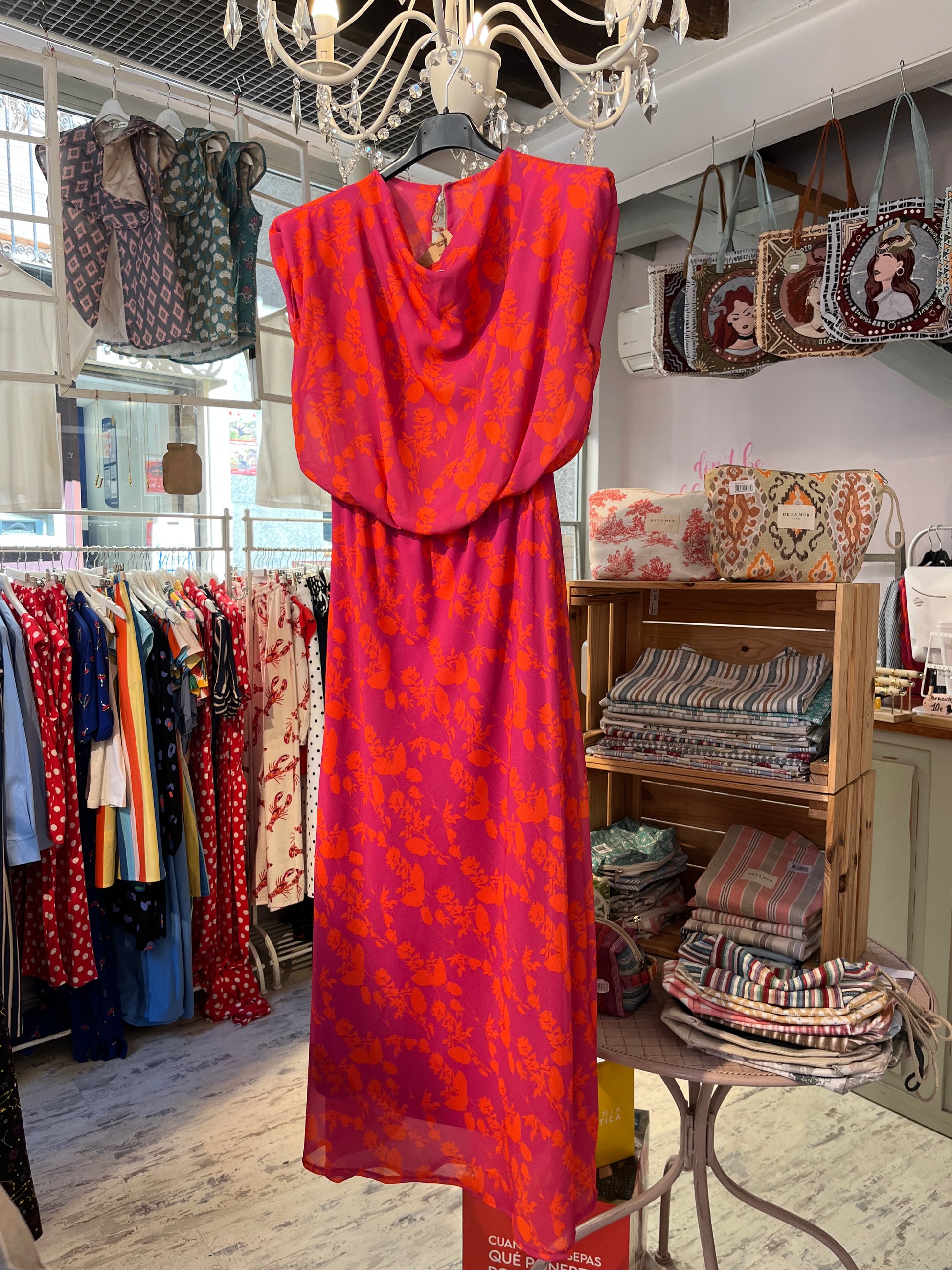 Fuchsia dress with orange flower print.