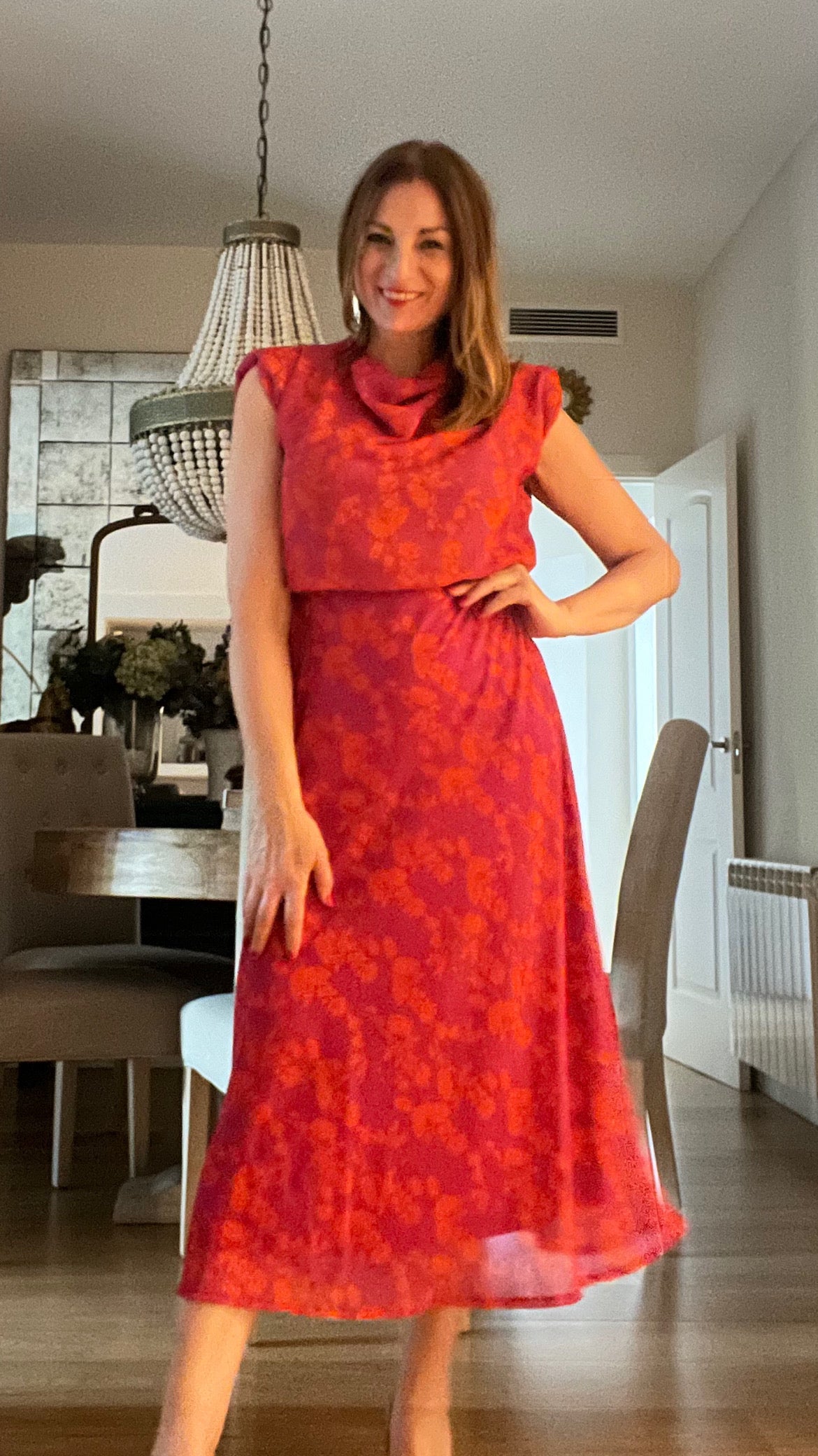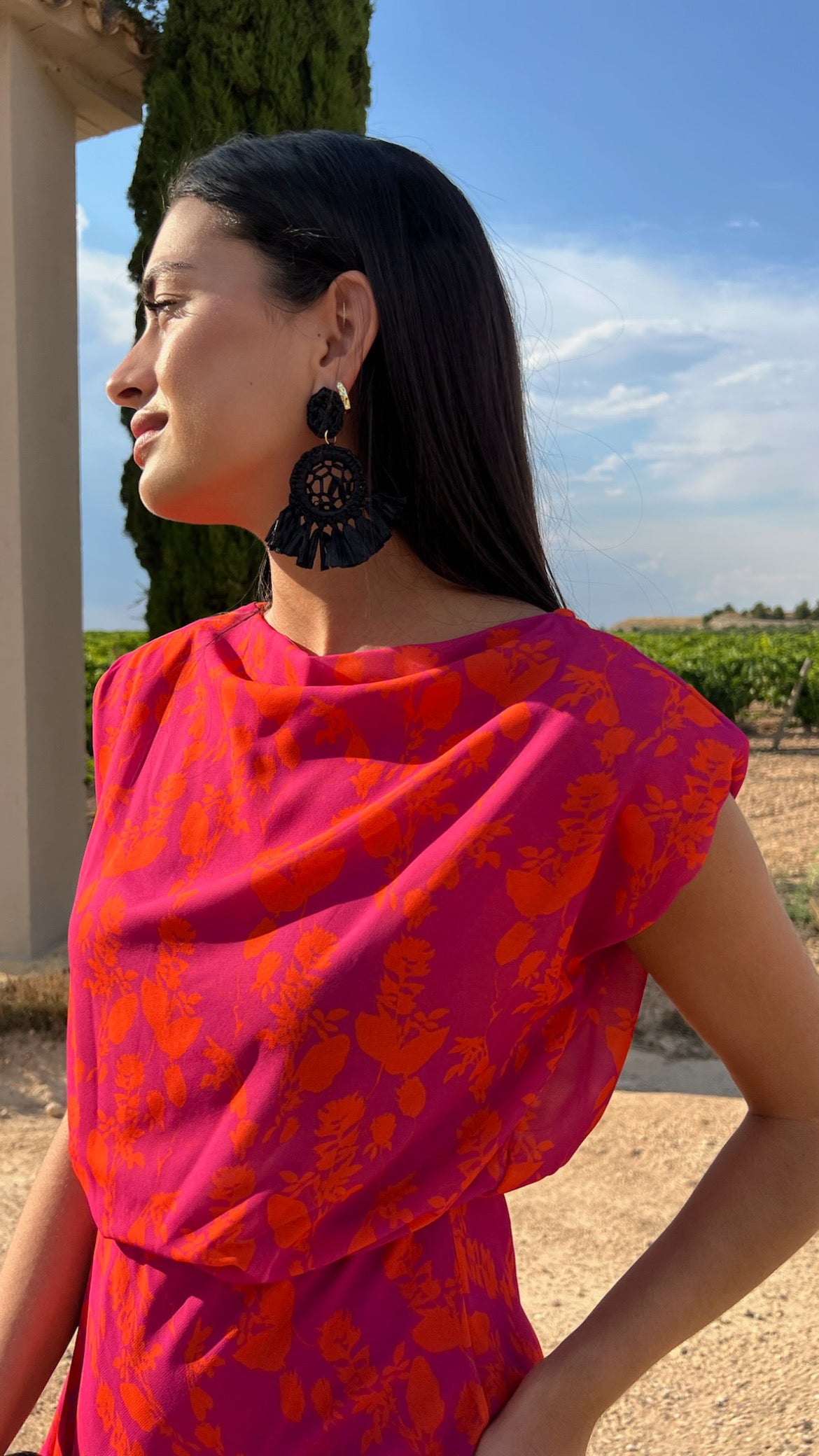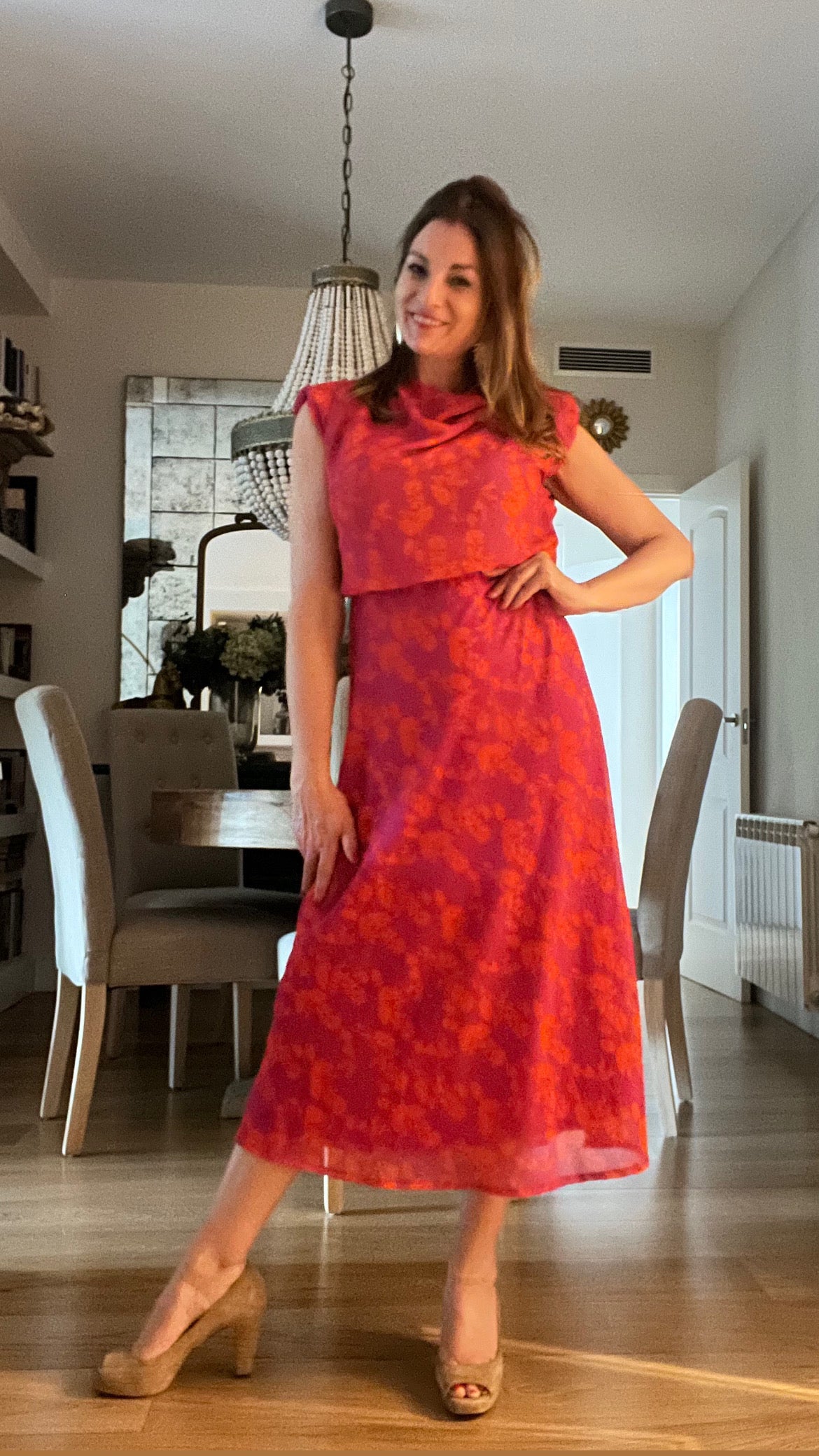 Fuchsia dress with orange flower print.