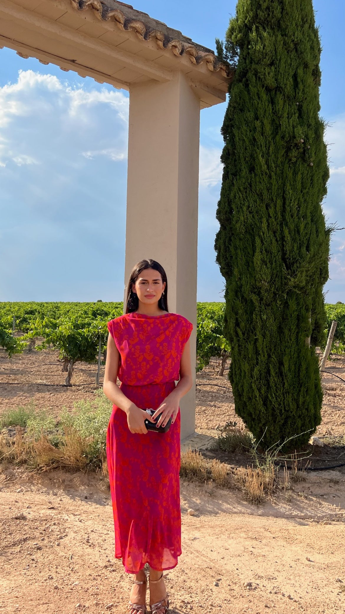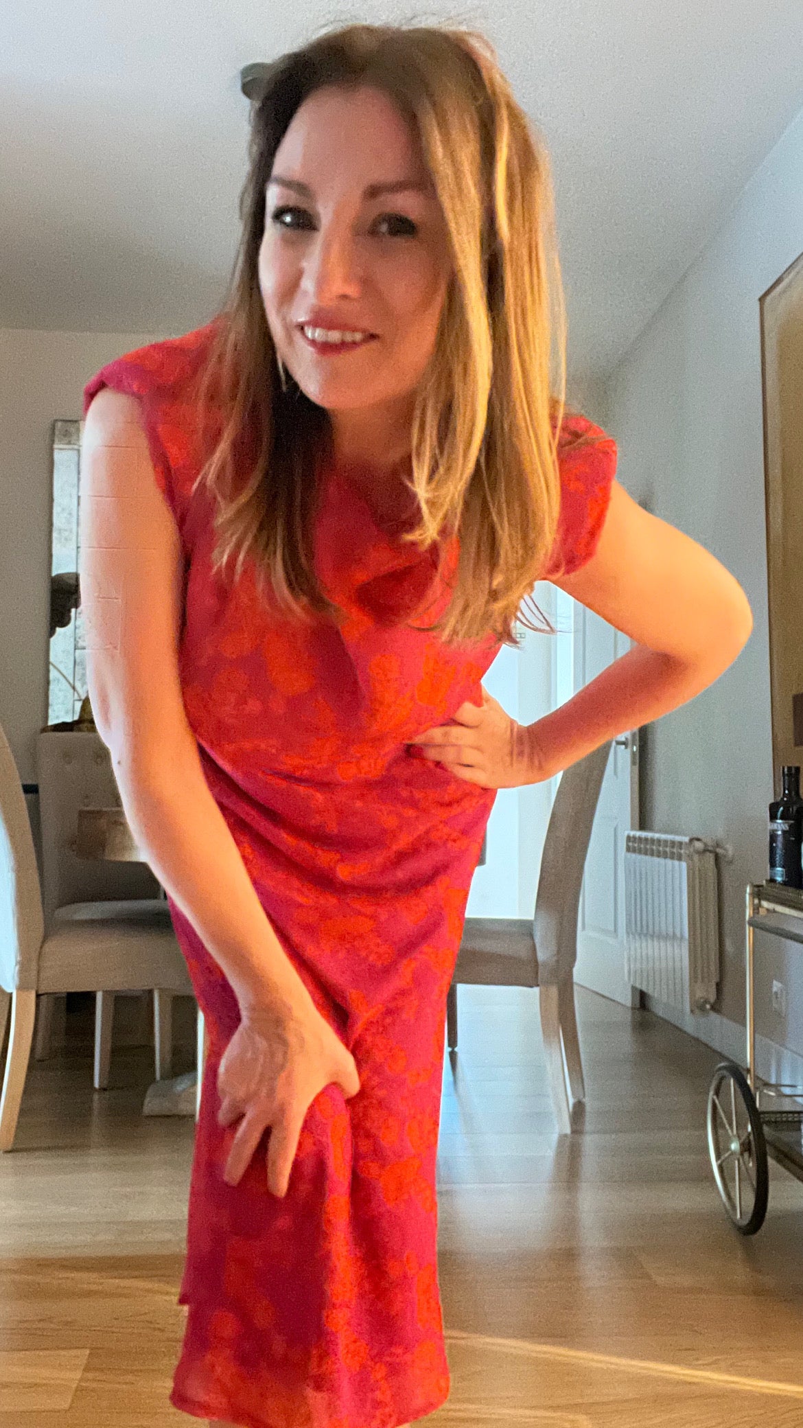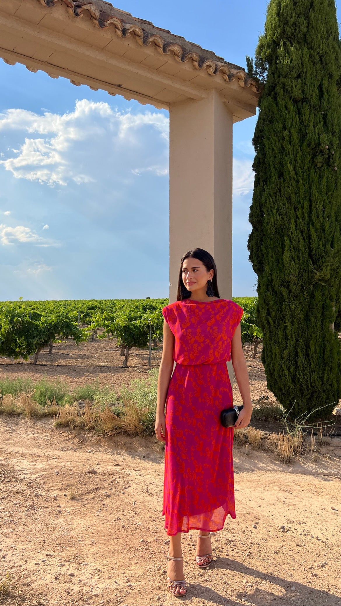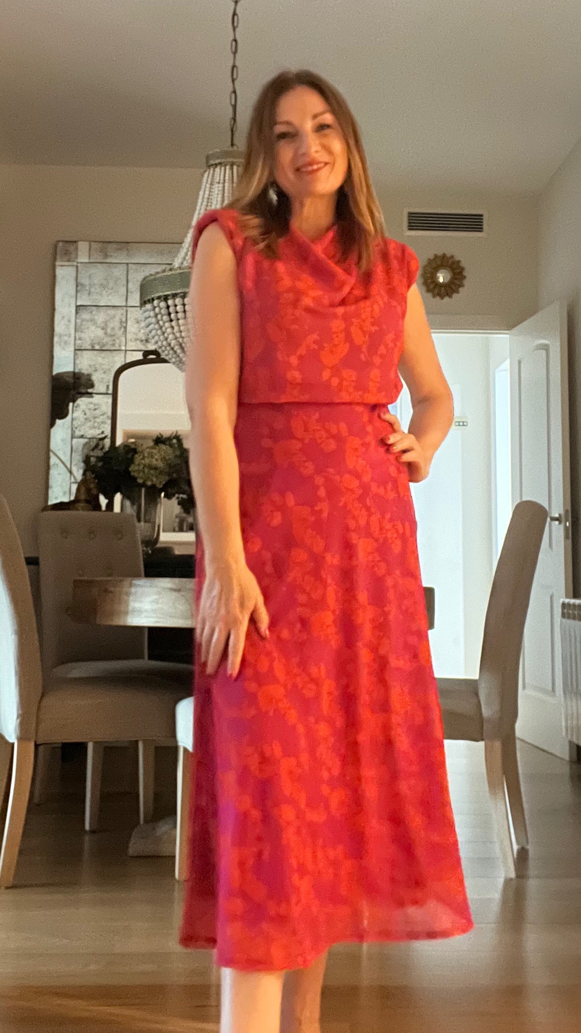 Fuchsia dress with orange flower print.