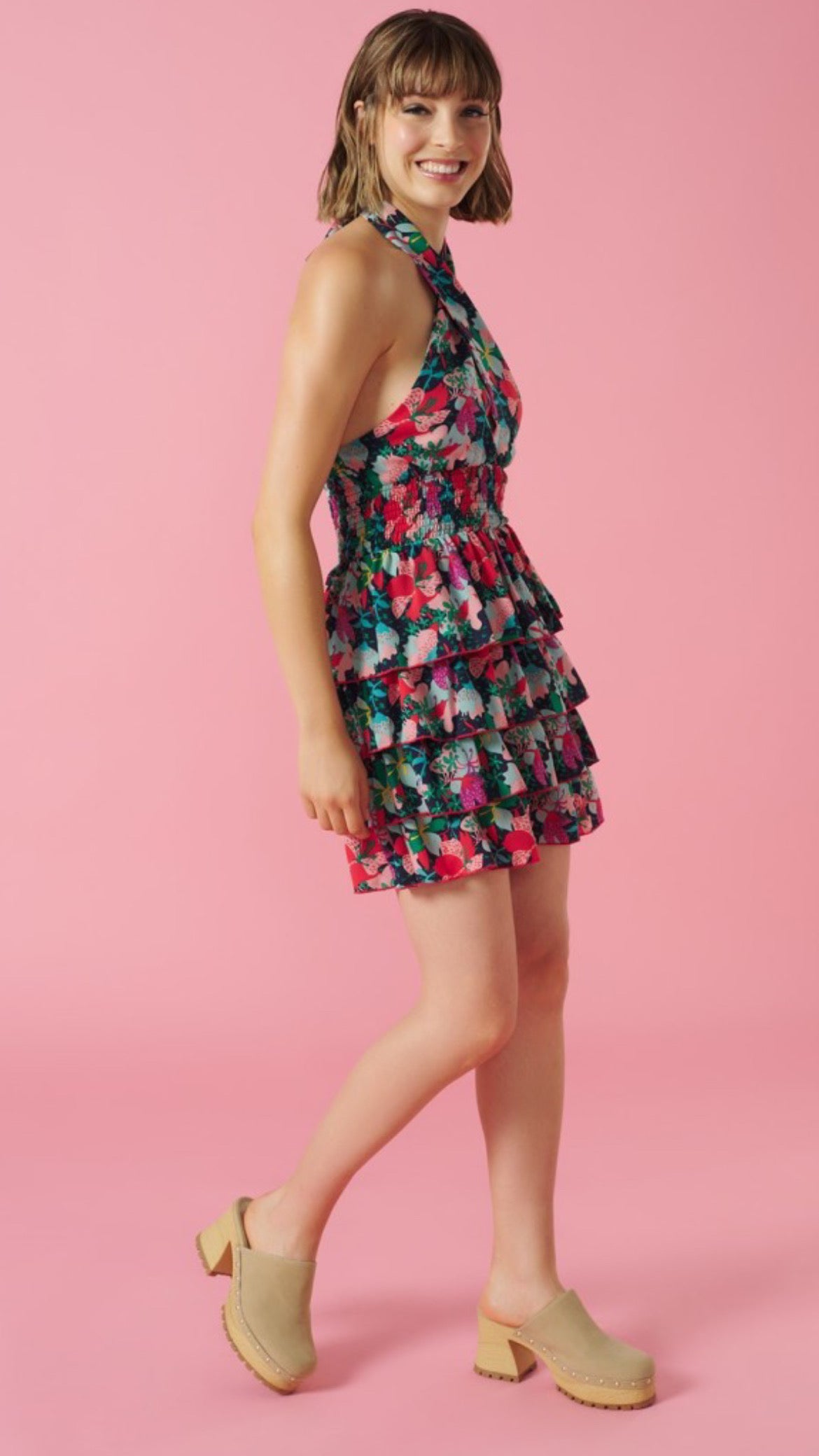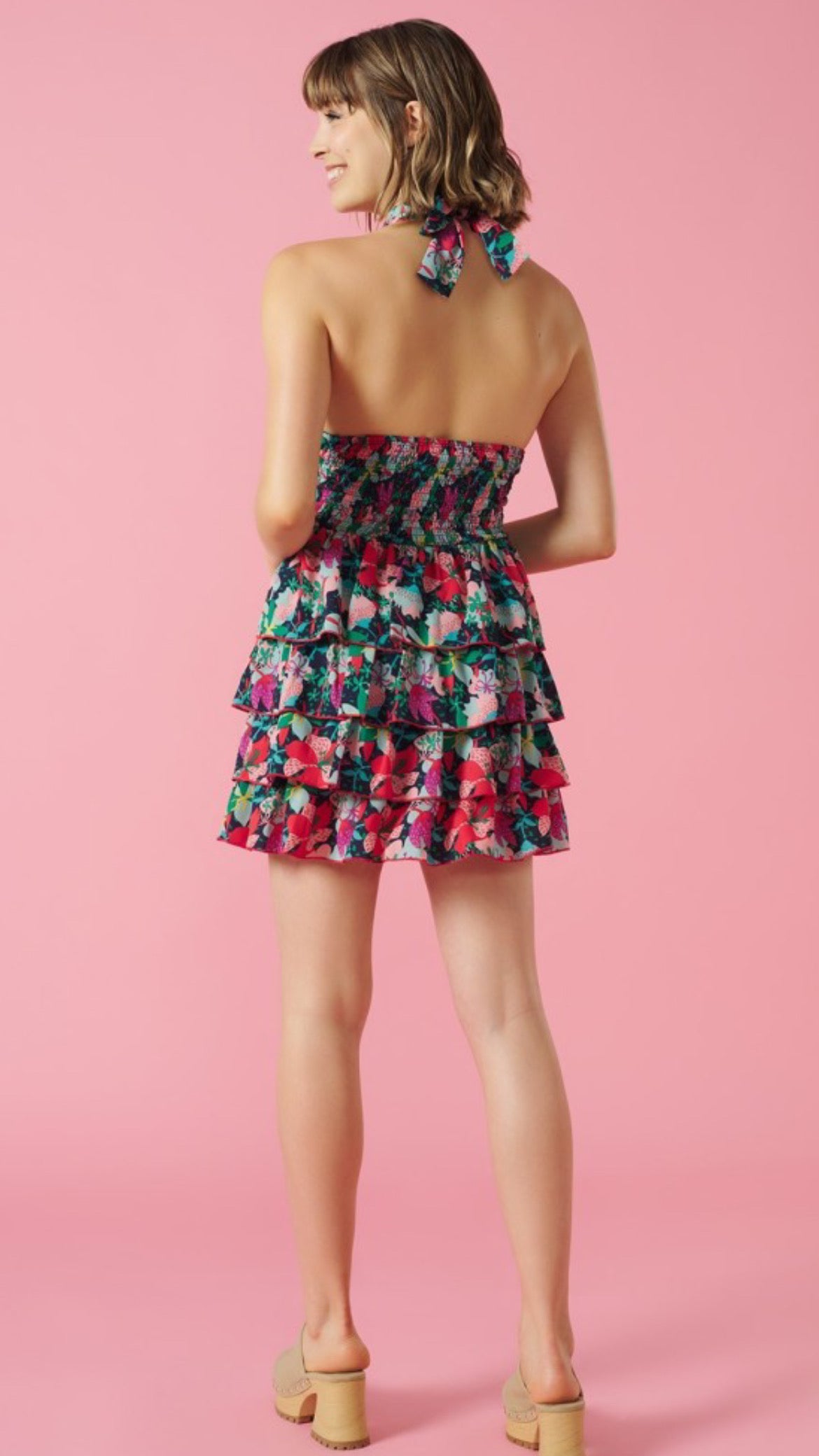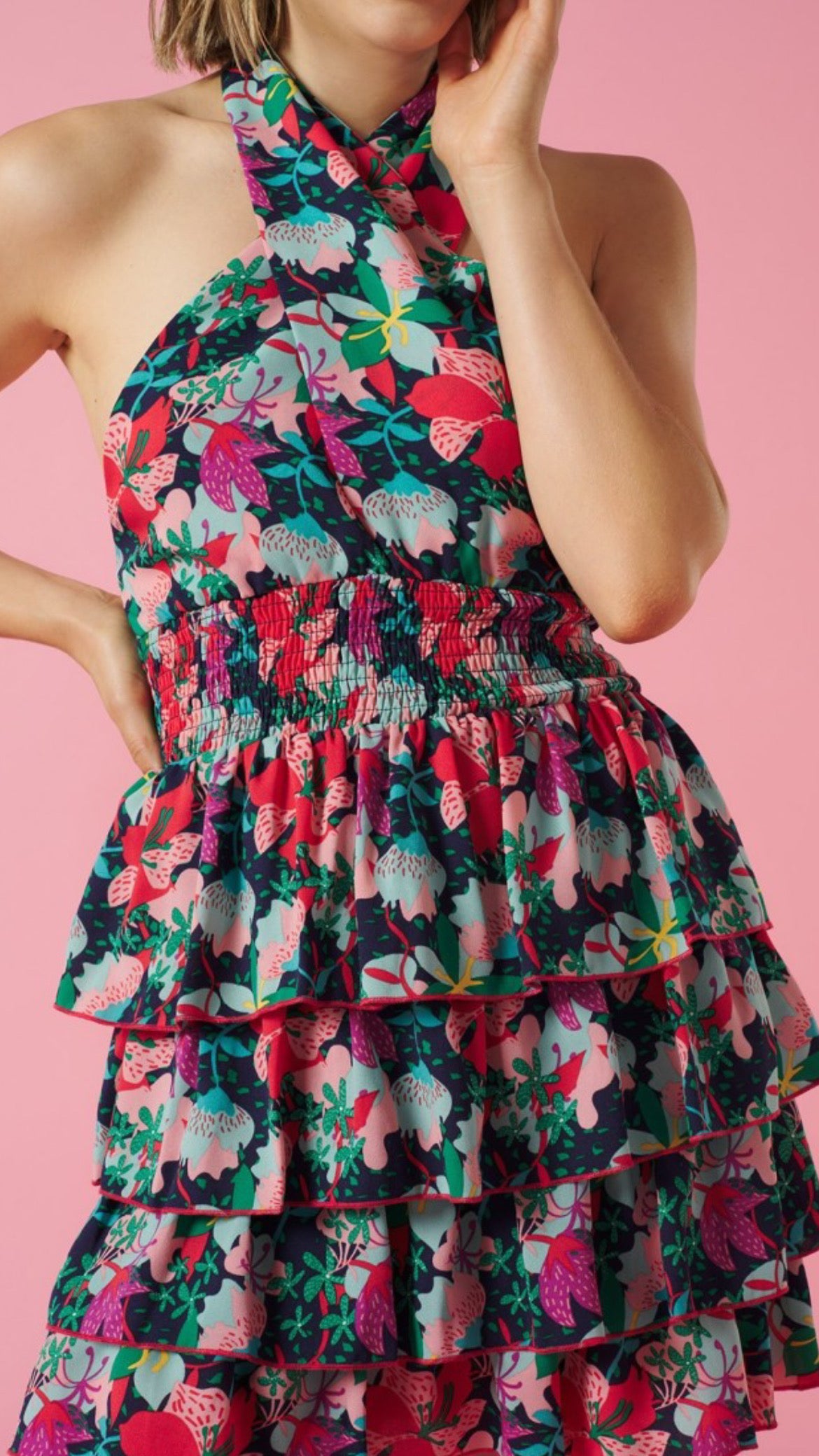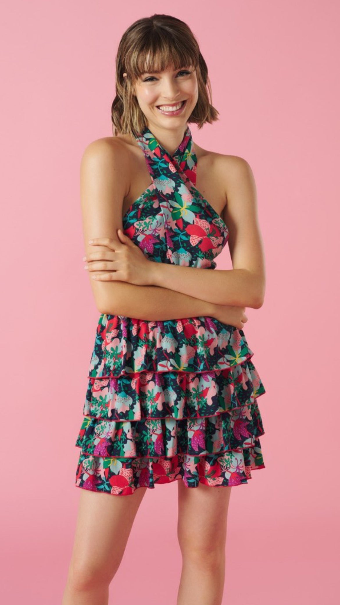 Short dress with a halter neck that crosses over the chest and a ruffled skirt.