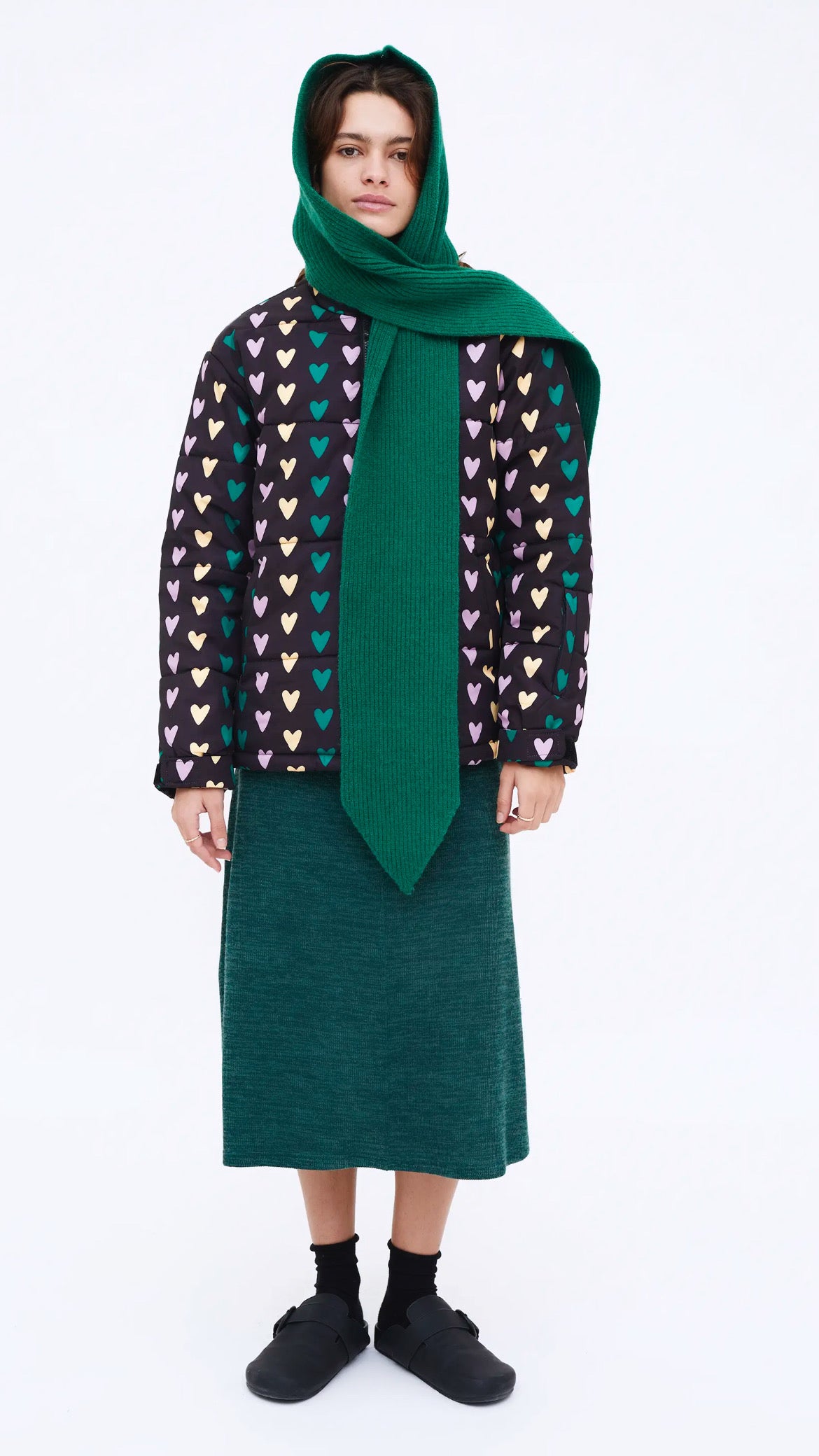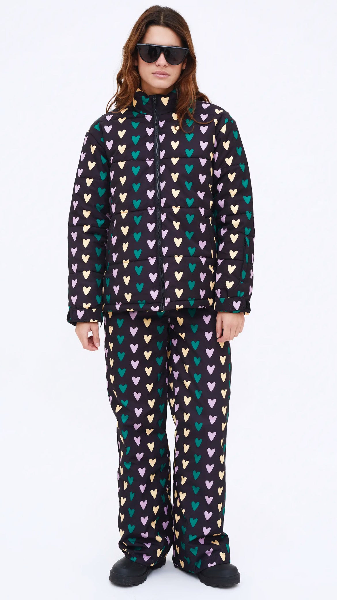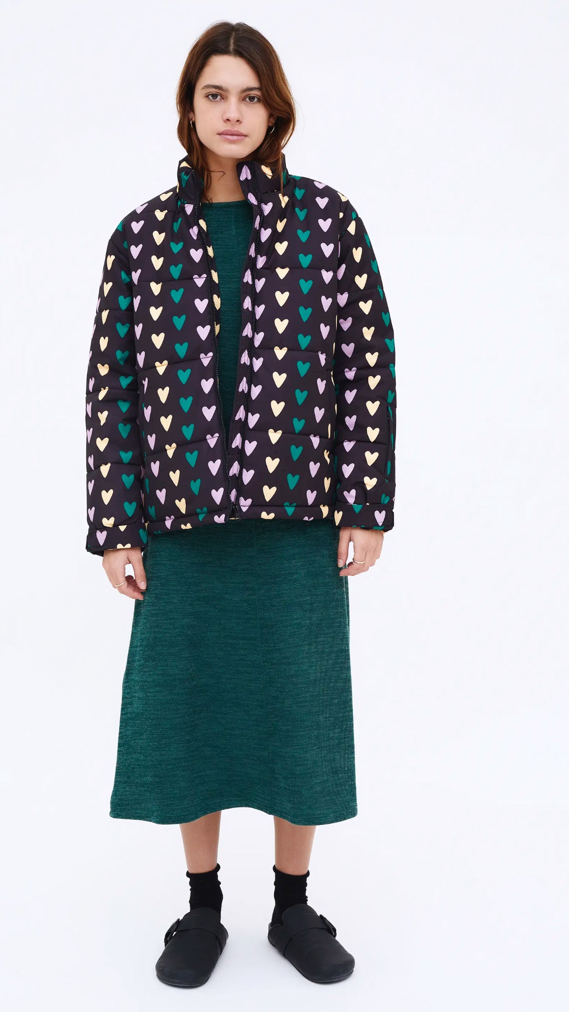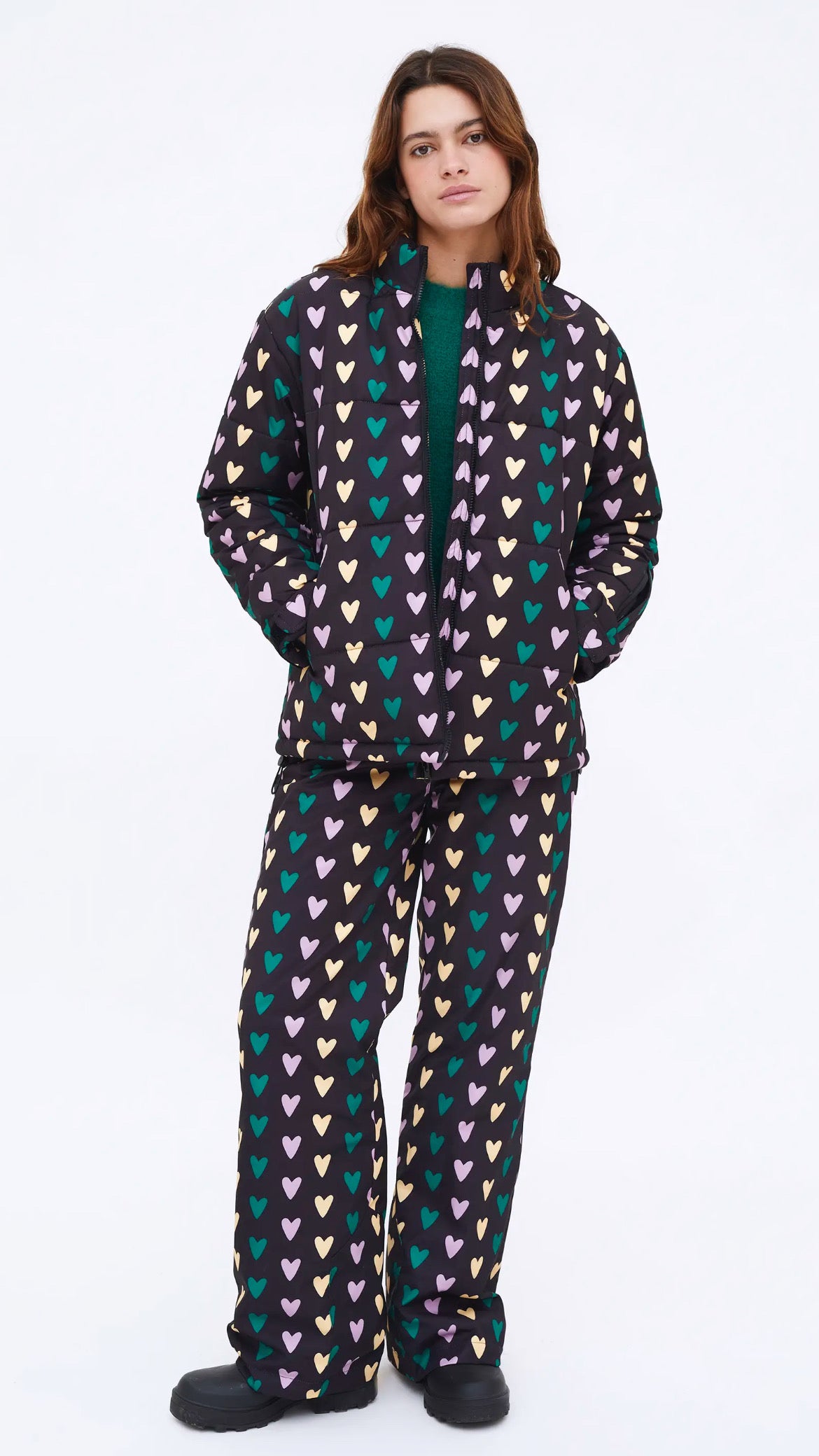 Abrígate con estilo con esta chaqueta de fondo negro y estampado de corazones en tonos lilas, verdes y beige 💜💚🤍. Su diseño acolchado y cierre frontal con cremallera la convierten en la opción perfecta para los días fríos sin renunciar al toque divertido y romántico de su print.