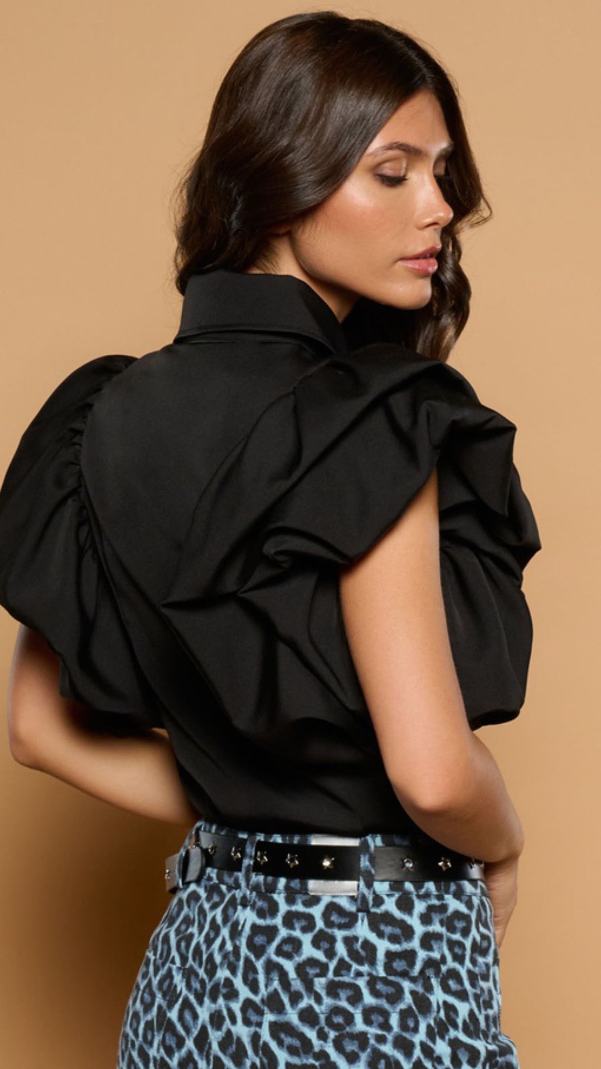 Blusa negra, con cuello camisero y espectaculares mangas cortas abullonadas con volantes. Diseño estructurado que estiliza la silueta y aporta un toque sofisticado y femenino. Cierre frontal con botón y tejido ligero de tacto agradable. Ideal para looks de invitada, oficina o eventos especiales.