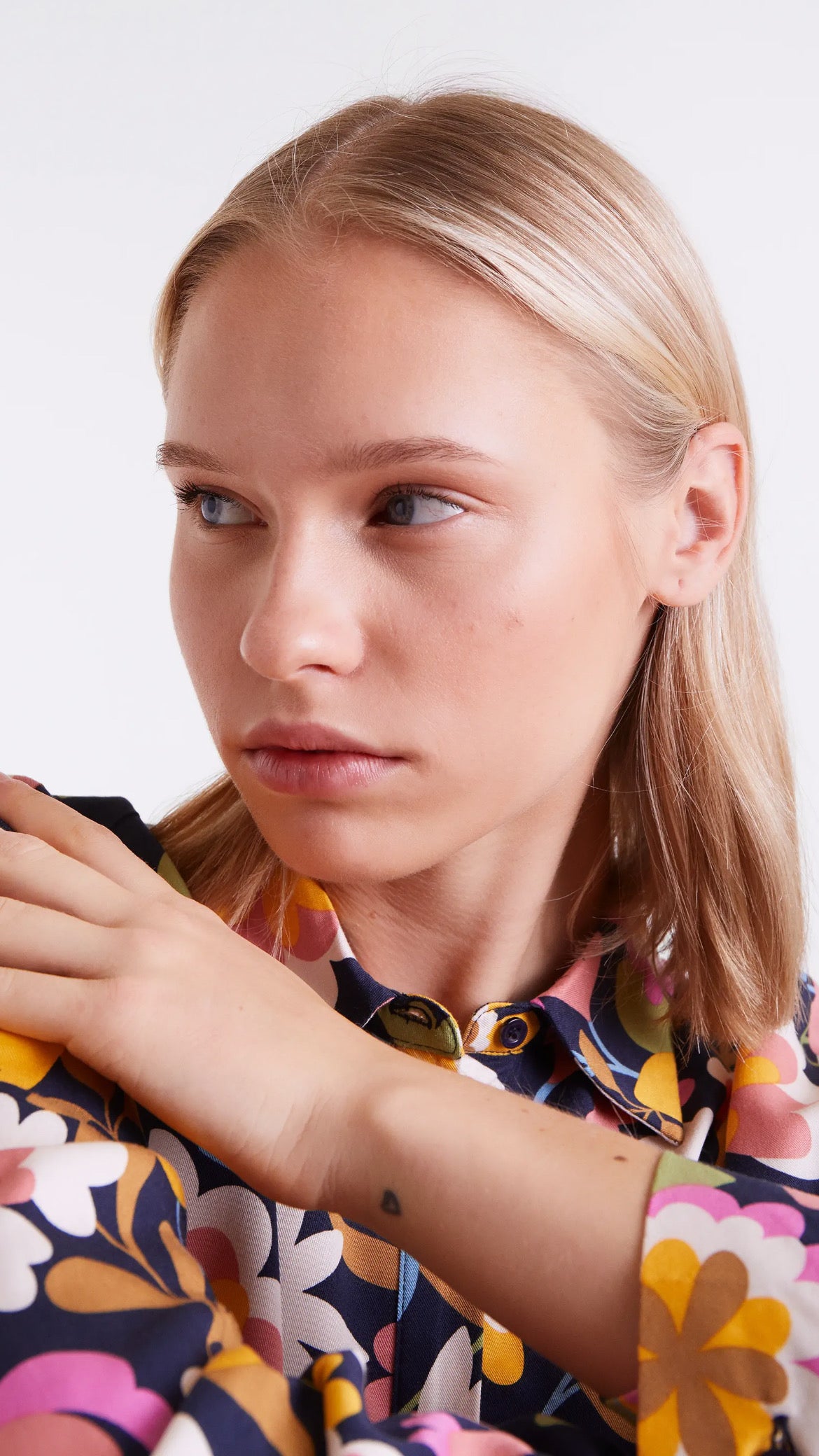 Camisa de manga larga con estampado floral Baboushka en tonos vibrantes 🌸💛💙 sobre fondo oscuro. De corte clásico con cuello camisero y botones frontales, es la prenda perfecta para darle un aire fresco y divertido a tu look diario.