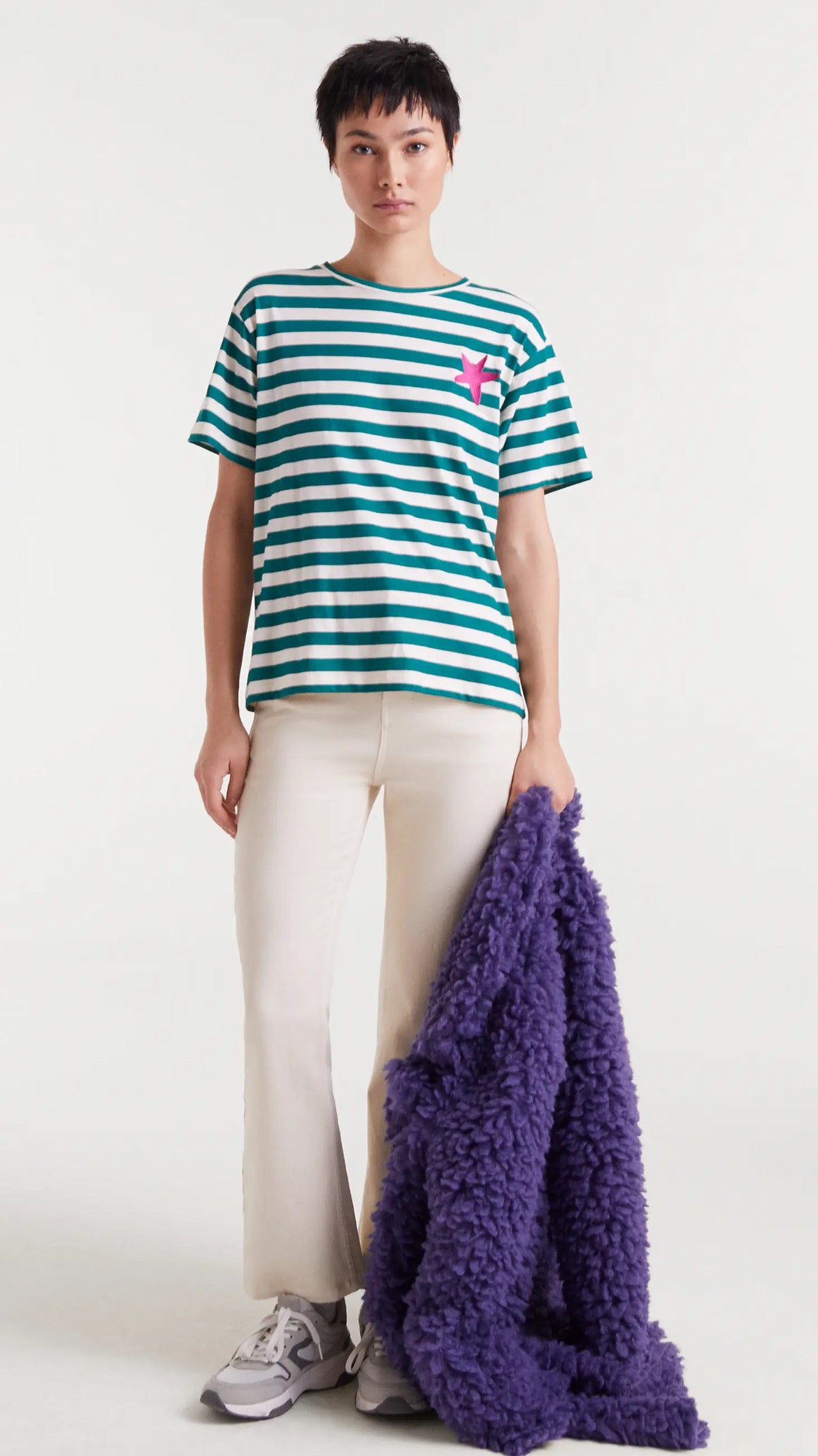 Un clásico marinero con un giro inesperado 💚🤍✨. La camiseta de rayas verdes y blancas está confeccionada en 100% algodón suave y transpirable, y se adorna con un bordado de estrella en rosa fucsia que aporta el toque divertido y diferente. Su corte recto y relajado la convierte en la aliada perfecta para tus looks de diario.