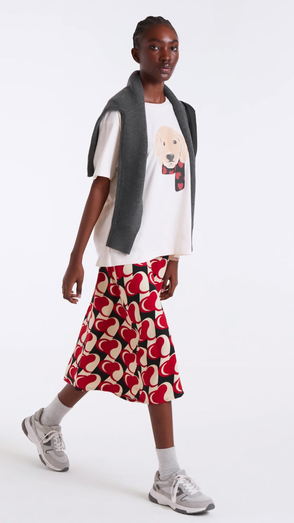 Dale un toque divertido y original a tu armario con esta camiseta de manga corta 100% algodón en color blanco roto. Su protagonista es un adorable perrito ilustrado con bufanda de corazones, que convierte una prenda básica en un look lleno de personalidad.