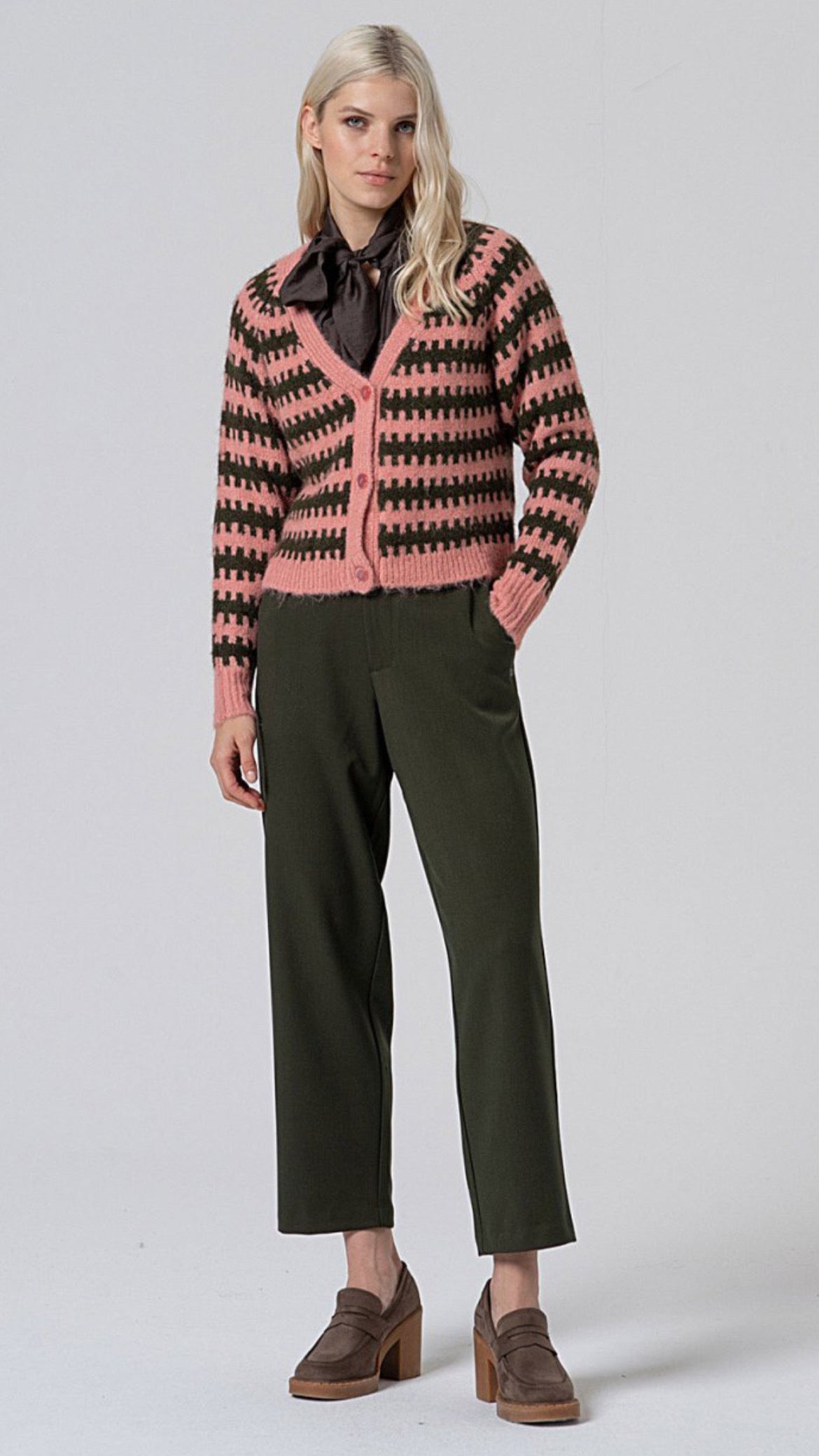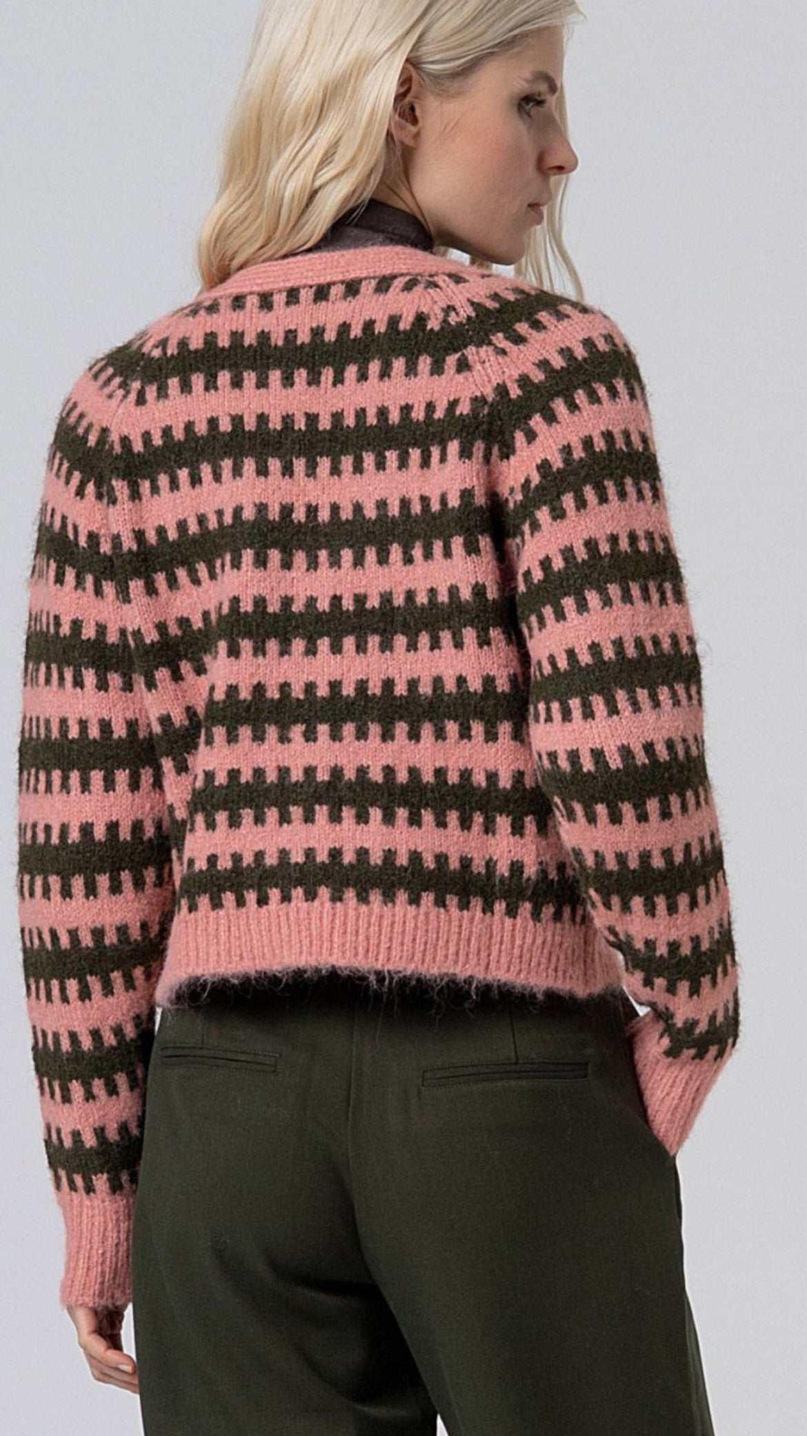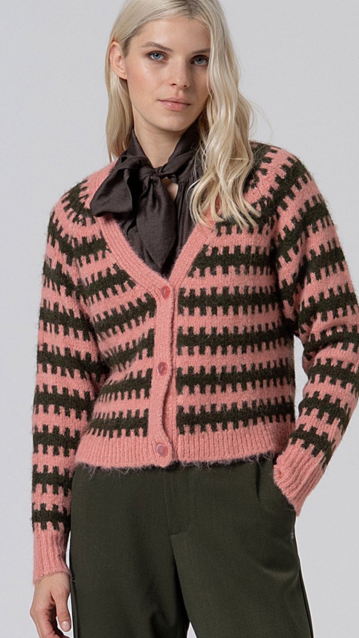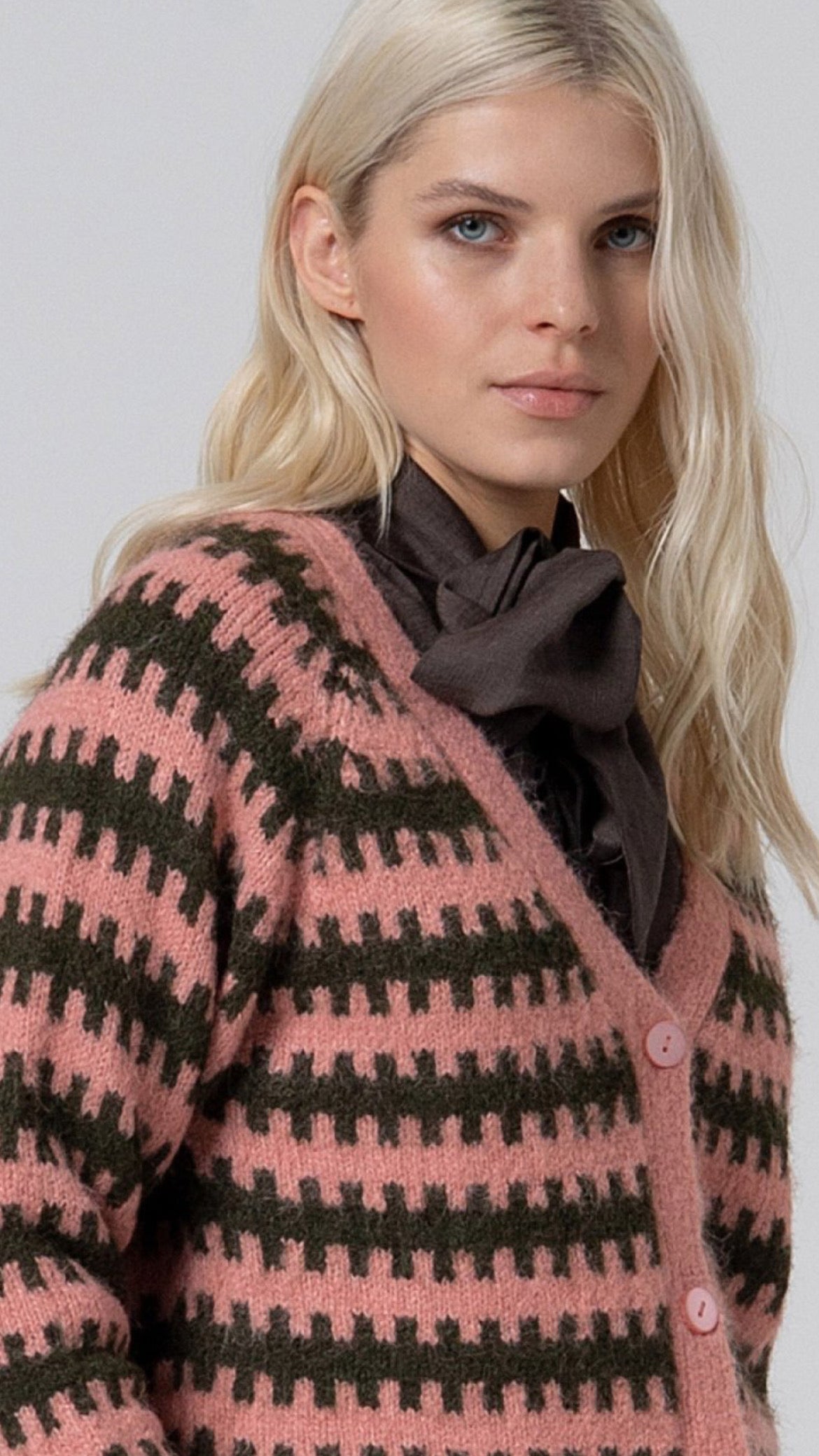 Este cárdigan rosa con rayas verdes y tres botones es la mezcla perfecta entre calidez, estilo y confort. Su diseño de punto suave con tacto esponjoso y su patrón geométrico en contraste le dan un aire retro pero totalmente actual.