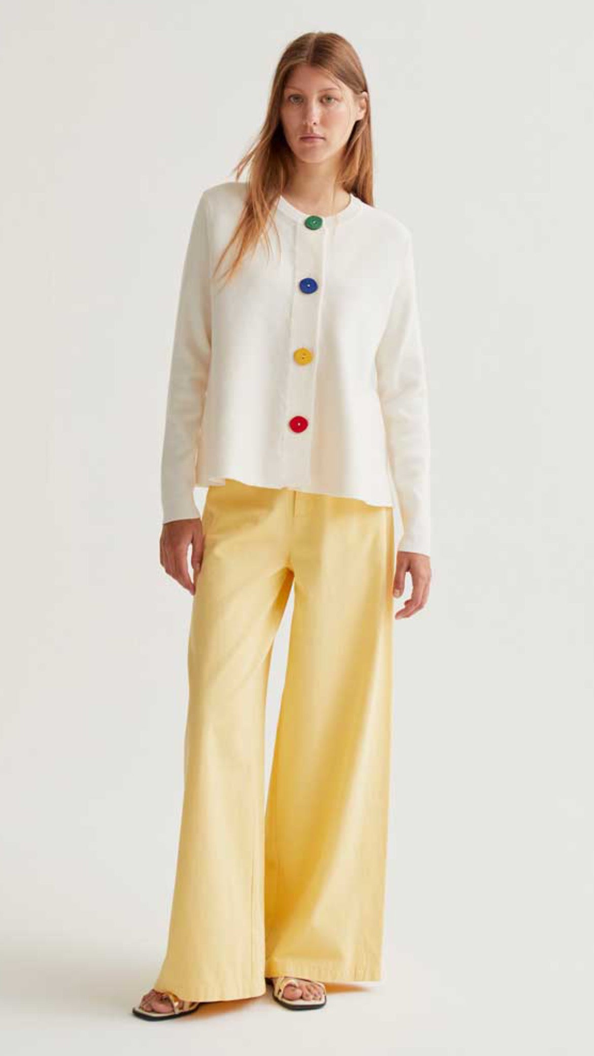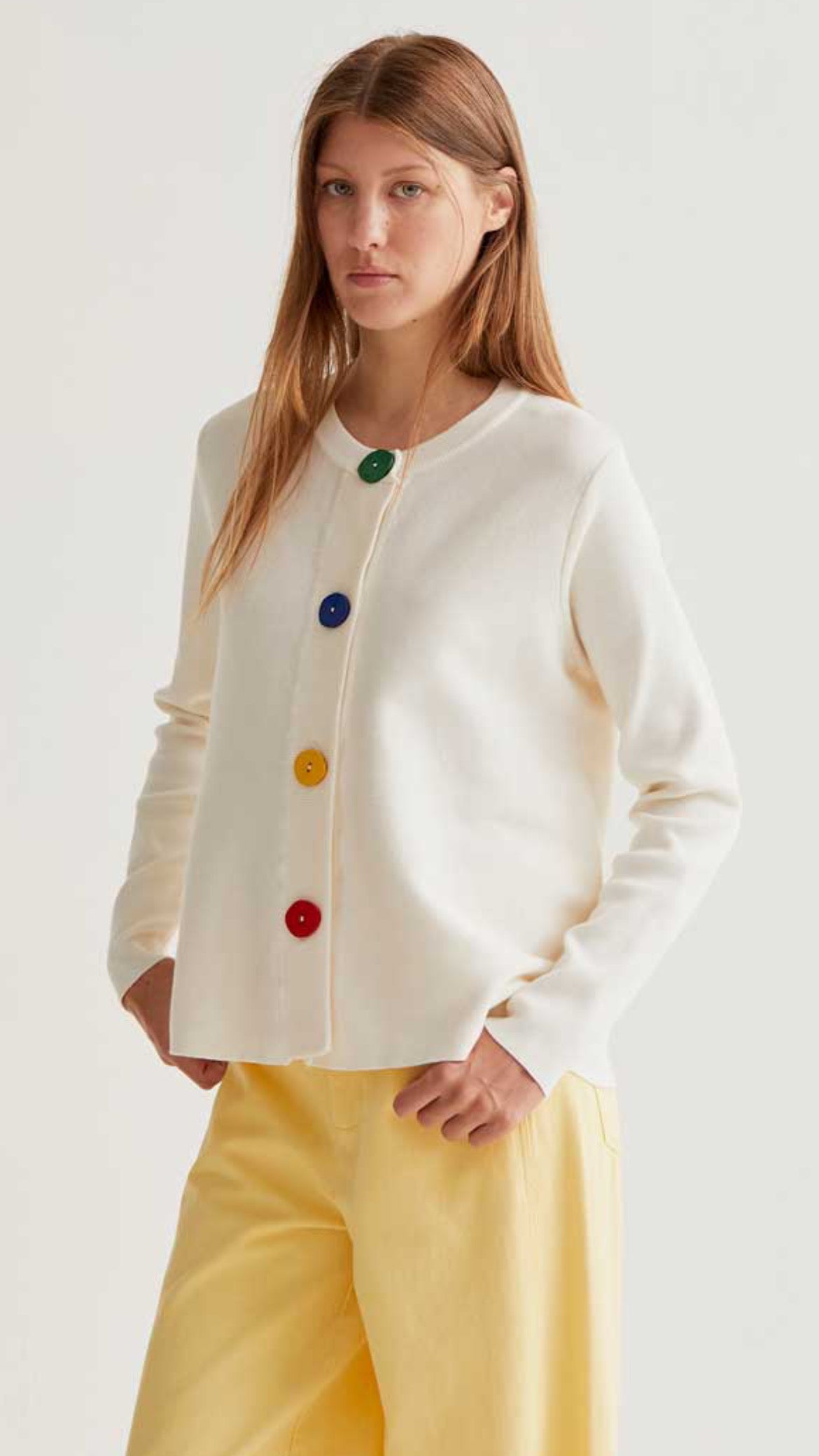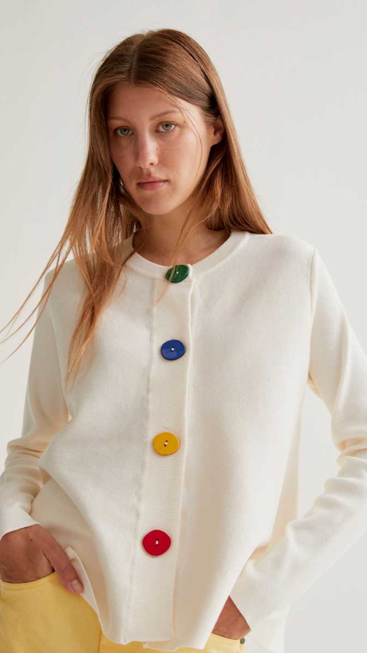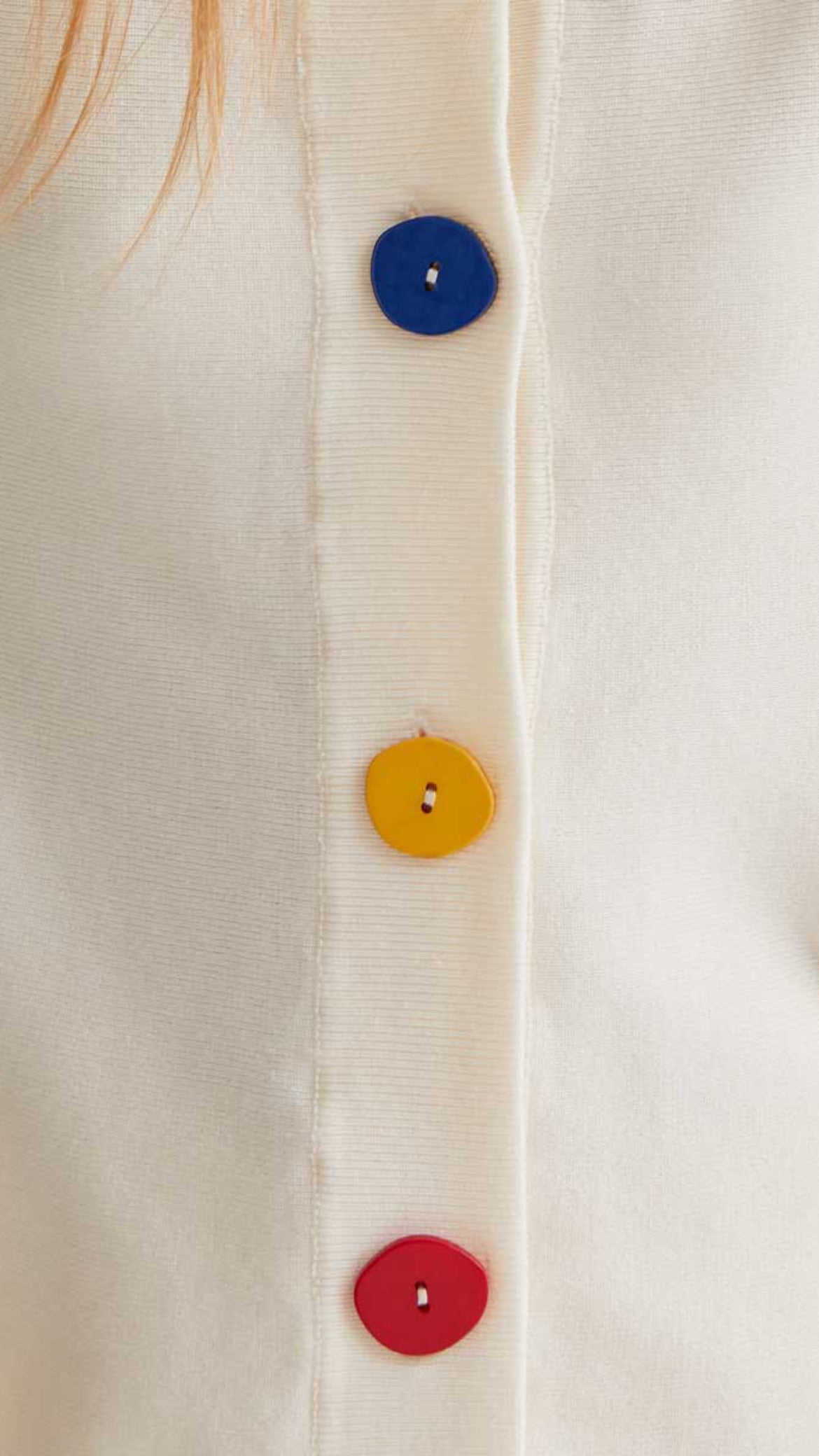 Lo que podría ser un básico se convierte en una pieza con personalidad gracias a esos botones joya en verde, azul, amarillo y rojo. Como pequeñas pinceladas de color sobre un lienzo neutro.