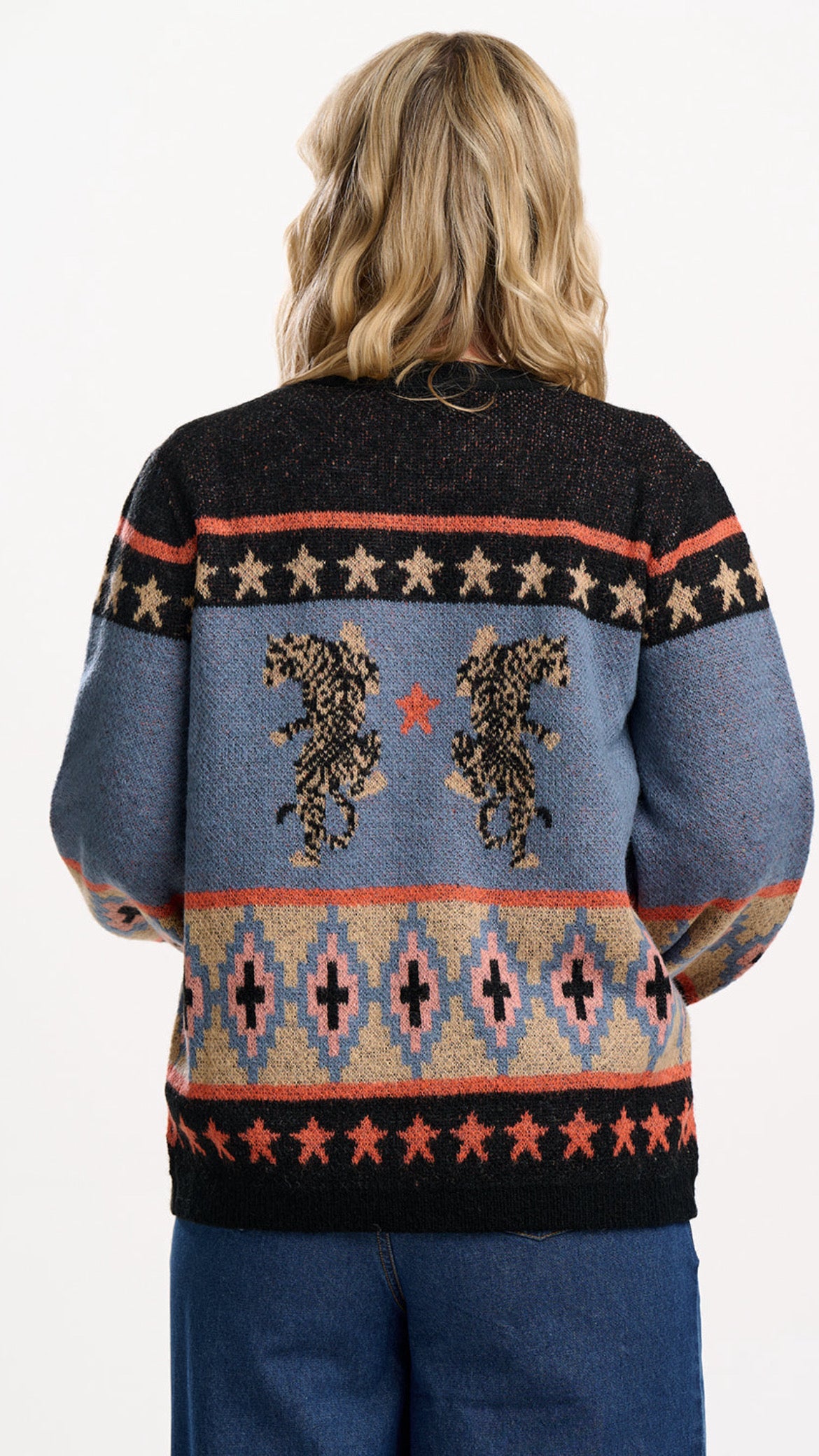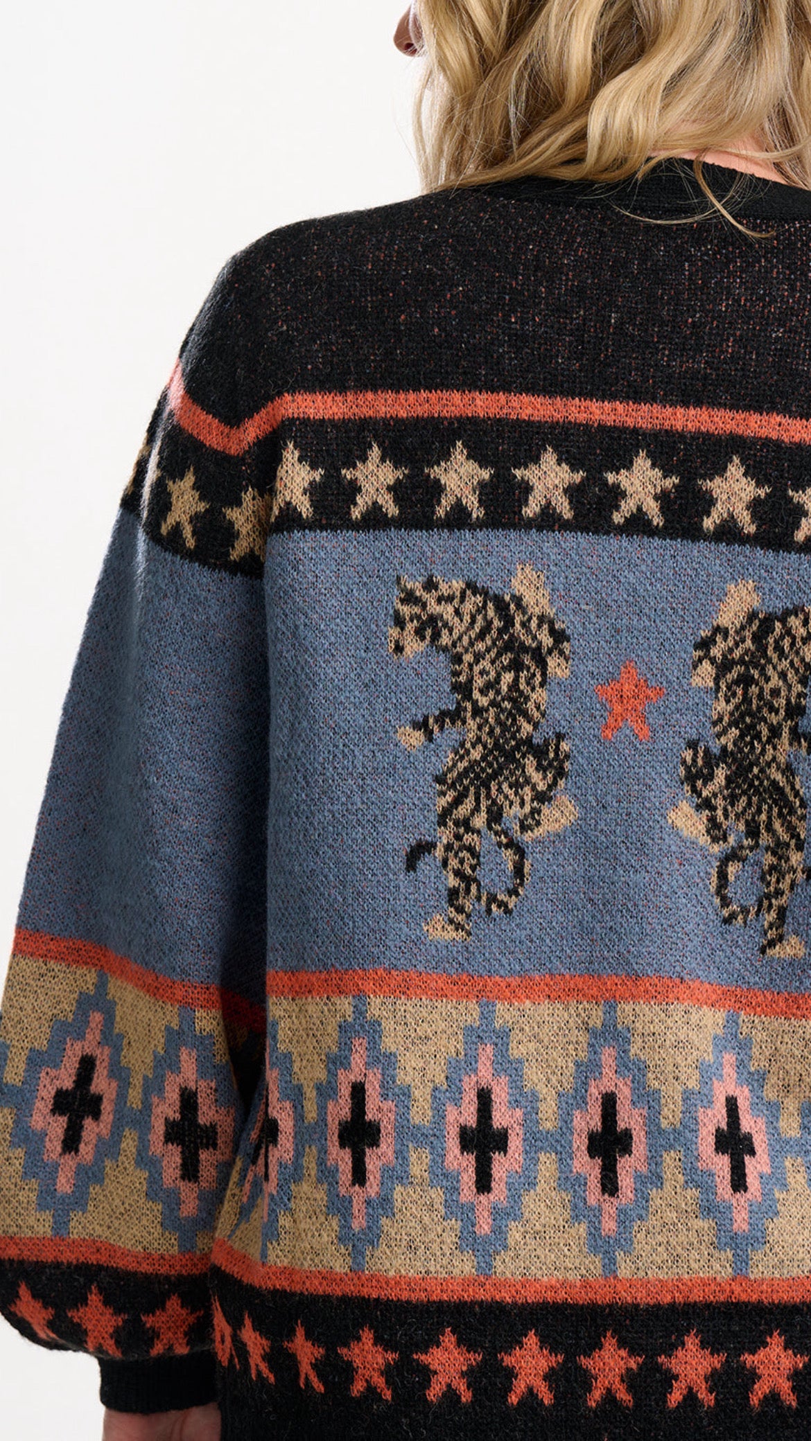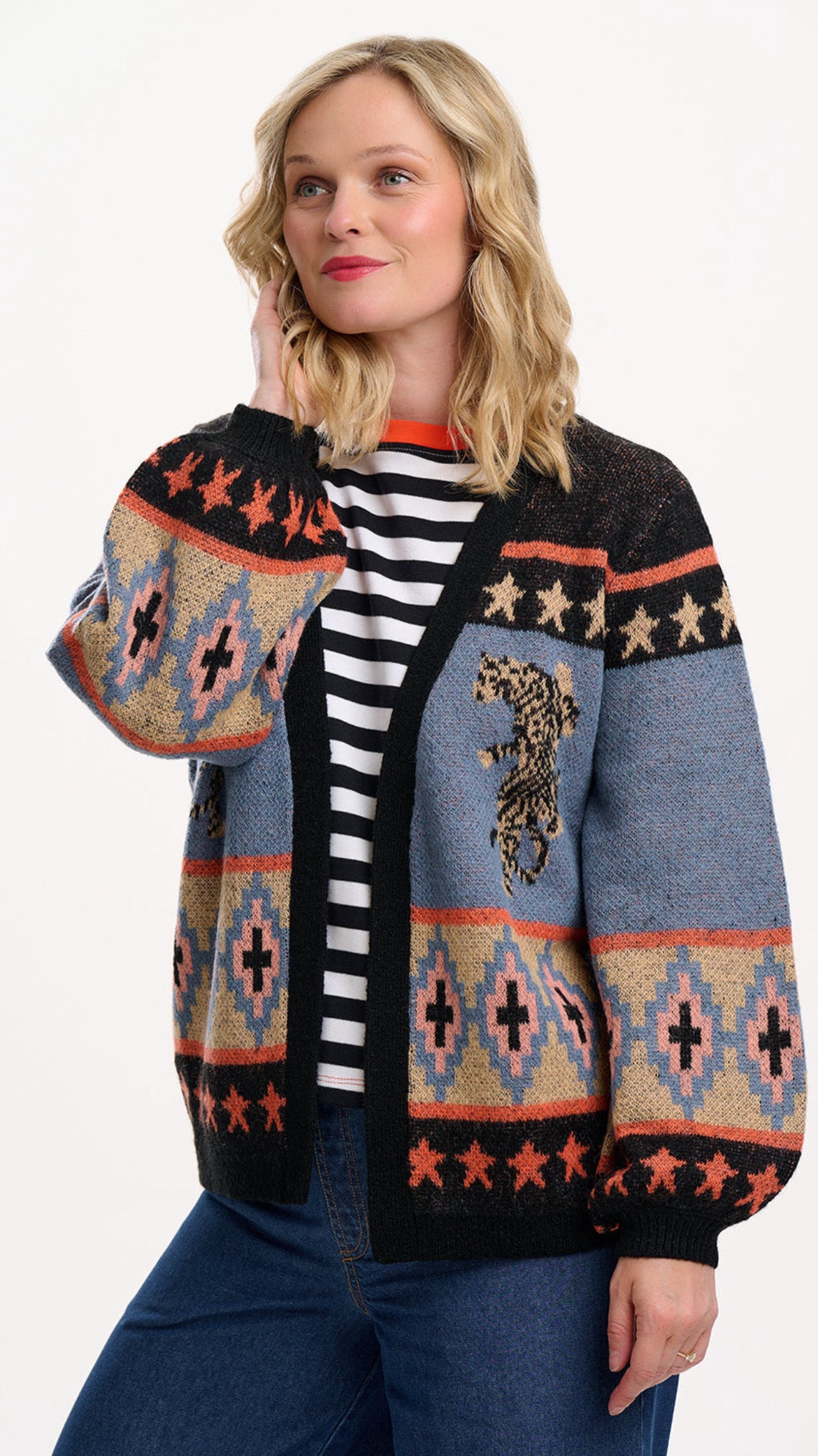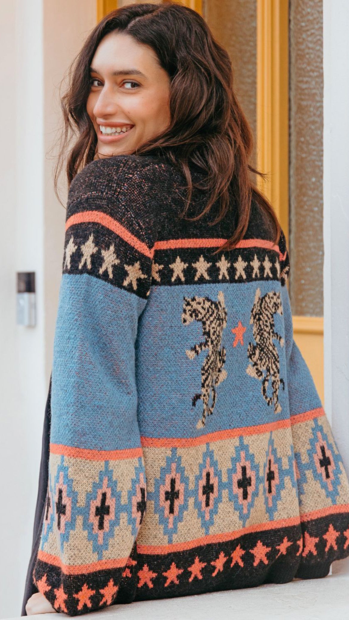 El cárdigan Yvette combina un estilo relajado con un toque western muy especial. Su diseño sin cierres hace que caiga con naturalidad, perfecto para llevar abierto tanto como cárdigan como chaqueta ligera. Destaca por su mezcla de tonos azul, naranja y marrón sobre fondo negro, rematada con un divertido motivo de tigres en la espalda y mangas abullonadas que le dan personalidad.