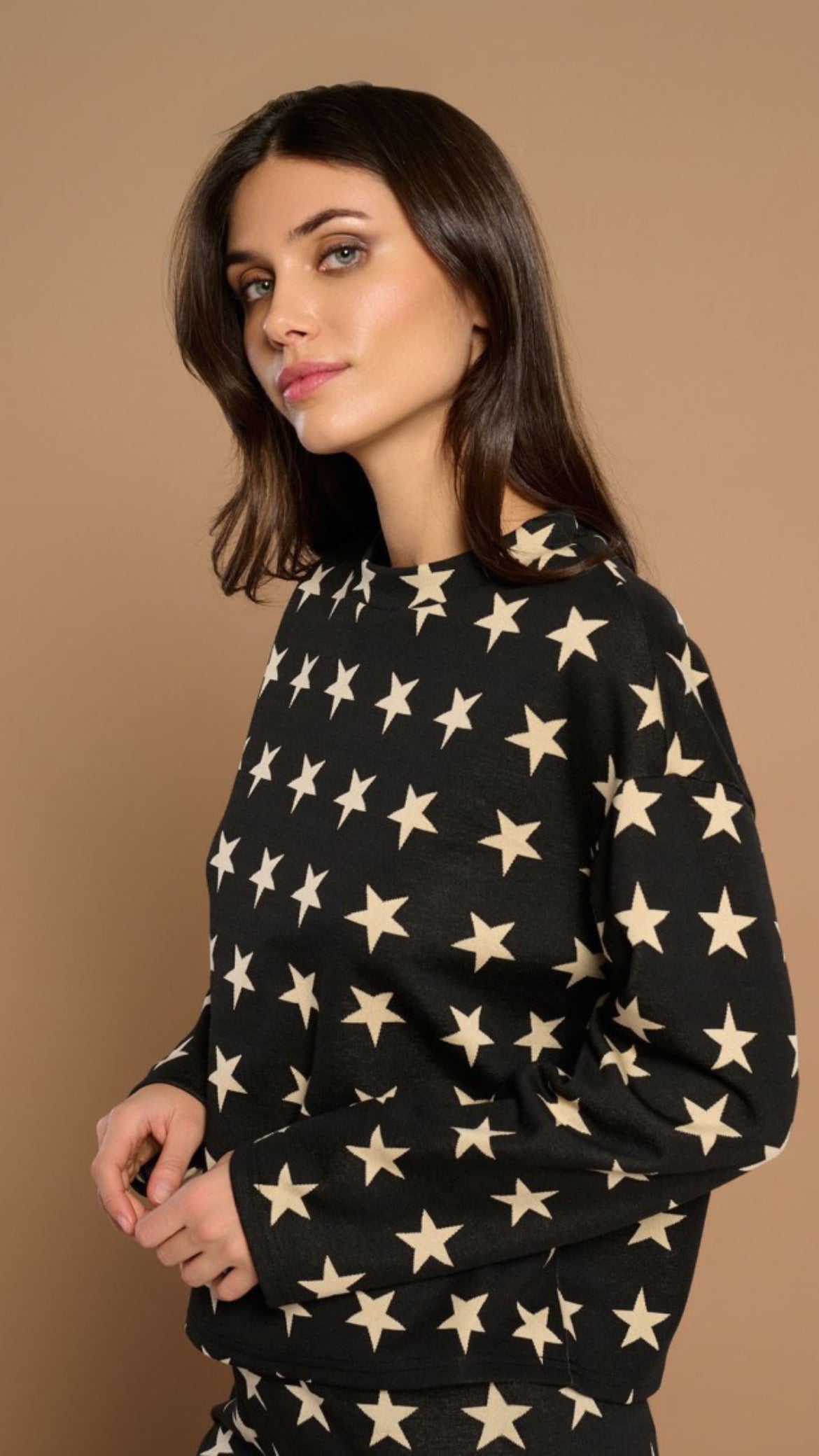 Su diseño en color negro con estrellas beige le da un aire divertido y contemporáneo, ideal para combinar con vaqueros, faldas o incluso con su pantalón a juego para un look coordinado y diferente.