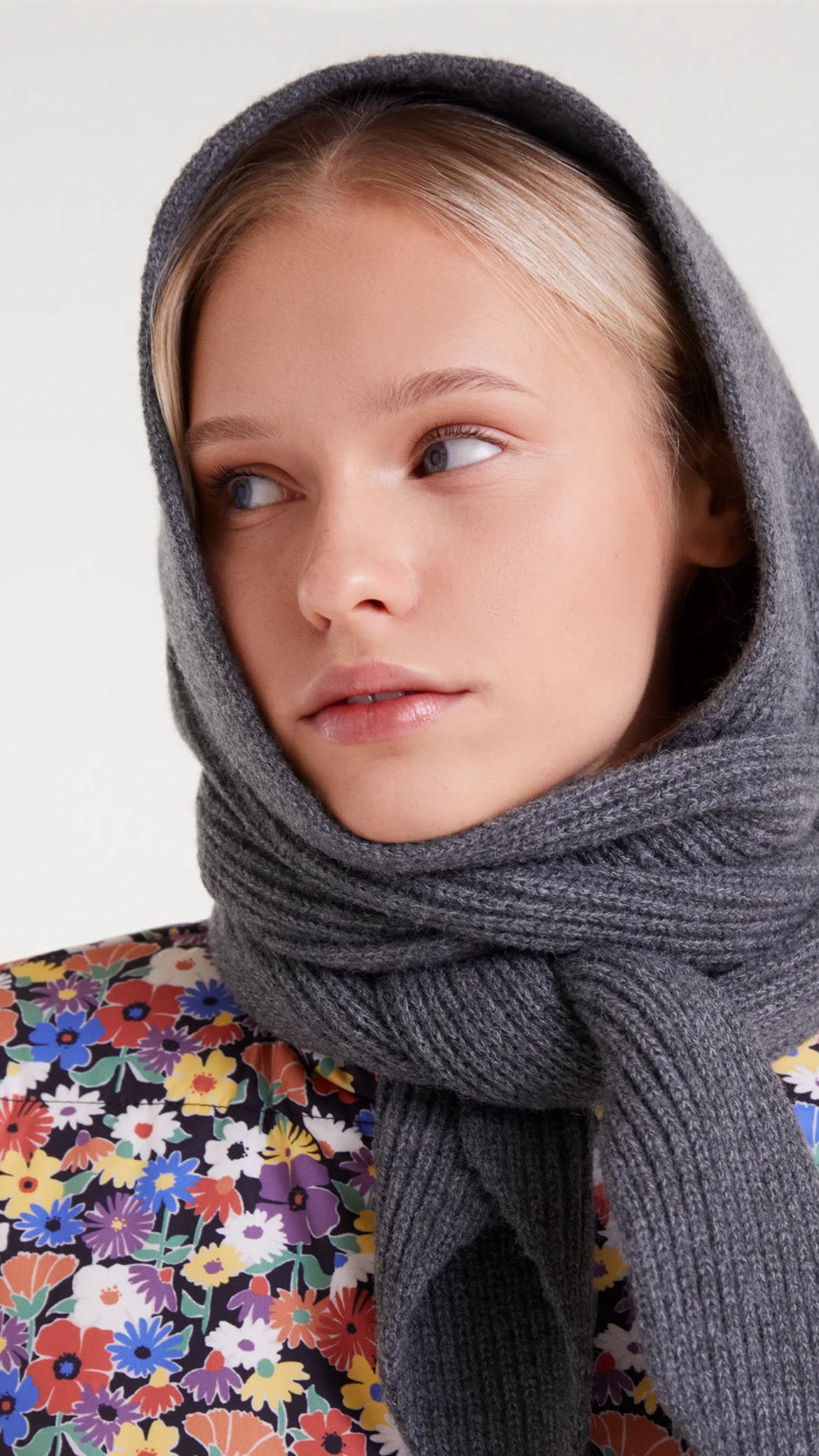Protege tu estilo y tu comodidad con este gorro beanie gris con bufanda integrada, confeccionado en un suave punto acanalado que se adapta perfectamente a la cabeza y al cuello.