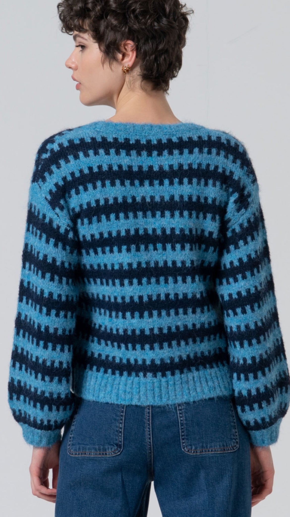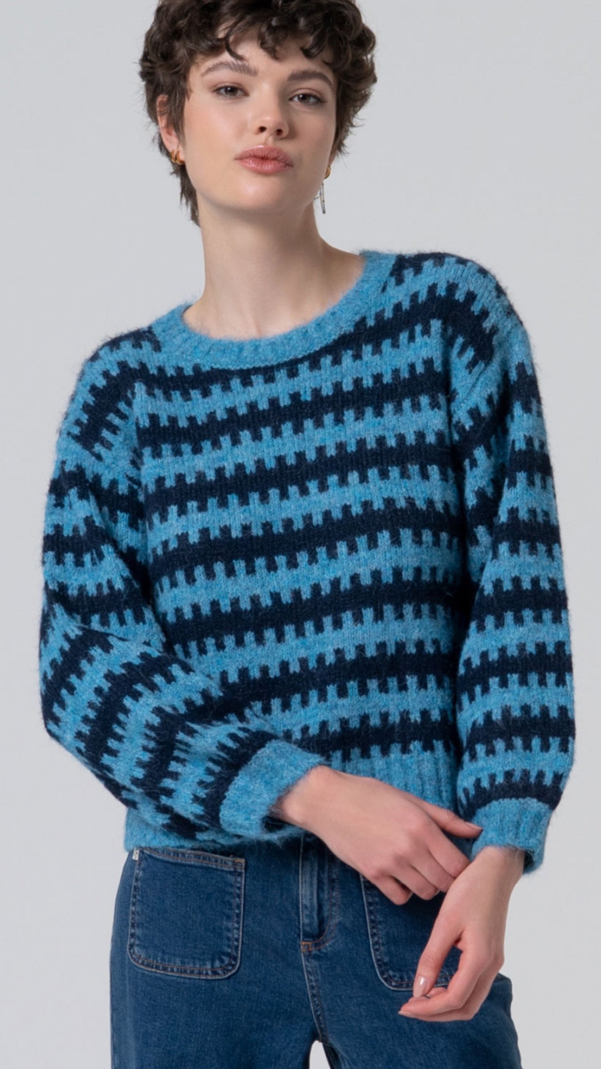 Su corte recto y hombro caído aportan una silueta relajada, mientras que las rayas en tonos azules añaden un toque moderno y fácil de combinar. Perfecto para llevar con vaqueros o faldas, y dar un aire fresco y contemporáneo a tus looks de temporada.