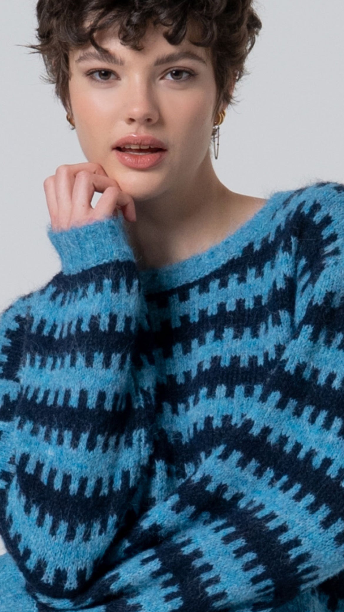 Este jersey de punto grueso bicolor combina comodidad, calidez y un diseño gráfico muy actual. Confeccionado en una mezcla de lana, poliéster reciclado y nylon, ofrece una textura suave y agradable al tacto que te mantendrá abrigada durante todo el invierno.