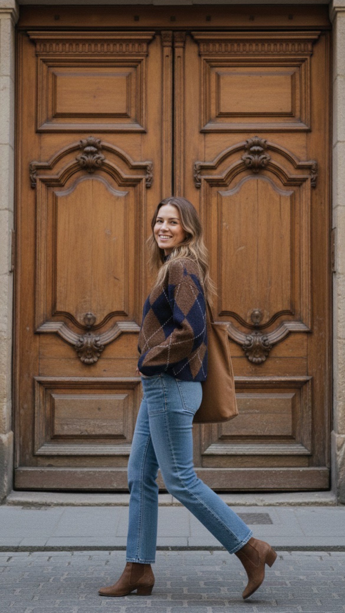 Jersey de punto grueso con diseño de rombos grandes en una combinación cálida de marrones y azul marino. Su tejido gordito aporta confort y abrigo, ideal para los días fríos sin renunciar al estilo. Un básico renovado que combina fácilmente con vaqueros, pantalones neutros o faldas midi.