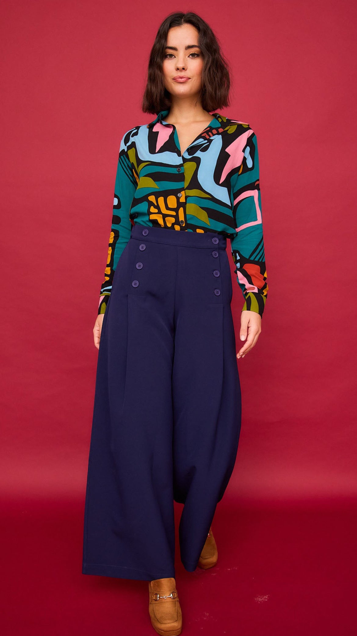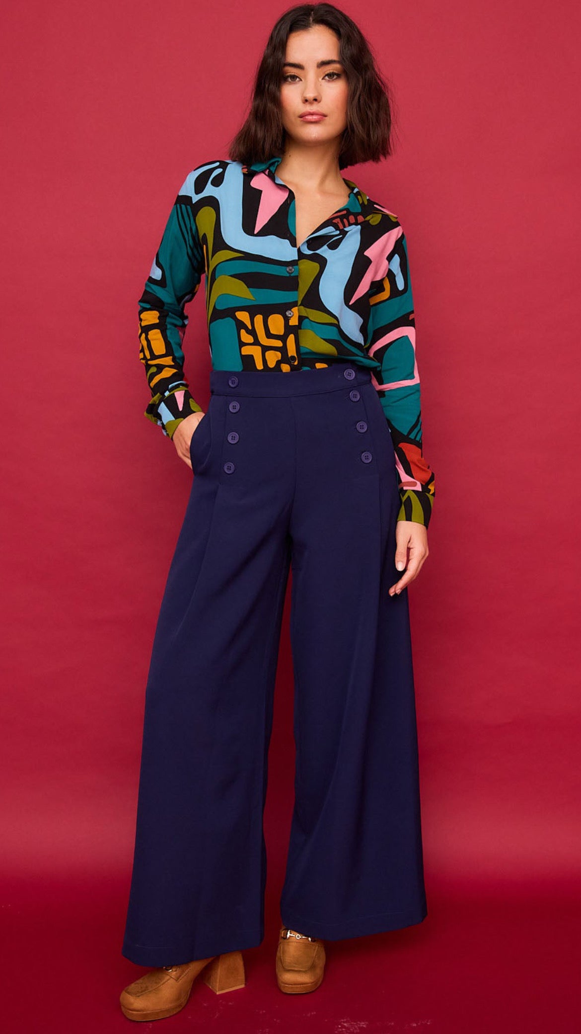 Pantalón ancho azul marino con doble botonadura decorativa en la parte frontal y goma elástica en la cintura trasera para mayor comodidad. Con un diseño elegante de corte amplio y movimiento fluido, este pantalón es perfecto para darle un aire sofisticado y chic a tus looks de diario o de oficina.