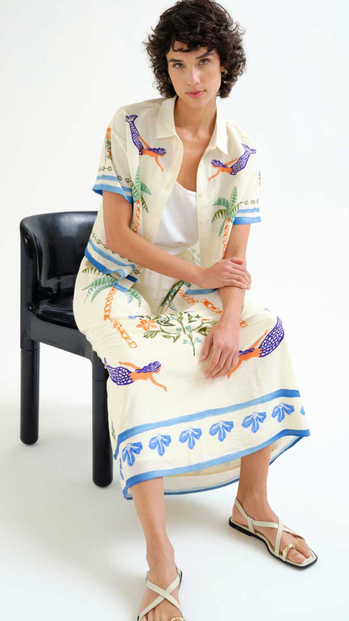 ✨ Falda larga con estampado Palm & Mermaid, una combinación única de motivos tropicales y elementos ilustrados que aportan un aire artístico y veraniego.
