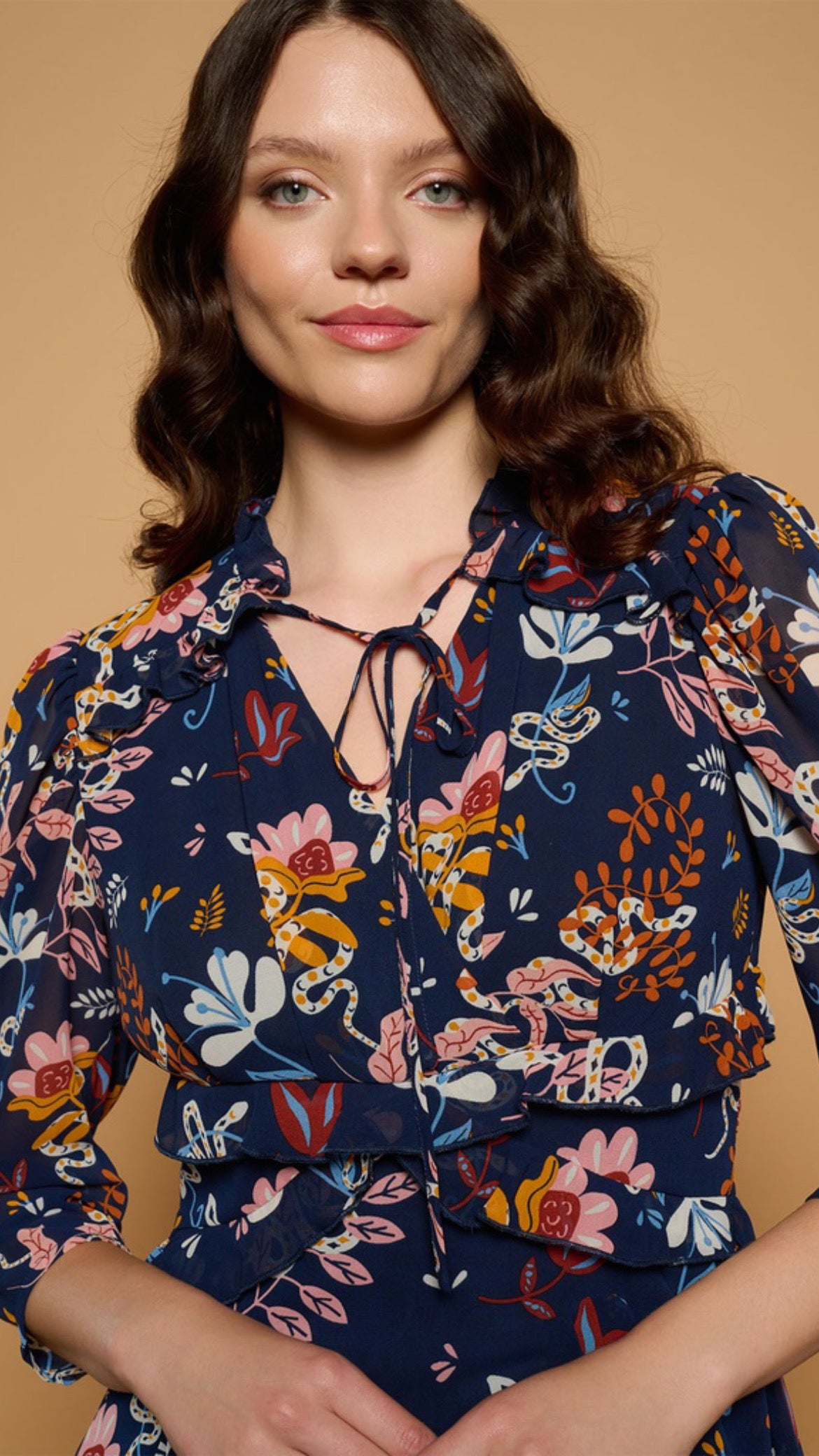 Vestido midi estampado floral en tono azul marino, con escote en pico y manga francesa. Diseño femenino con cinturón a juego que realza la cintura y falda fluida con bajo asimétrico que aporta movimiento y ligereza. Confeccionado en tejido ligero y vaporoso, ideal para eventos, invitadas o looks especiales de día y noche.